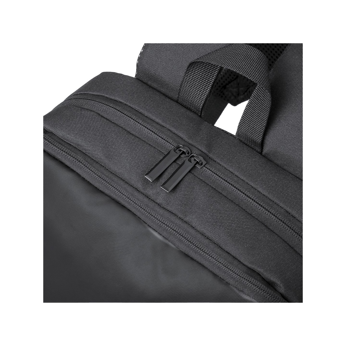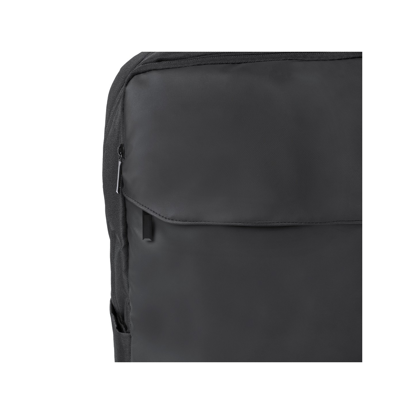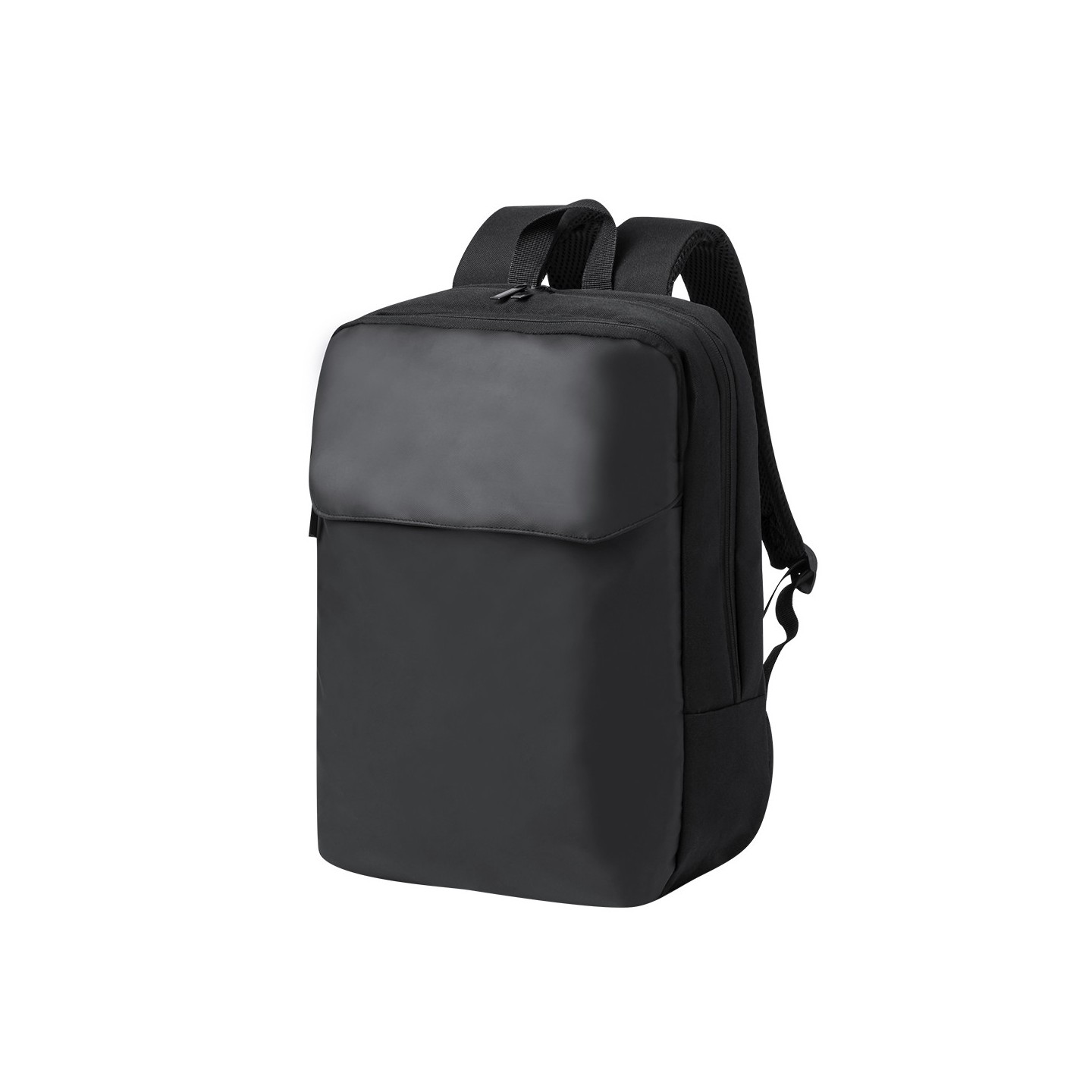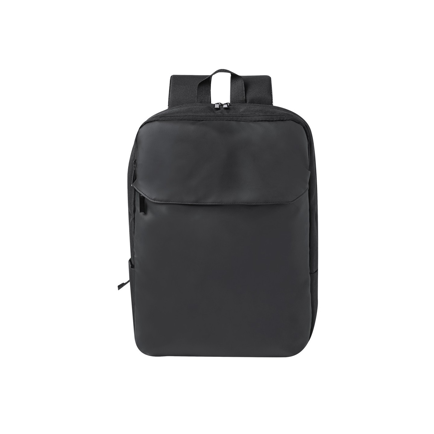 Mochila confeccionada en elegante polipiel. De diseño urbano que incluye un bolsillo central acolchado con doble cierre para tablet de hasta 10 pulgadas y portátil de hasta 15 pulgadas, así como un bolsillo segundario. Además, tiene un bolsillo frontal con cremallera y solapa protectora. Las cintas de hombros y la espalda son acolchadas, ajustables y cuentan con una tela transpirable. Incorpora un accesorio para ajustarse al trolley y una cómoda asa en la parte superior. Presentada en una bolsa individual reciclada.