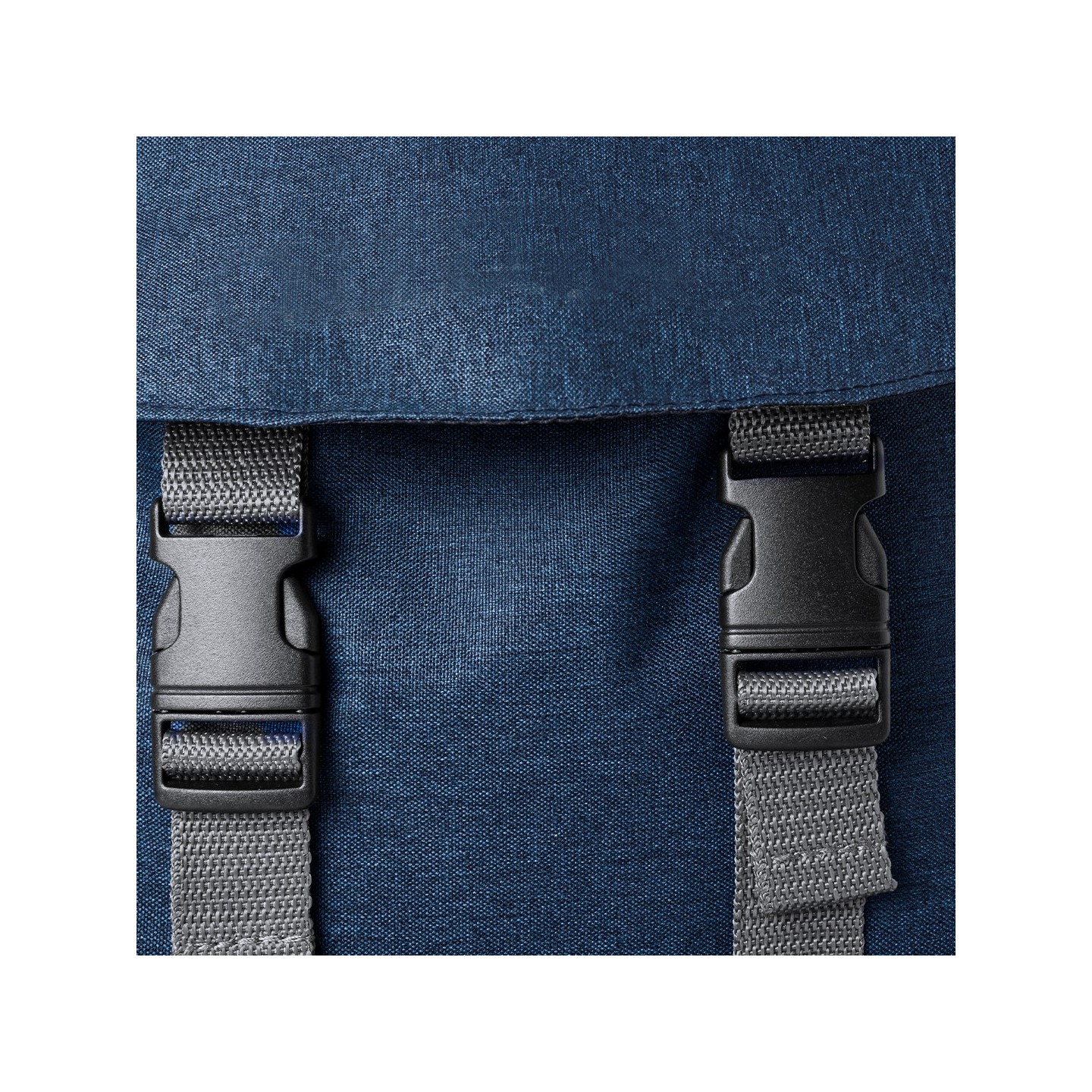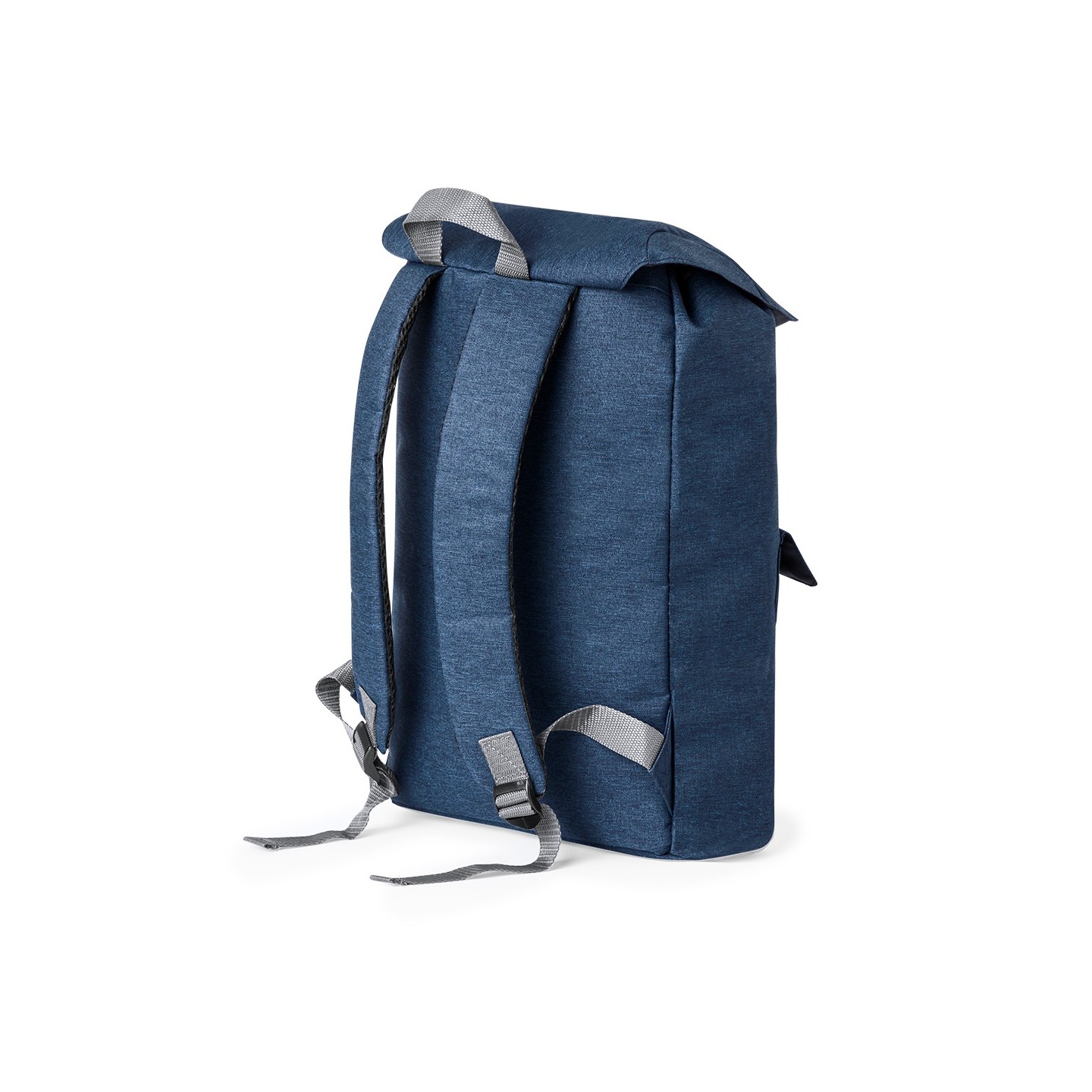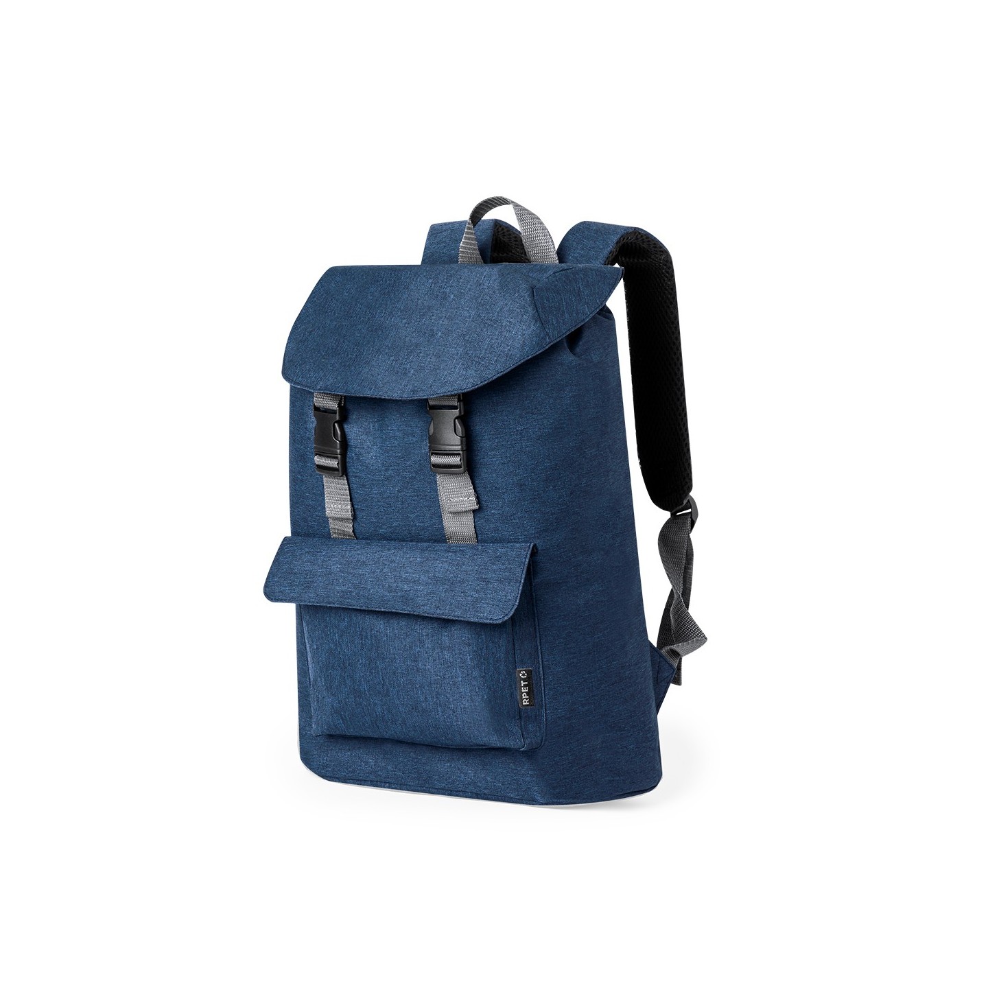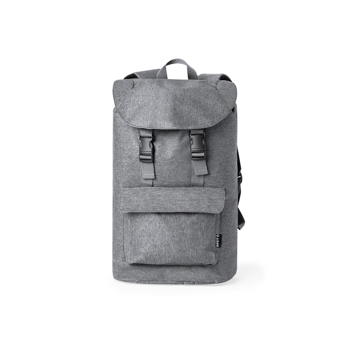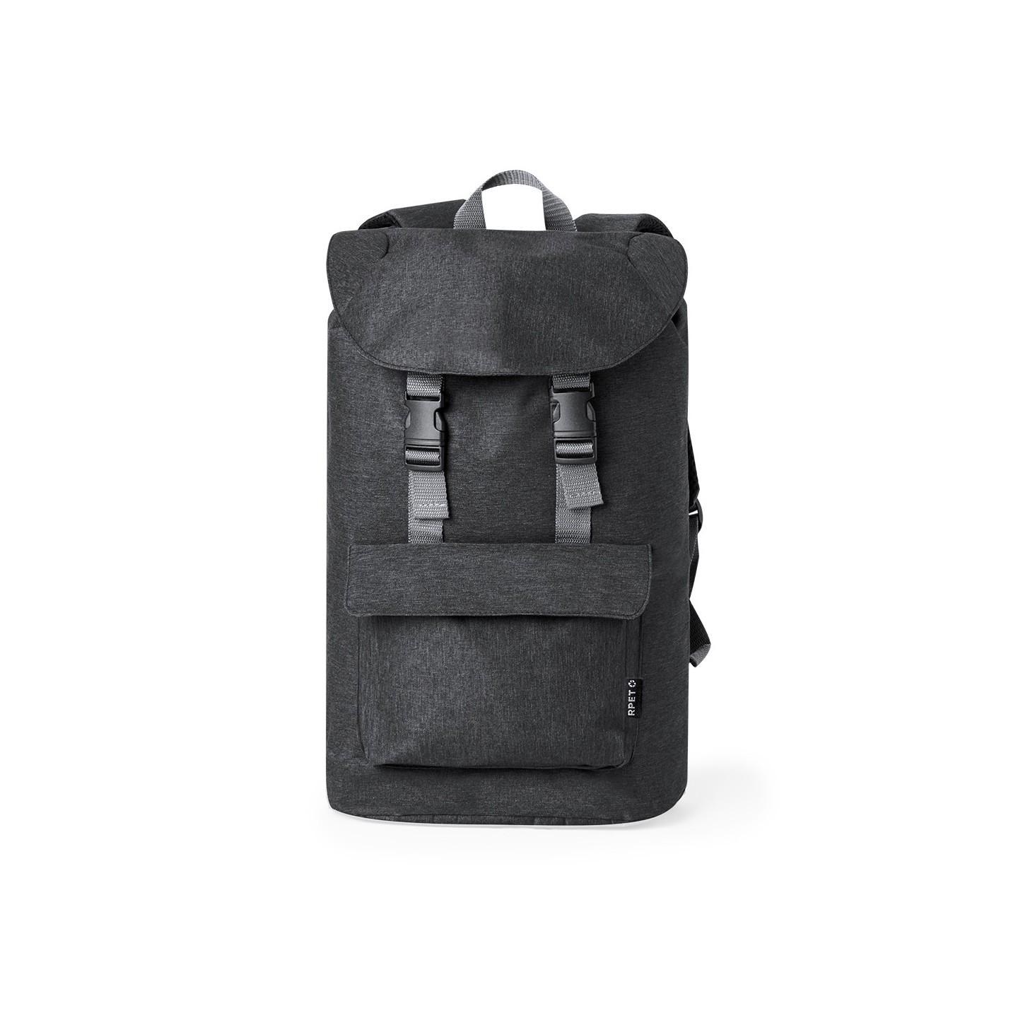 Mochila fabricada en resistente 600D RPET. El bolsillo principal se cierra con cordón y cuenta con una solapa con doble cierre, mientras que el bolsillo frontal tiene una solapa con cierre de velcro. Las cintas para los hombros son acolchadas y ajustables. Está disponible en varios colores y se presenta de manera individual en una bolsa reciclada. Logotipo RPET en etiqueta exterior.