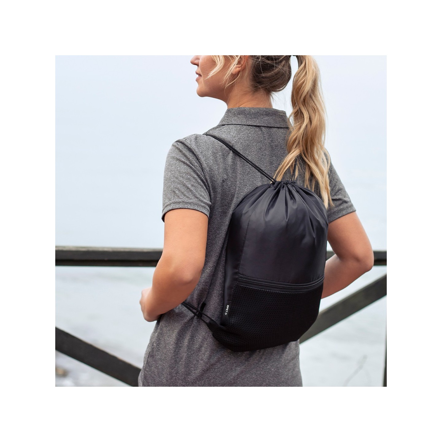 La Mochila Uznam está confeccionada en suave poliéster RPET 210D, un material innovador que ofrece durabilidad y resistencia, mientras contribuye al cuidado del medio ambiente. Las cuerdas de autocierre negras, con argollas de tela, aseguran un cierre seguro y cómodo, ideal para llevar tus pertenencias de manera práctica y segura.