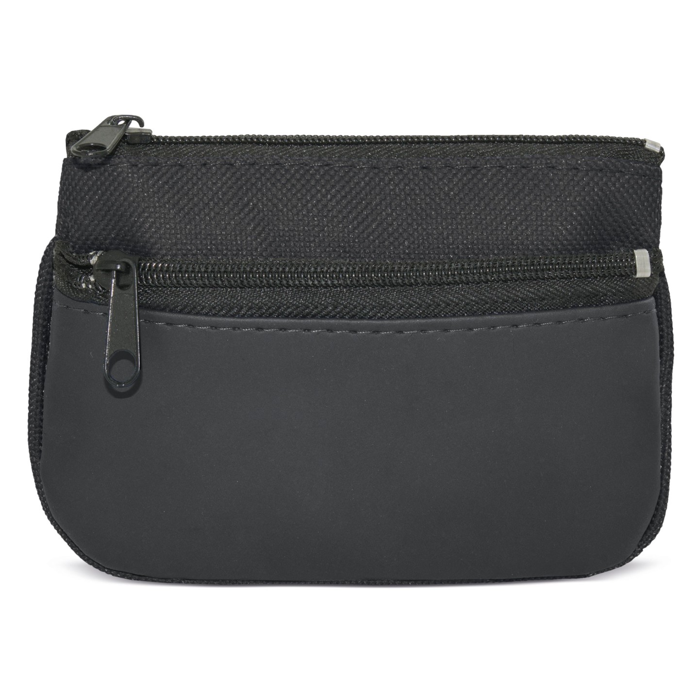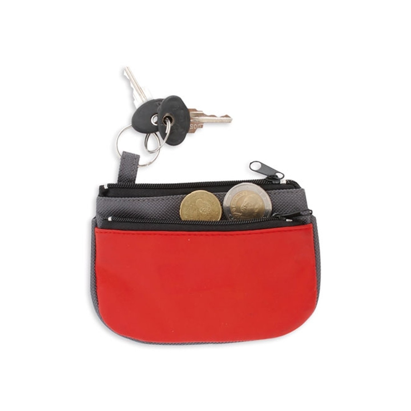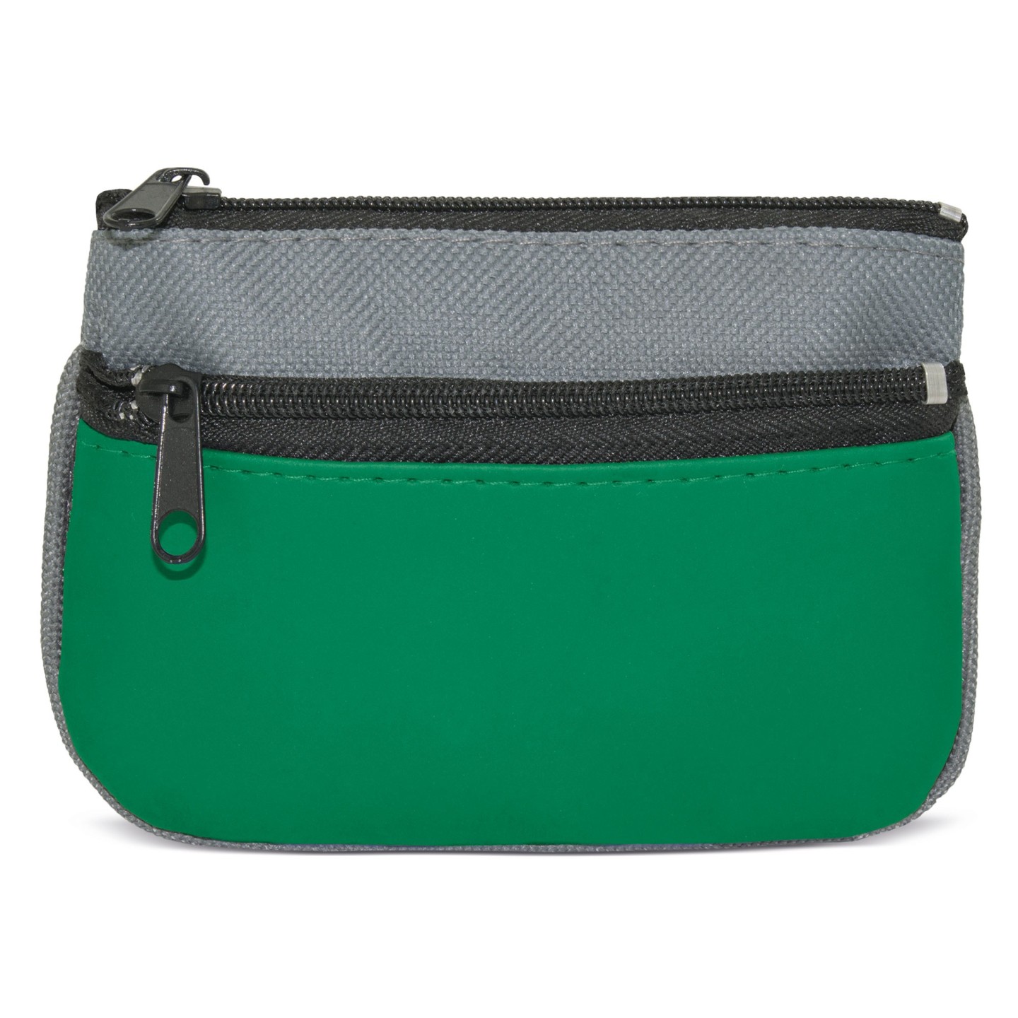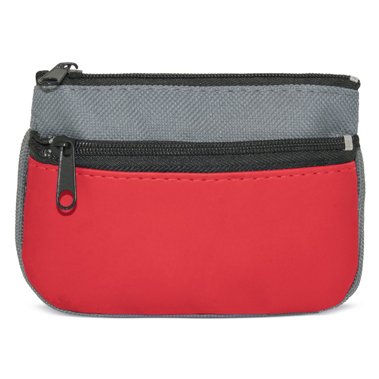 Monedero bicolor con 2 cremalleras, fabricado en PVC y nylon 610D. Resistente, práctico y disponible en varios colores. Ideal para organizar monedas y llaves, personalizable con logotipo.