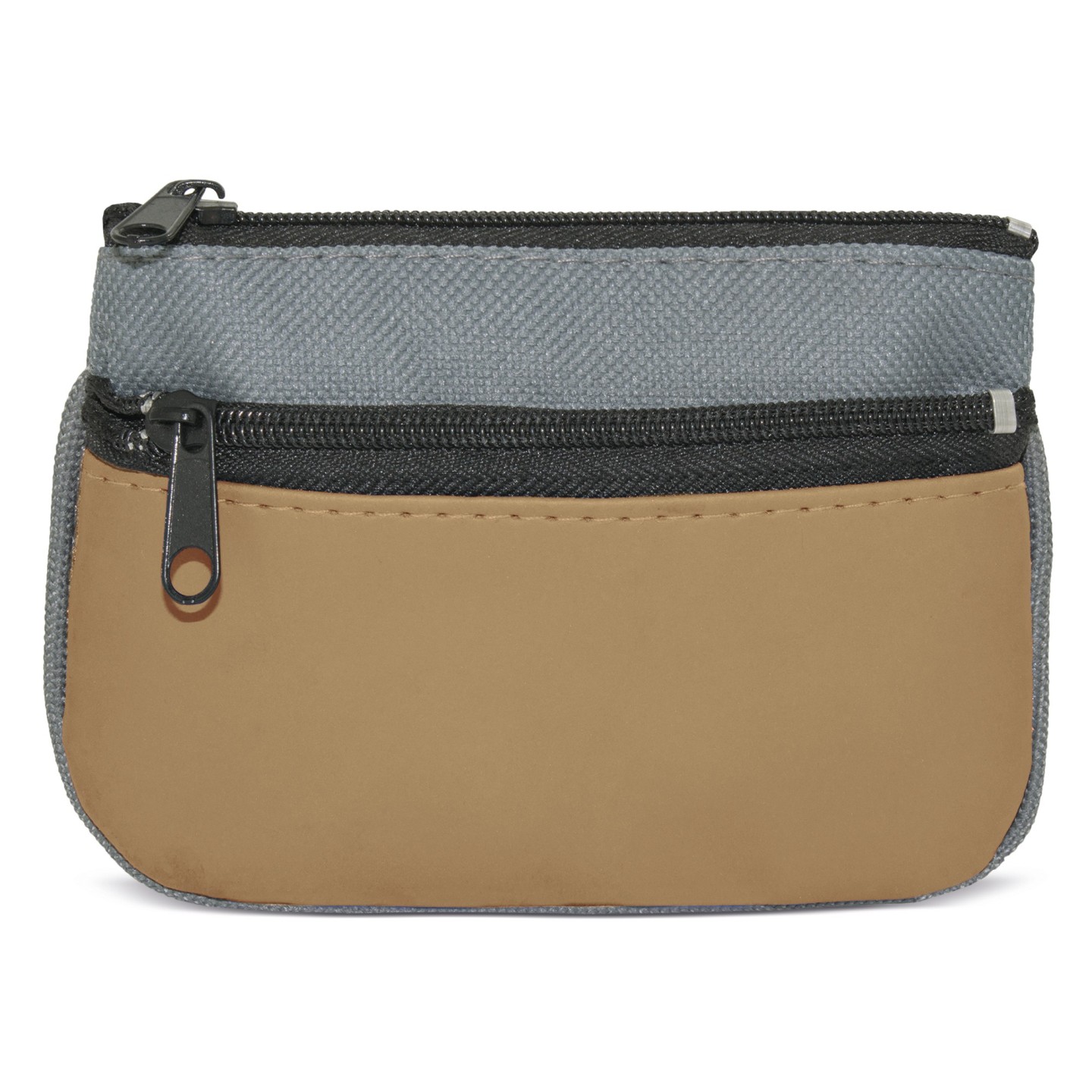Su diseño bicolor destaca por una parte superior en color gris y una inferior disponible en una amplia gama de colores, lo que permite adaptarlo a distintos gustos y estilos. Cuenta con dos compartimentos con cierre de cremallera negra, ideales para organizar monedas, llaves u otros pequeños objetos de valor de forma segura y accesible.