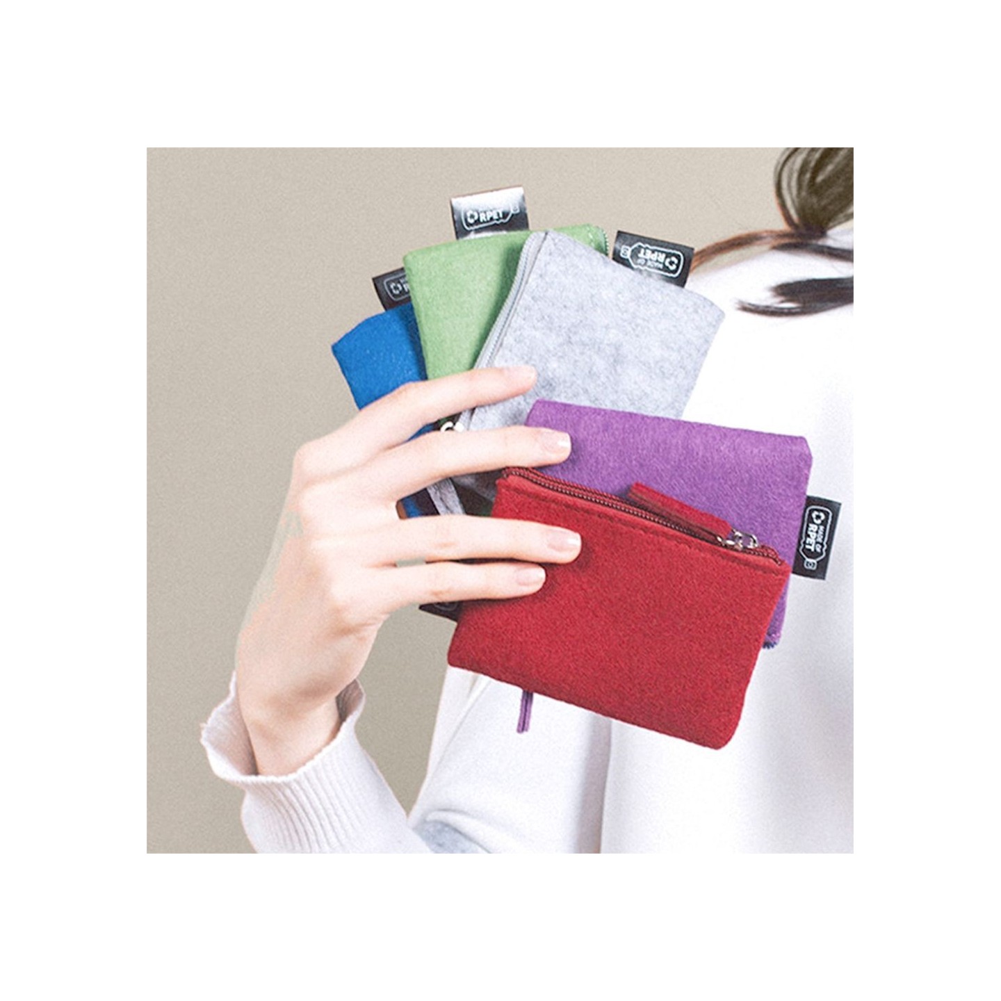 El Monedero Rover es sostenible y funcional, fabricado en fieltro 100% RPET. Medidas: 10,5 X 8 cm. Ideal para llevar tus esenciales con estilo.