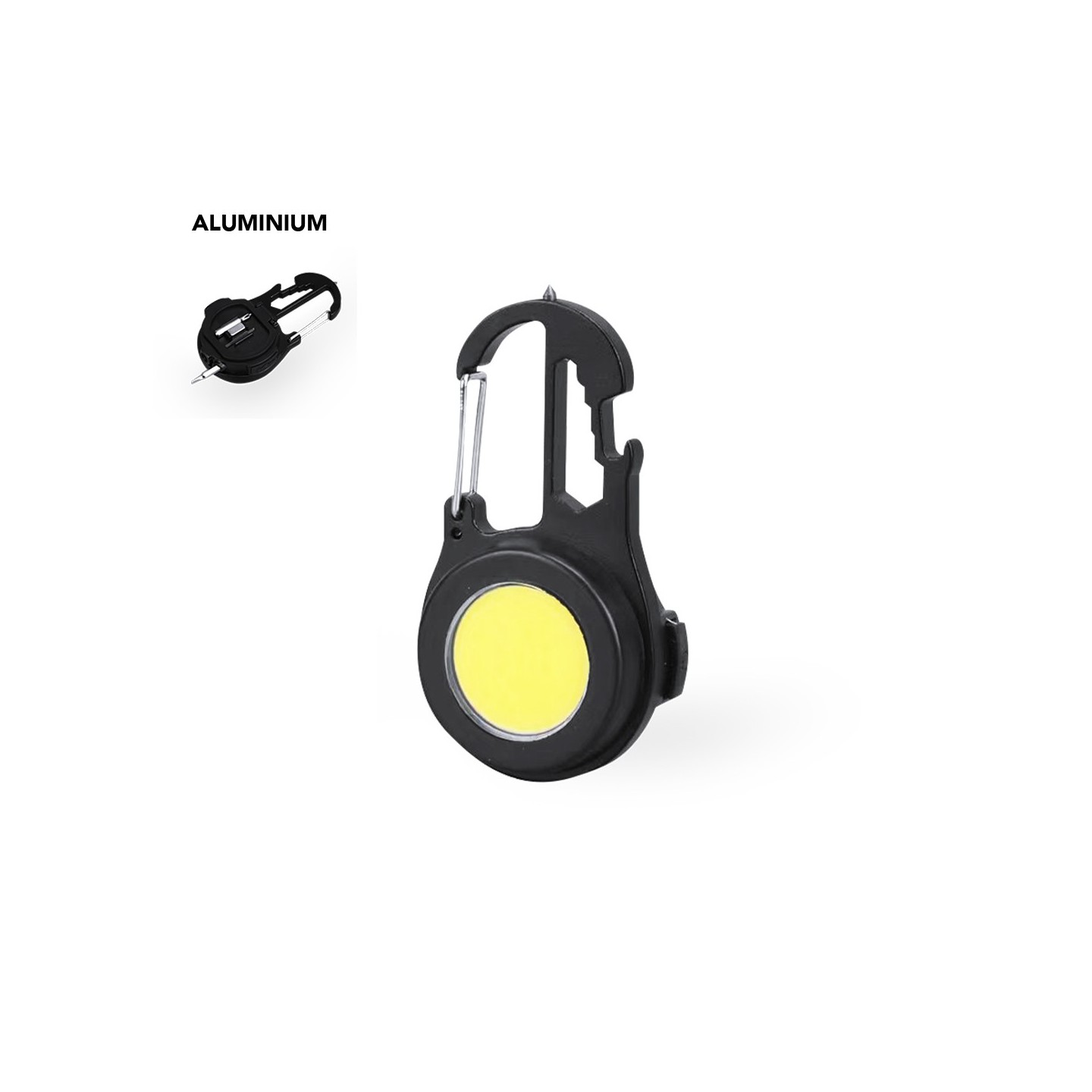 Para facilitar su transporte, esta multiherramienta viene equipada con un práctico mosquetón de enganche y un soporte en la parte trasera. Además, se incluye un cable de carga para recargar la batería de 500 mAh, asegurando una larga duración.