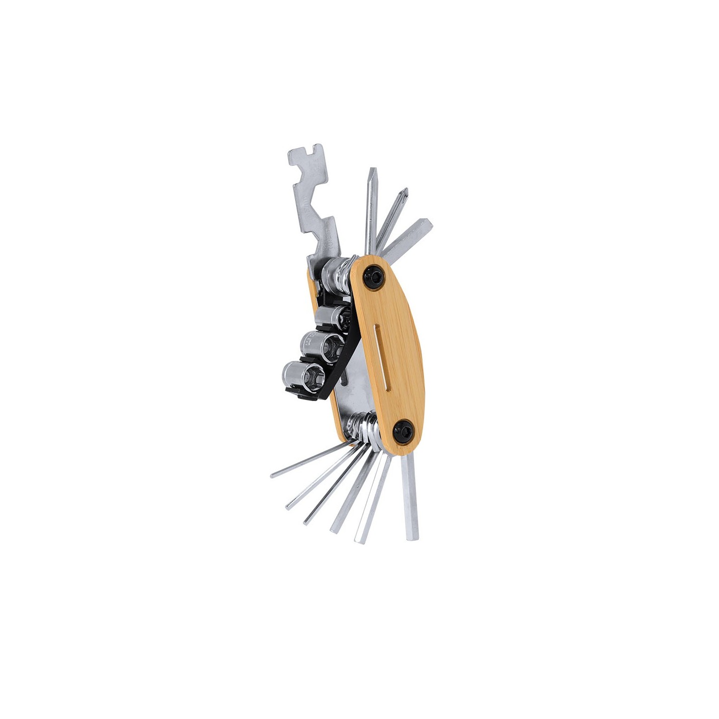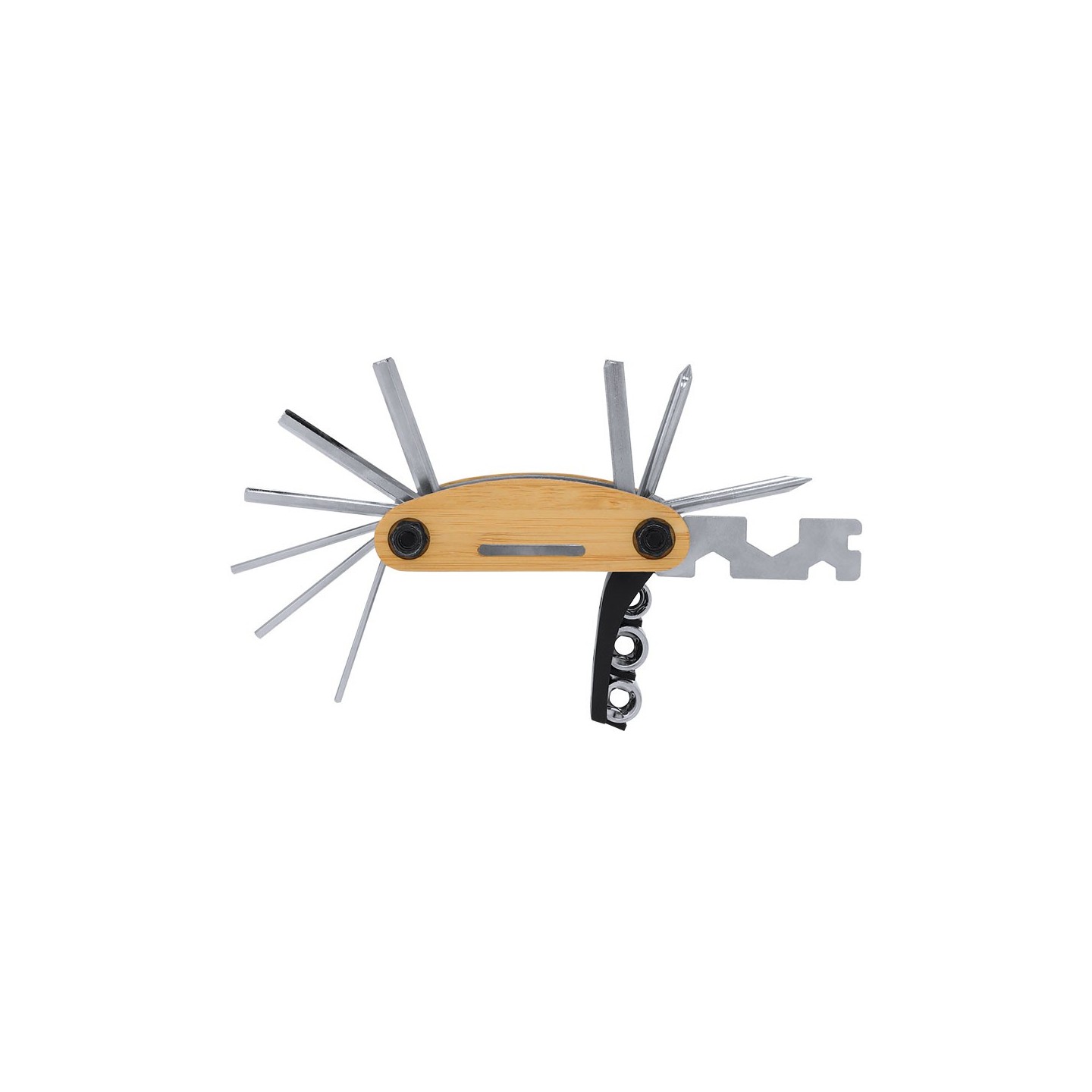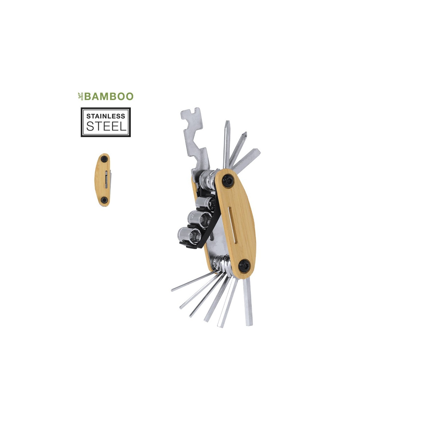 Multiherramienta KORON en acero inoxidable y bambú, con 15 funciones. Compacta, ligera y personalizable, ideal para empresas y regalos promocionales.