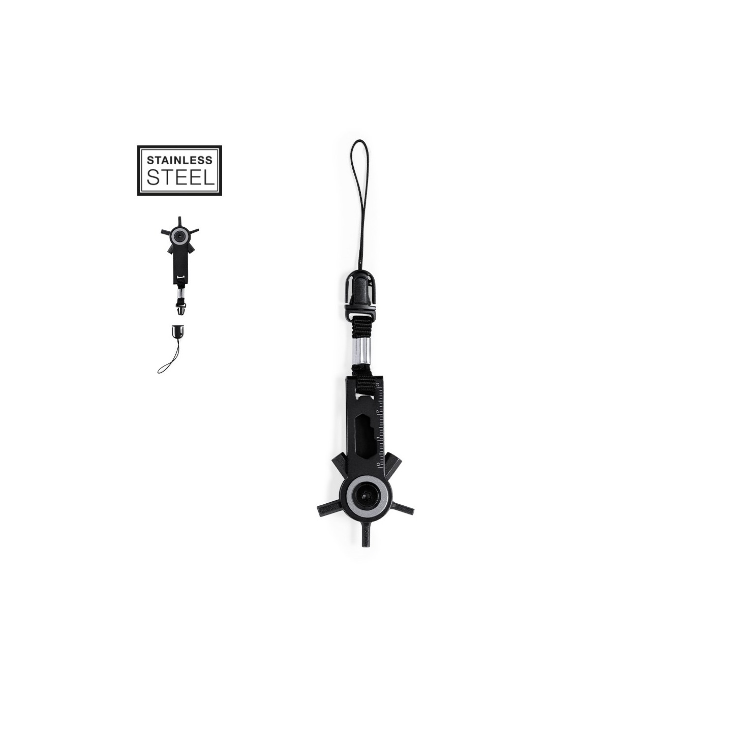 Esta eficaz multiherramienta está diseñada para satisfacer una variedad de necesidades, fabricada en acero inoxidable con un acabado negro que le otorga un aspecto moderno y profesional.