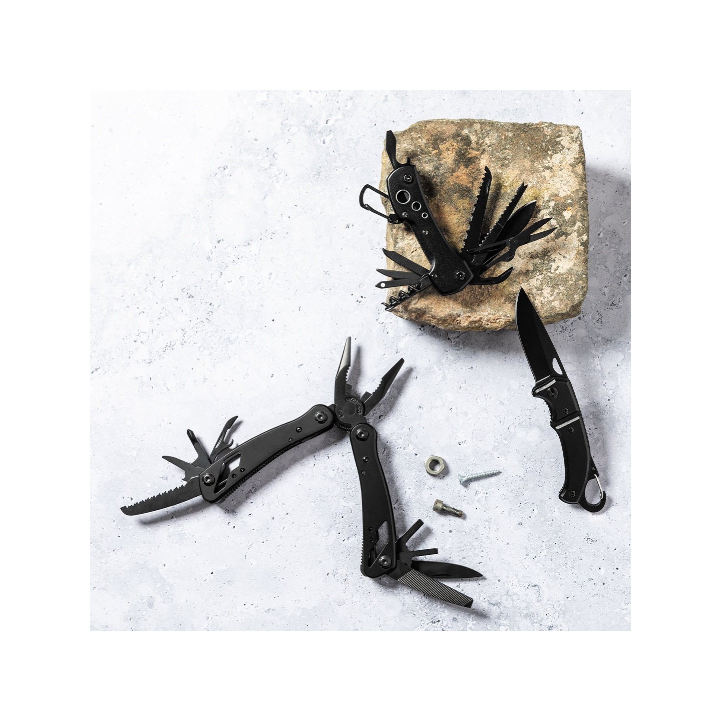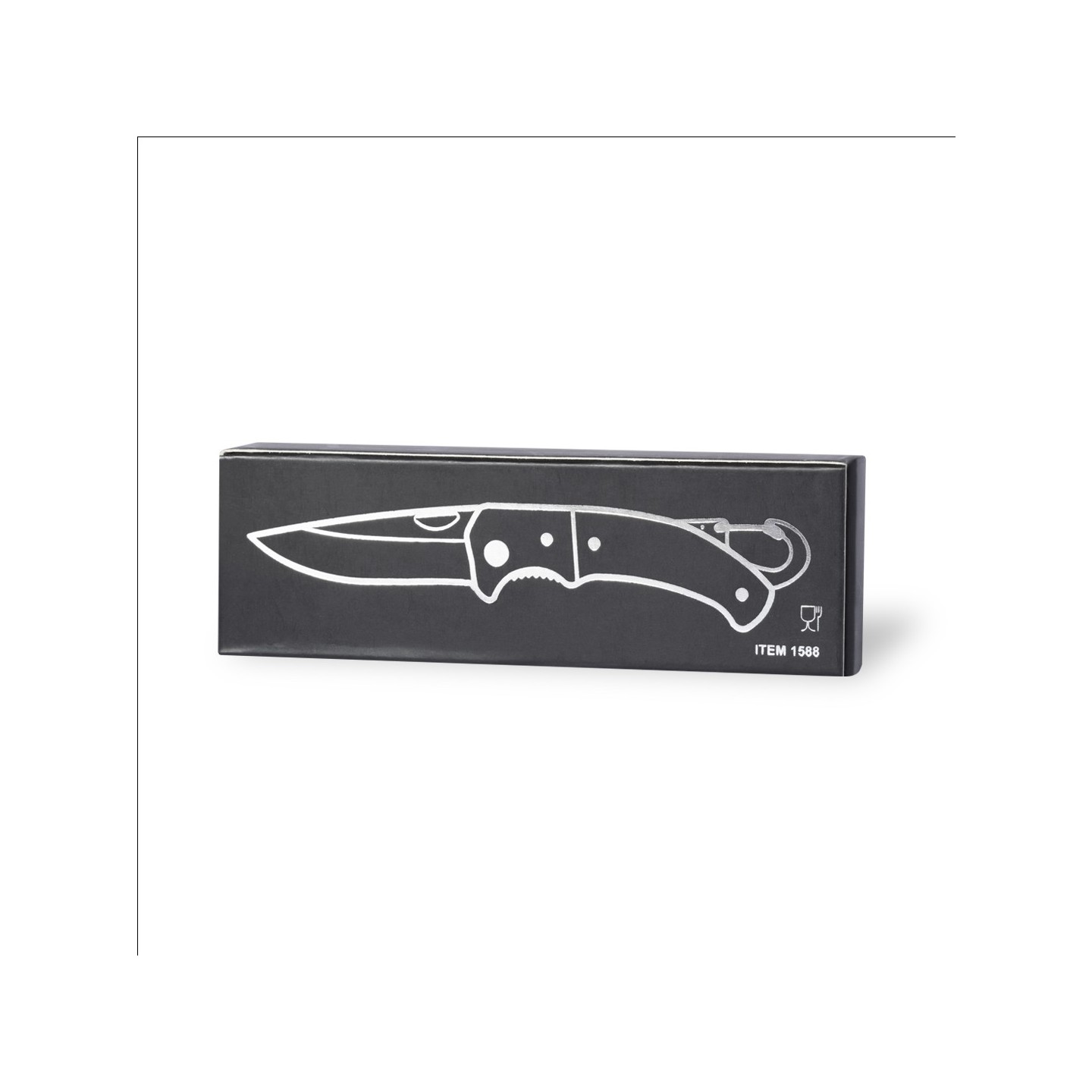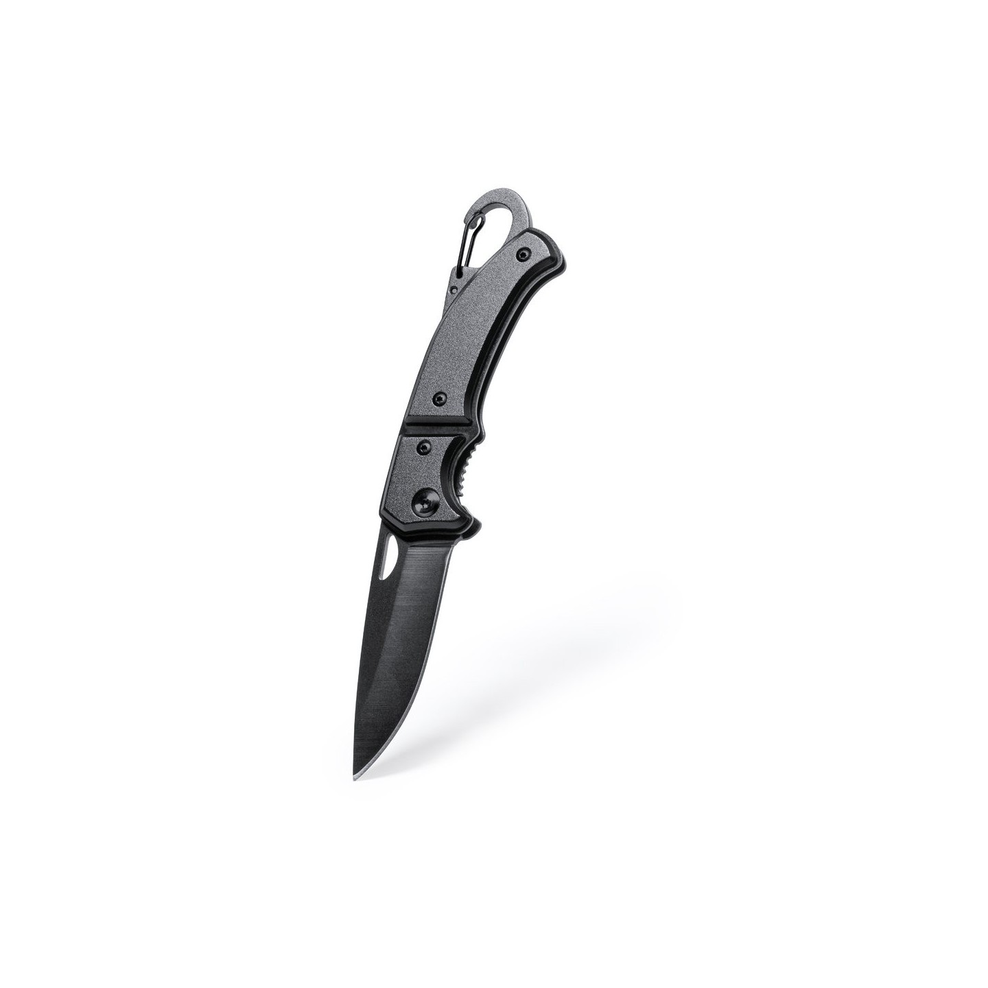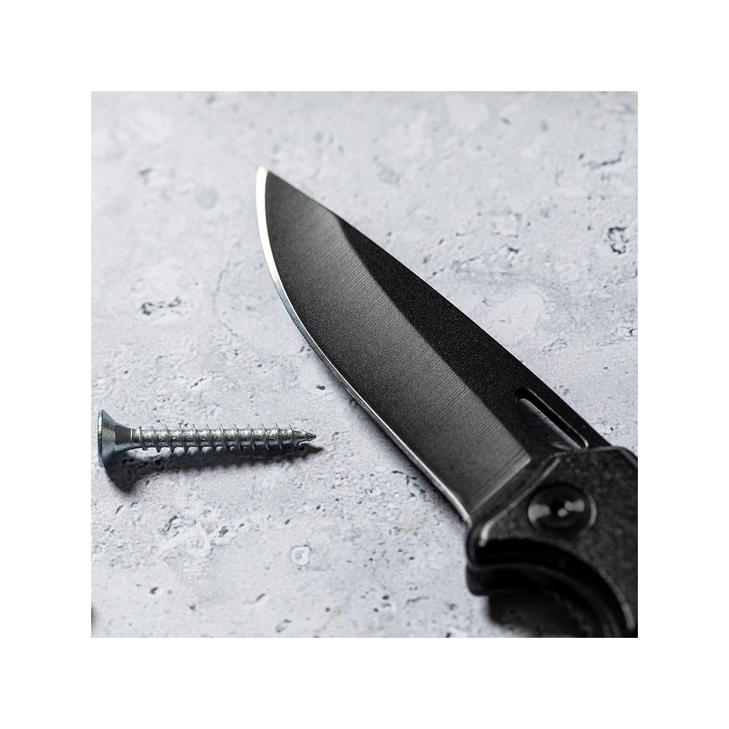 La hoja en acero inoxidable de acabado negro no solo añade un toque moderno y elegante, sino que también garantiza una durabilidad a largo plazo y un rendimiento excepcional en cada uso. El troquelado en la hoja permite una apertura rápida y sencilla, lo que se traduce en una herramienta lista para actuar en cualquier momento.