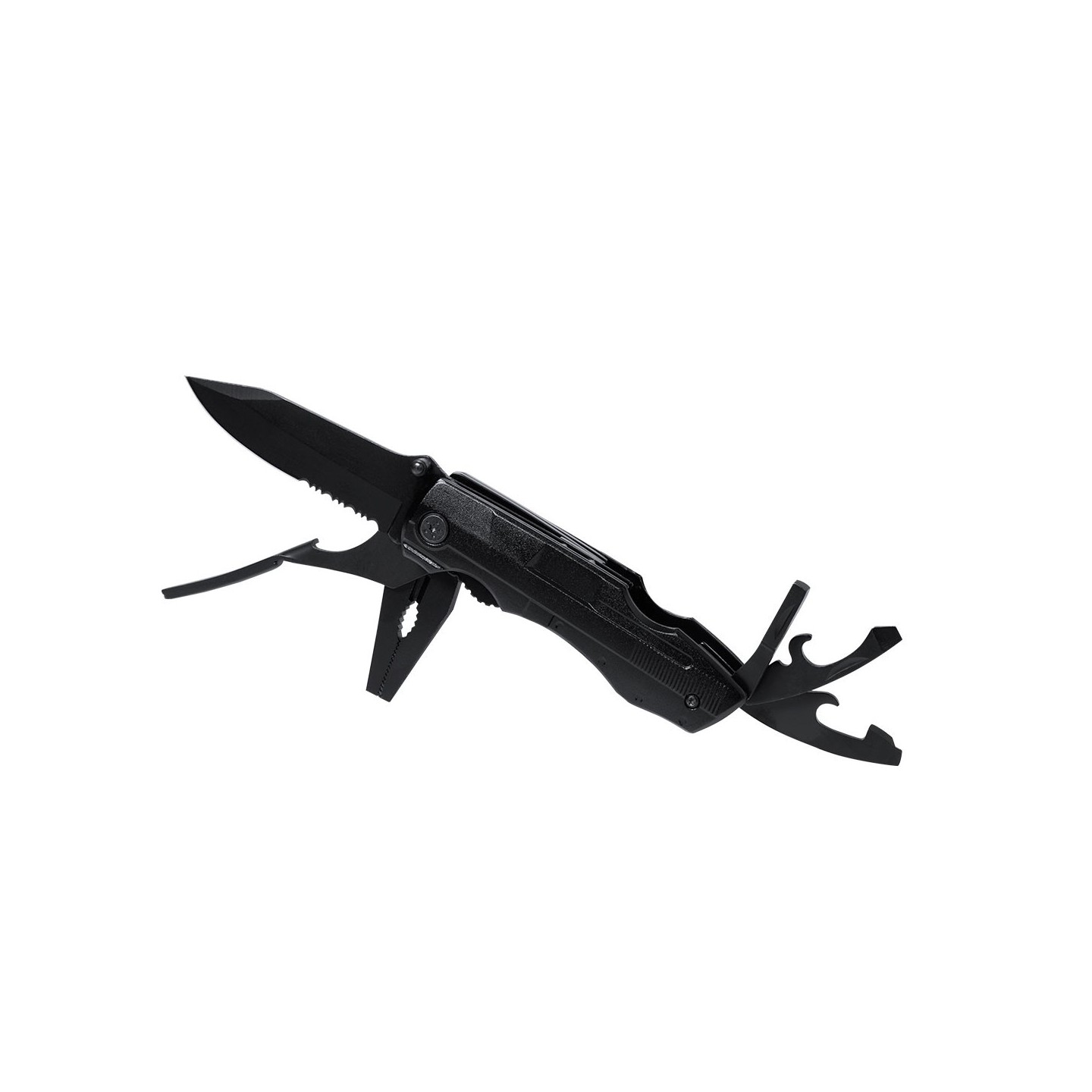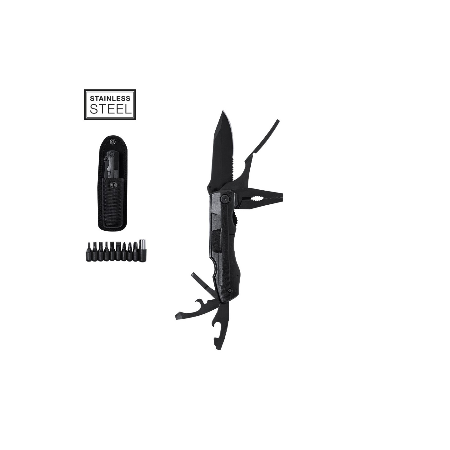 Navaja Multiusos ELIANA, compacta y personalizable, con 10 funciones como destornillador, cuchillo y alicates. Incluye estuche funda para cinturón.