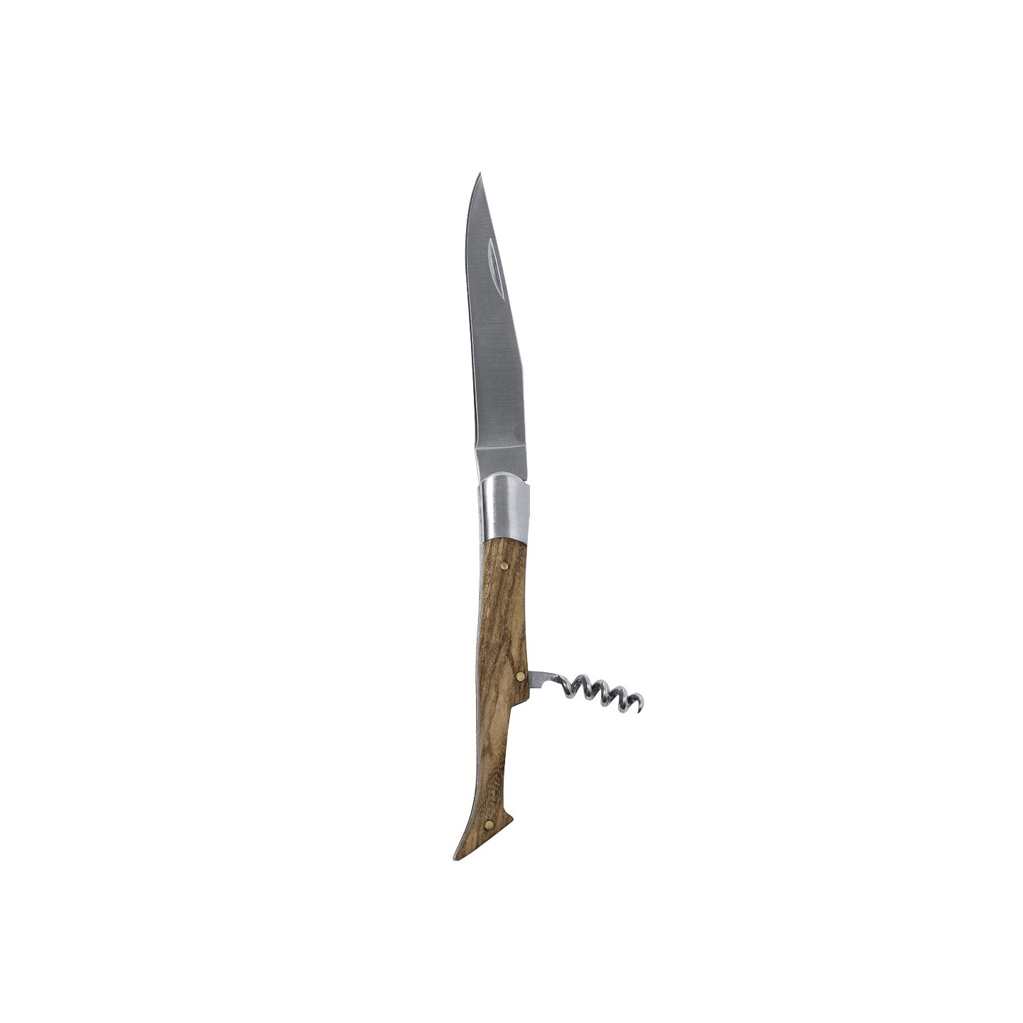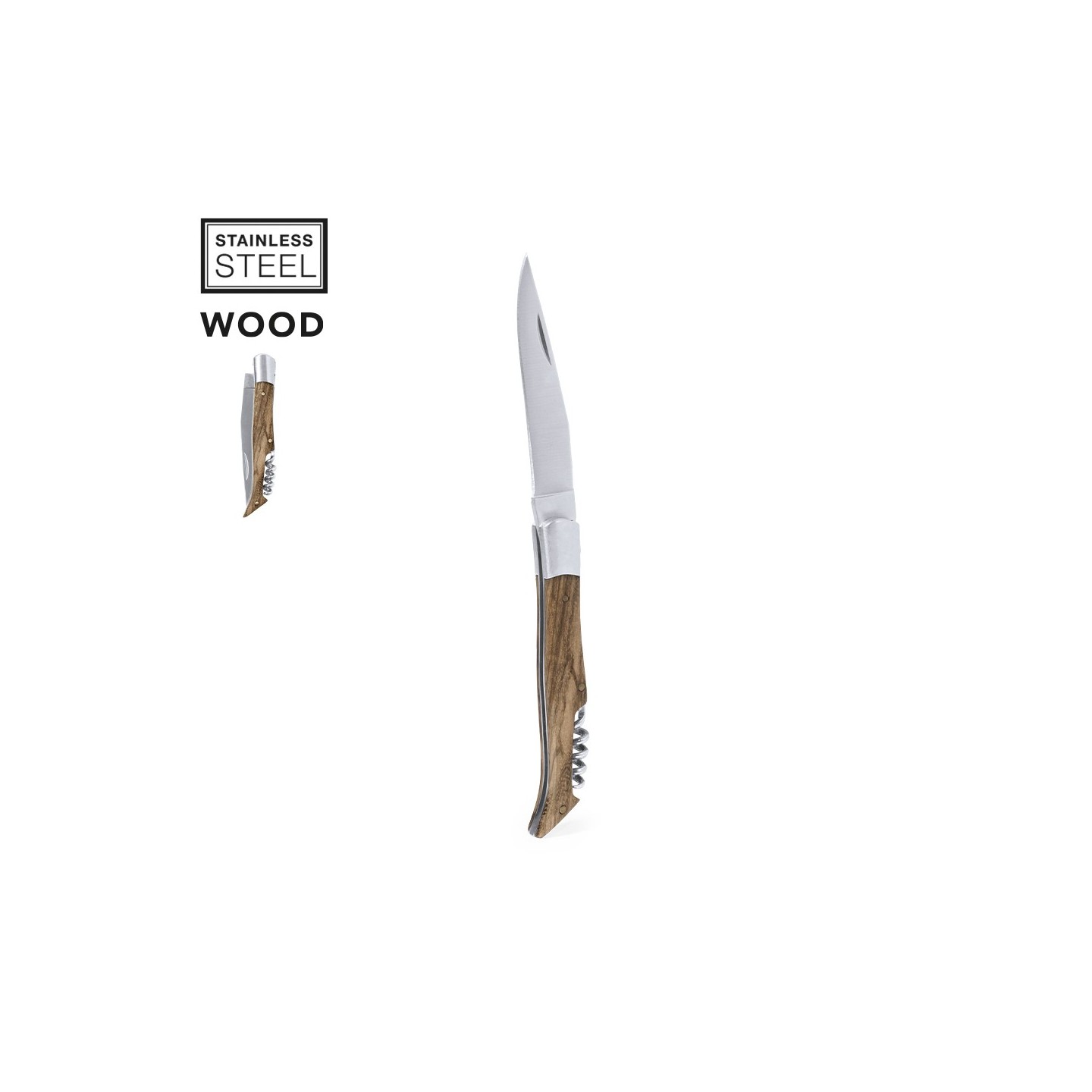 Construida con resistente acero inoxidable, esta navaja es sinónimo de durabilidad y rendimiento excepcional en cualquier situación. Su mango ergonómico fabricado en madera natural lacada proporciona un agarre cómodo y seguro, mientras que el sacacorchos integrado añade versatilidad a esta herramienta multifuncional.
