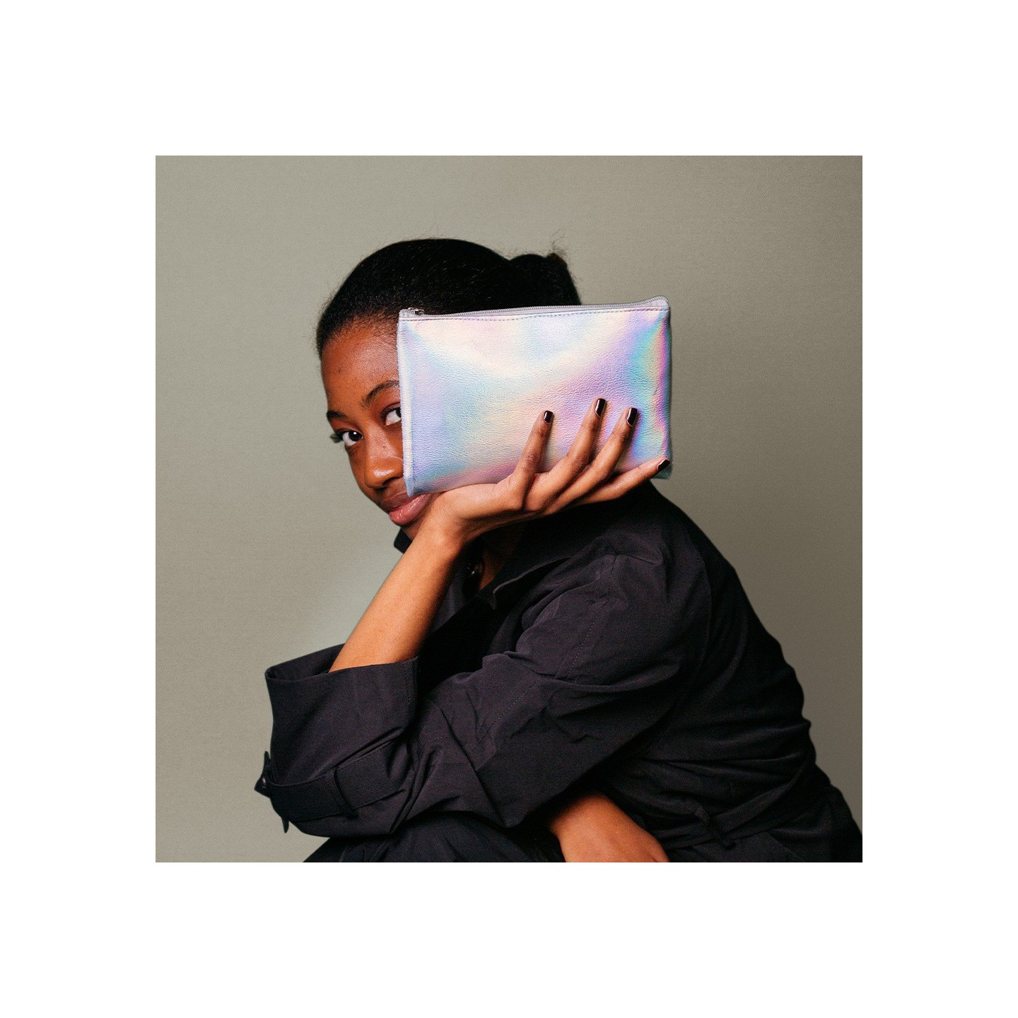 Neceser elegante BOREALIS en PU con acabado iridiscente, diseño moderno y tirador abrefácil. Personalizable con tu logotipo y libre de PVC.