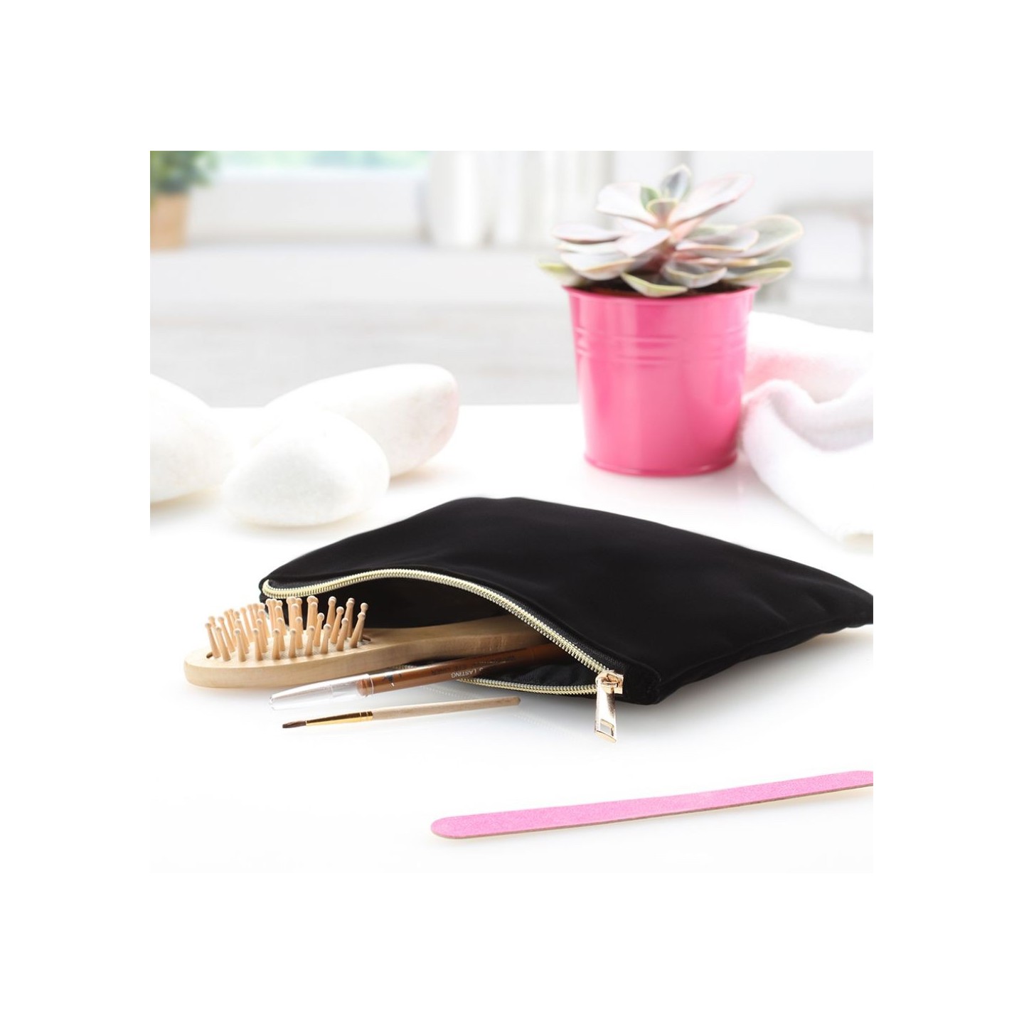 El Neceser Carpet es de terciopelo, forro interior, tirador dorado. Lujo y funcionalidad en cada detalle. Libre de PVC.