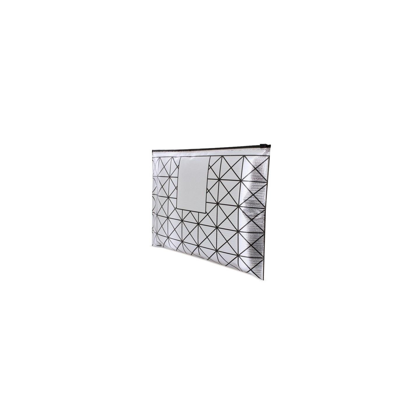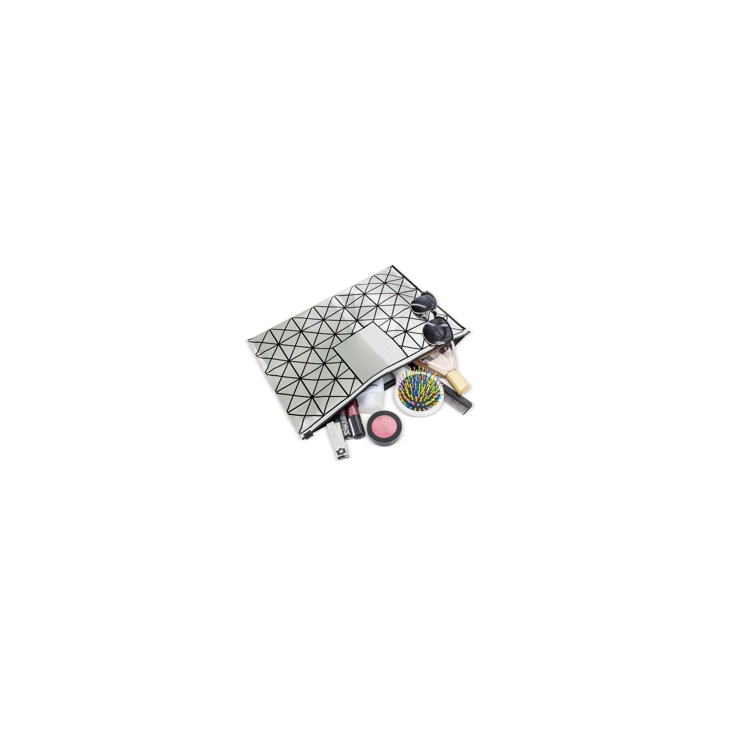 Este neceser se distingue por su diseño geométrico moderno, que lo convierte en un accesorio único. Además, dispone de una reserva de espacio en la parte superior de sus caras, perfecta para la grabación de tu publicidad o logotipo, lo que lo hace ideal para promociones empresariales.