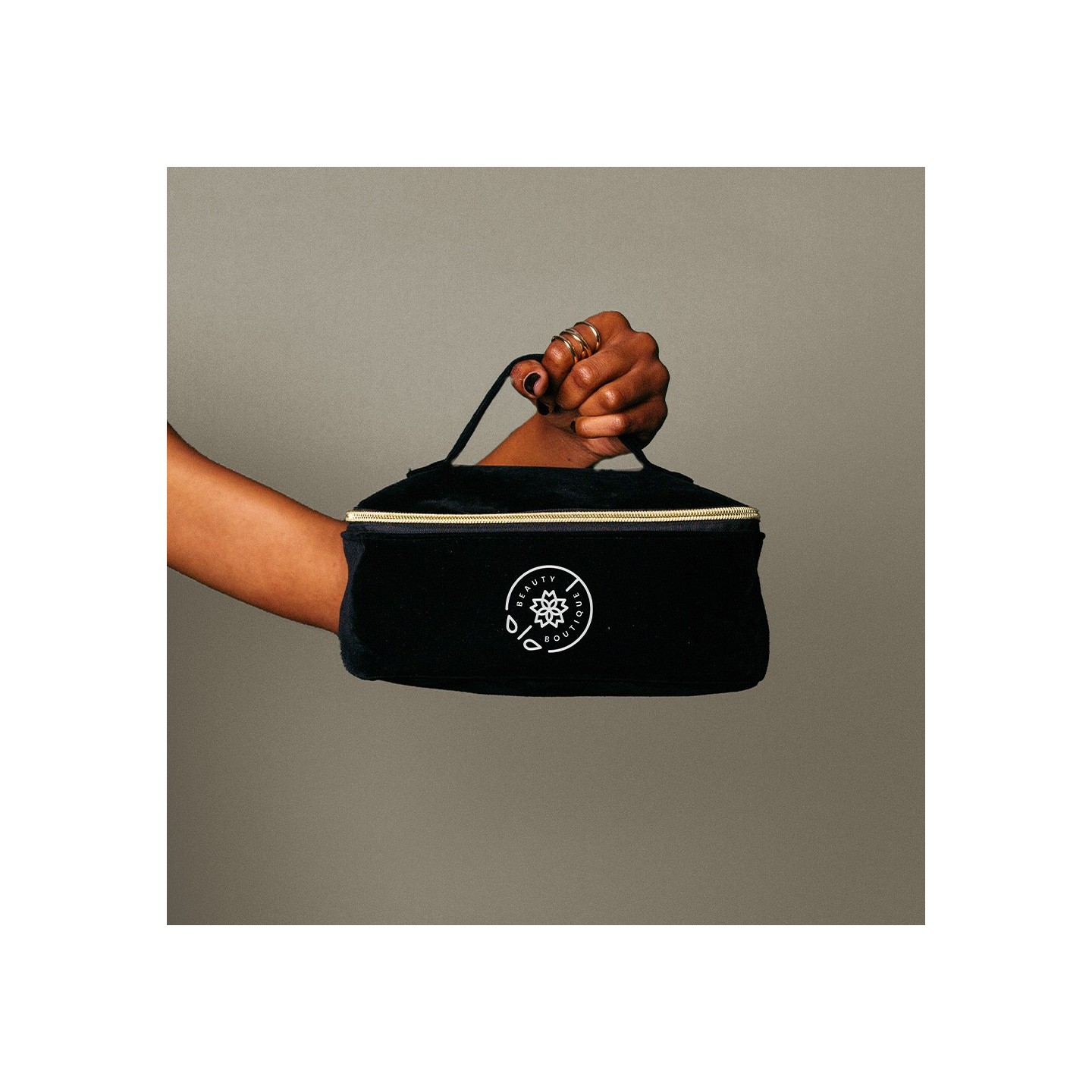 Neceser SIMONETTA en terciopelo de poliéster 280 gr/m², con cremallera dorada y asa. Elegante, libre de PVC y personalizable con tu logotipo.