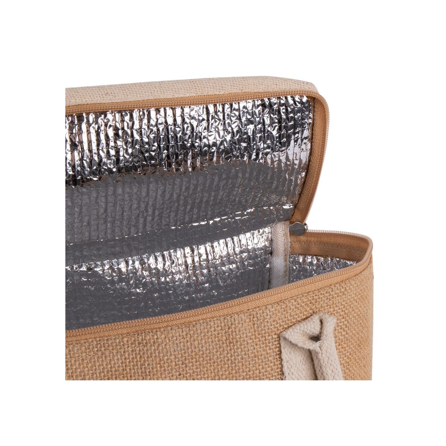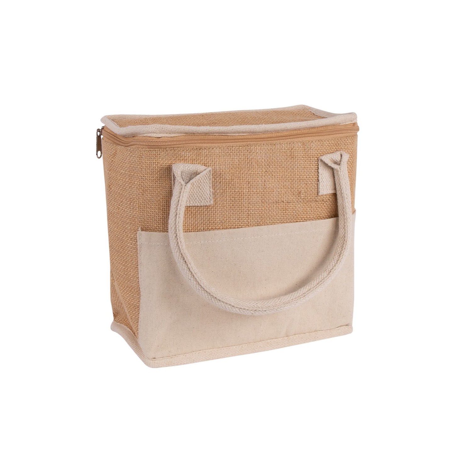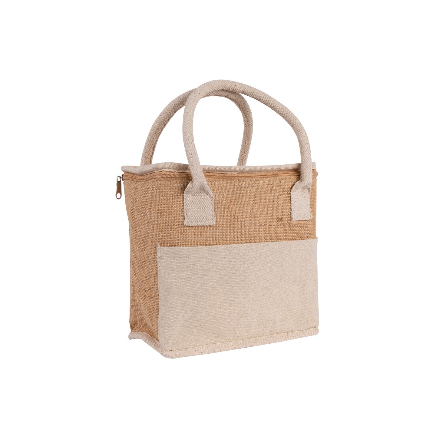 Nevera CALI ecológica y portátil, fabricada en jute y algodón canvas. Interior isotérmico, asas reforzadas en forma de arco y bolsillo frontal. Personalizable con logotipo.