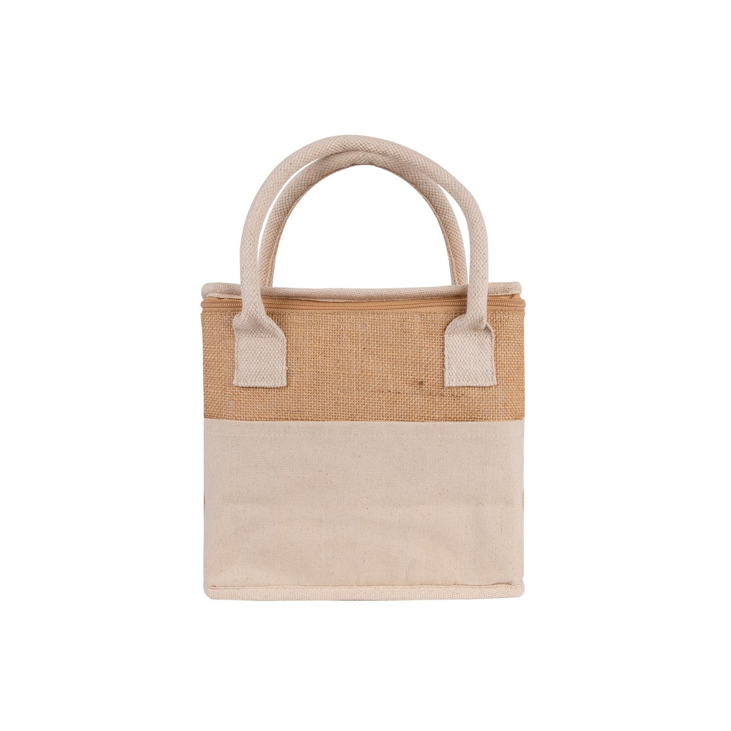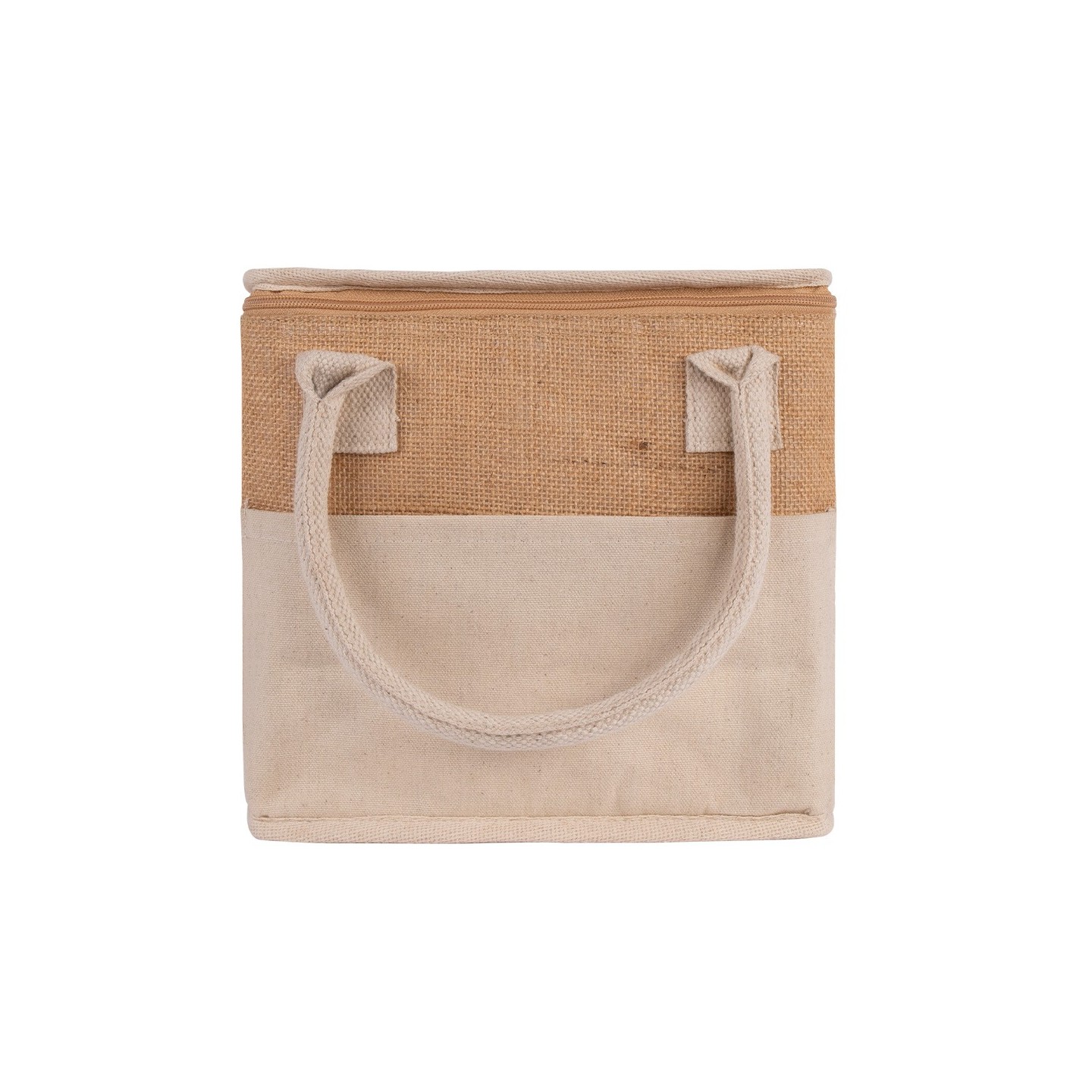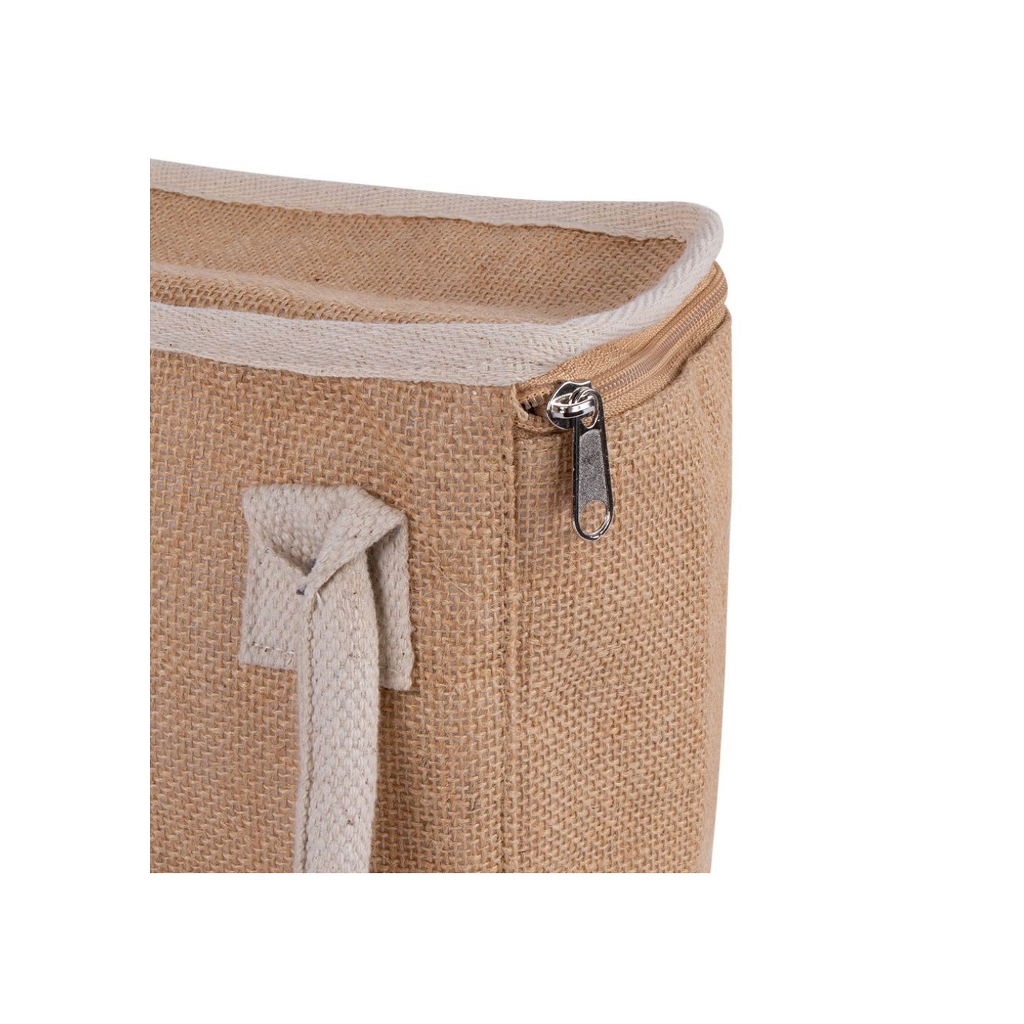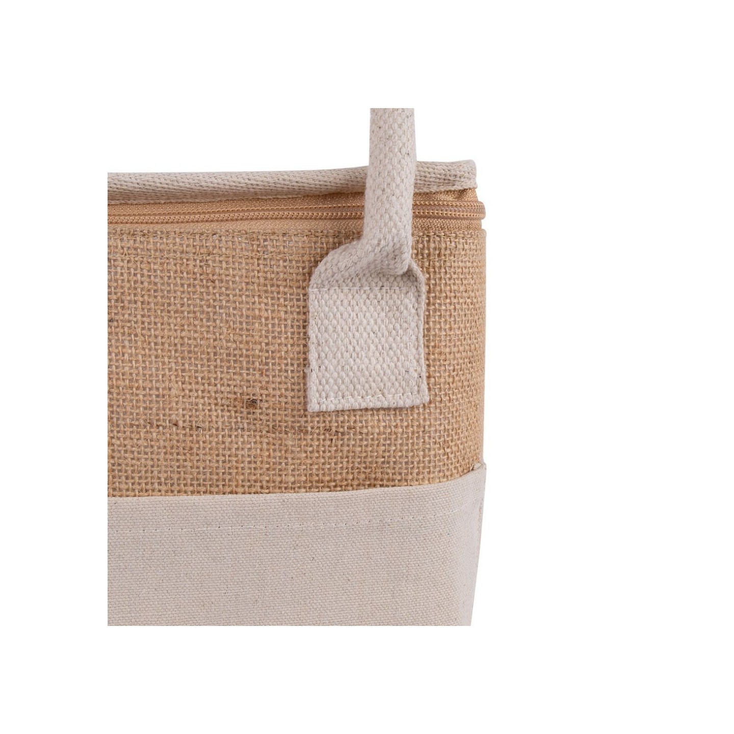 Nevera CALI ecológica y portátil, fabricada en jute y algodón canvas. Interior isotérmico, asas reforzadas en forma de arco y bolsillo frontal. Personalizable con logotipo.