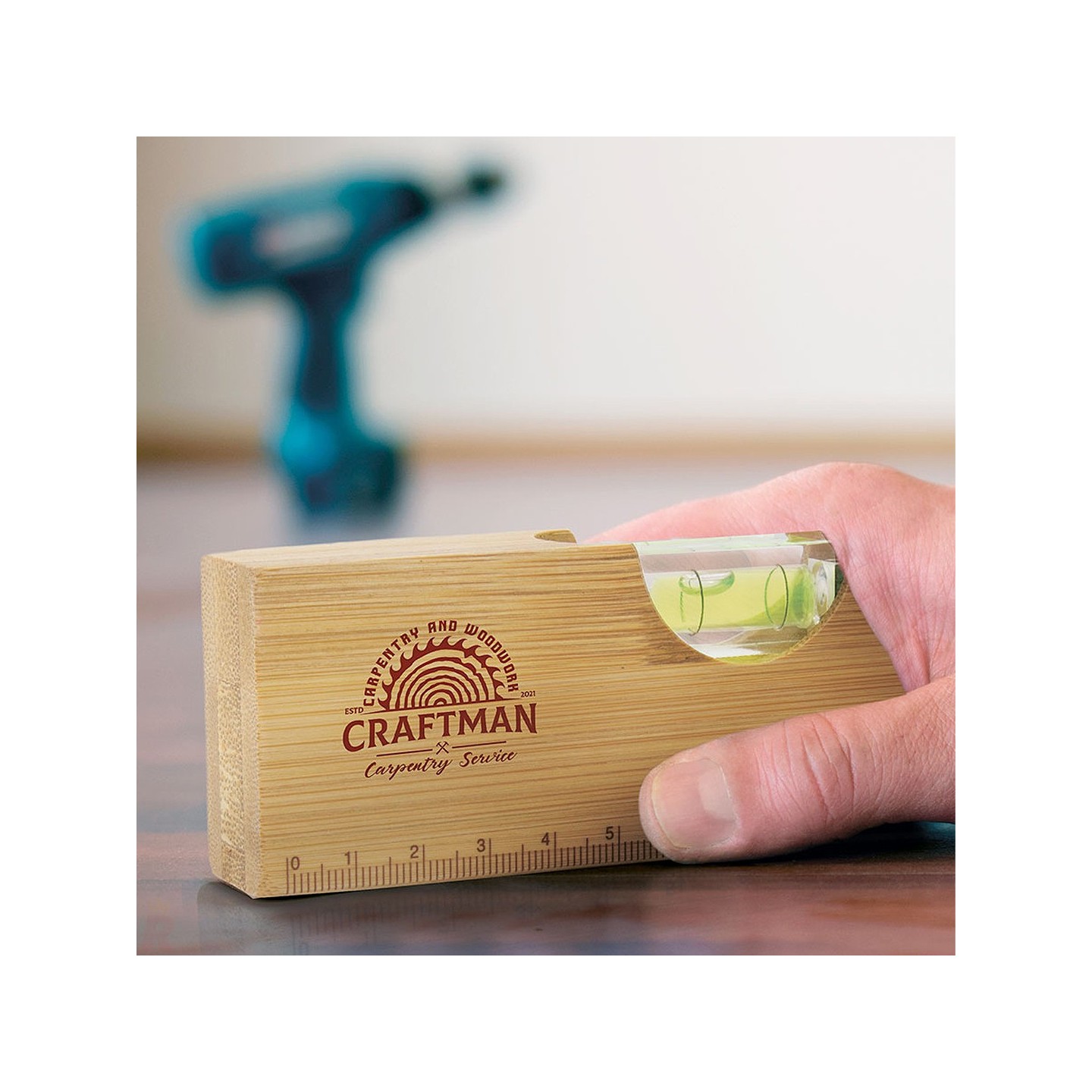 Nivel de burbuja multifuncional con abrebotellas y regla integrada. Fabricado en bambú sostenible, combina estilo y utilidad