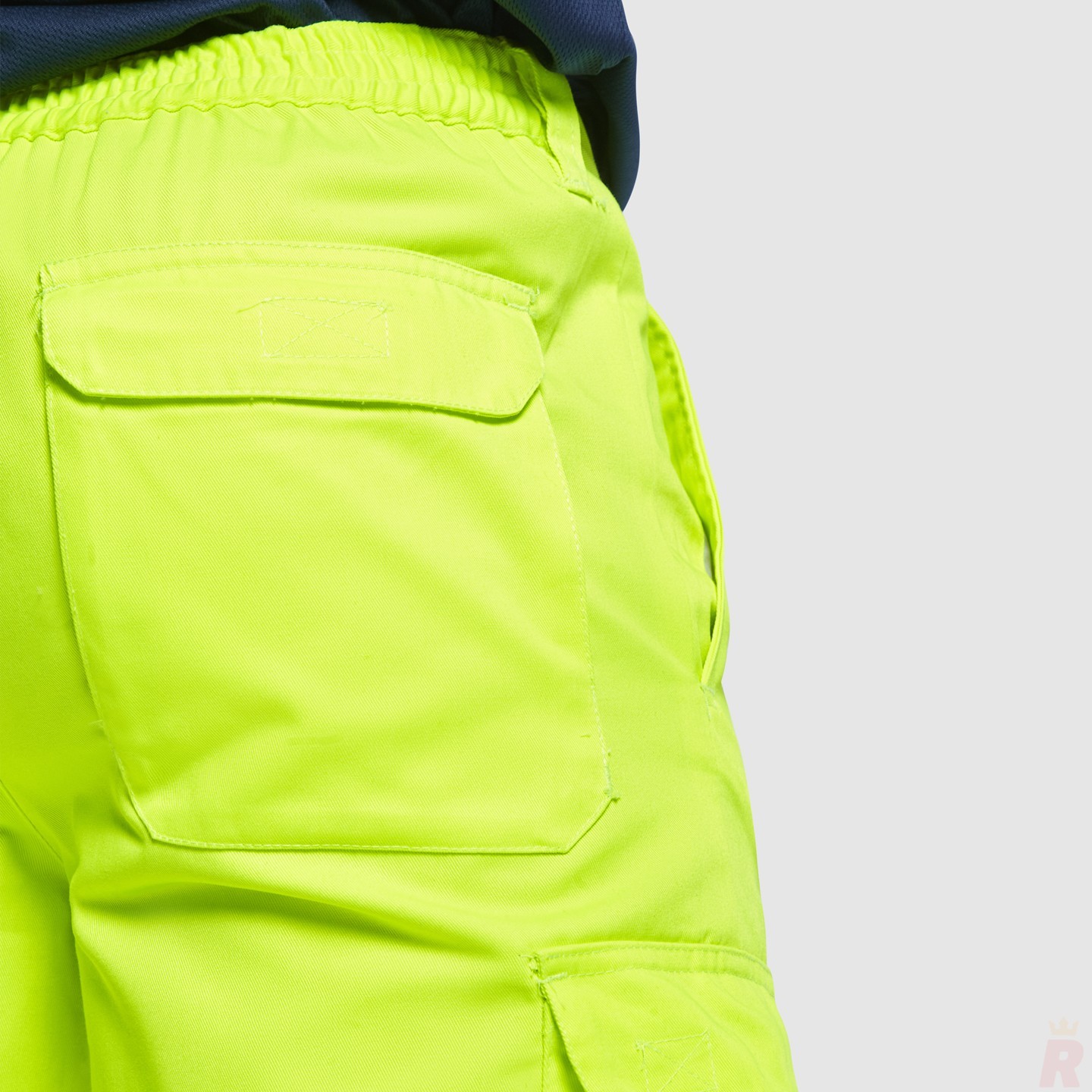 Pantalón laboral de alta visibilidad con tejido resistente, multibolsillos, cintas reflectantes y cintura elástica. Personalizable con logotipo