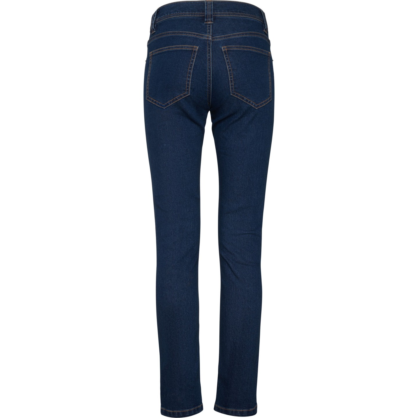 Pantalón vaquero largo para mujer, ideal para uso laboral. Corte regular fit, tejido elástico y etiqueta removible para personalizar con logotipo.