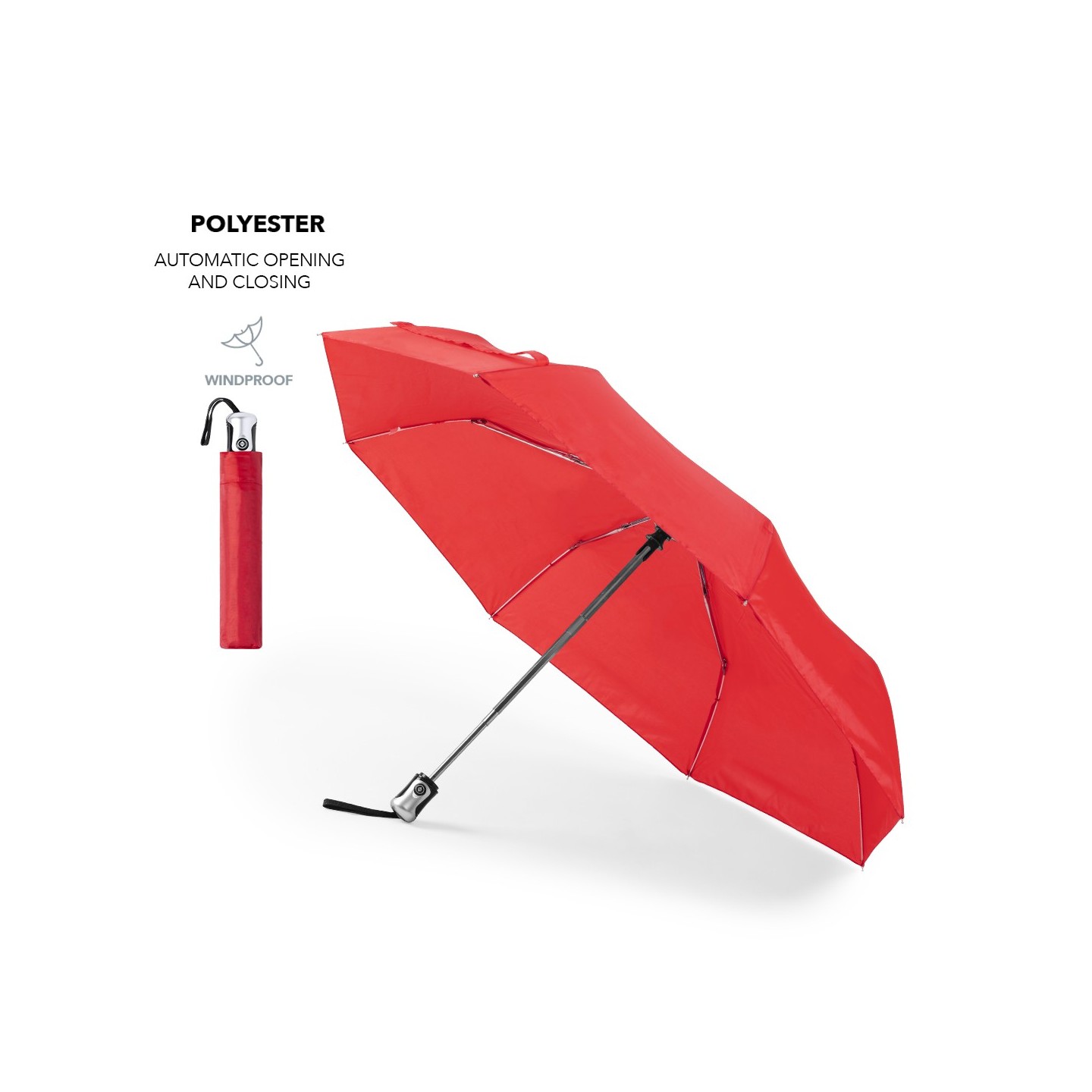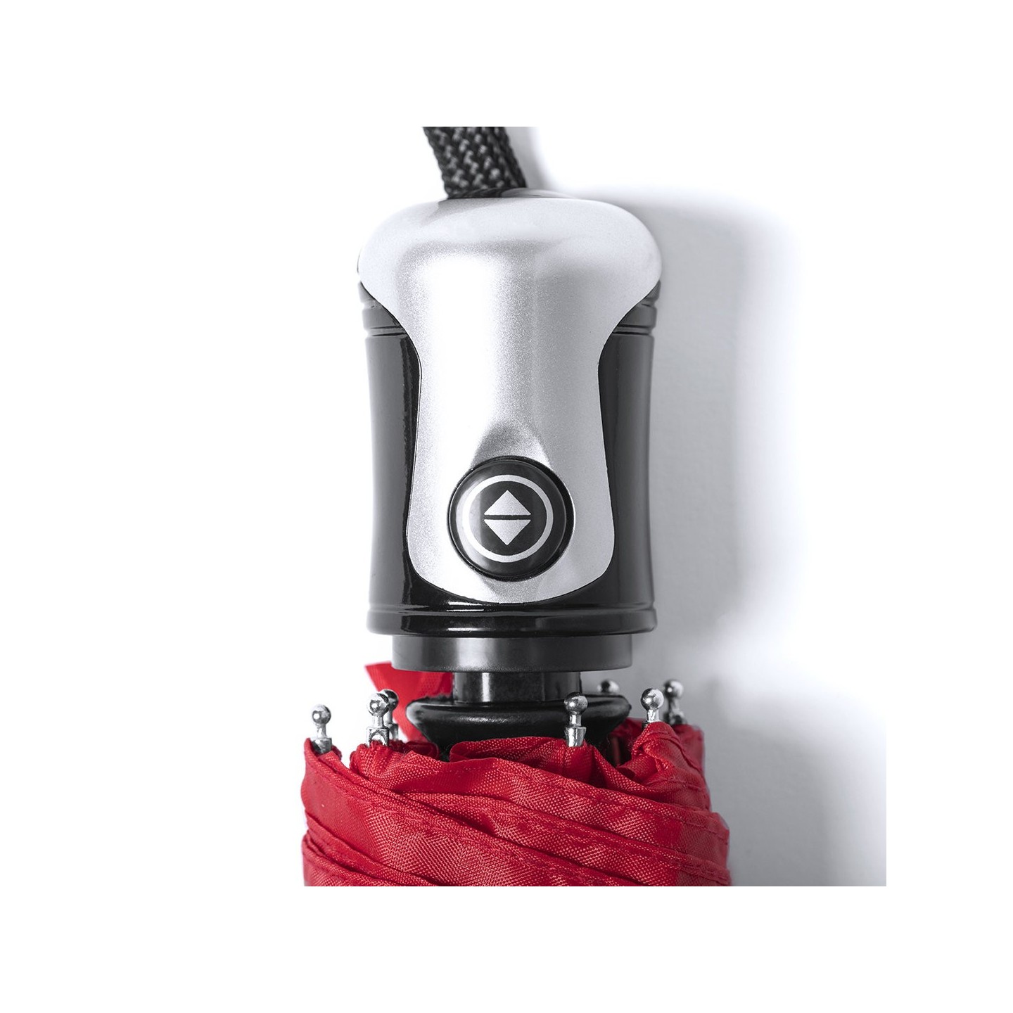 Su mecanismo automático de apertura/cierre y sistema anti viento aseguran una experiencia cómoda y segura. Las varillas metálicas en color plata y la fibra de vidrio le dan una estructura resistente y duradera.