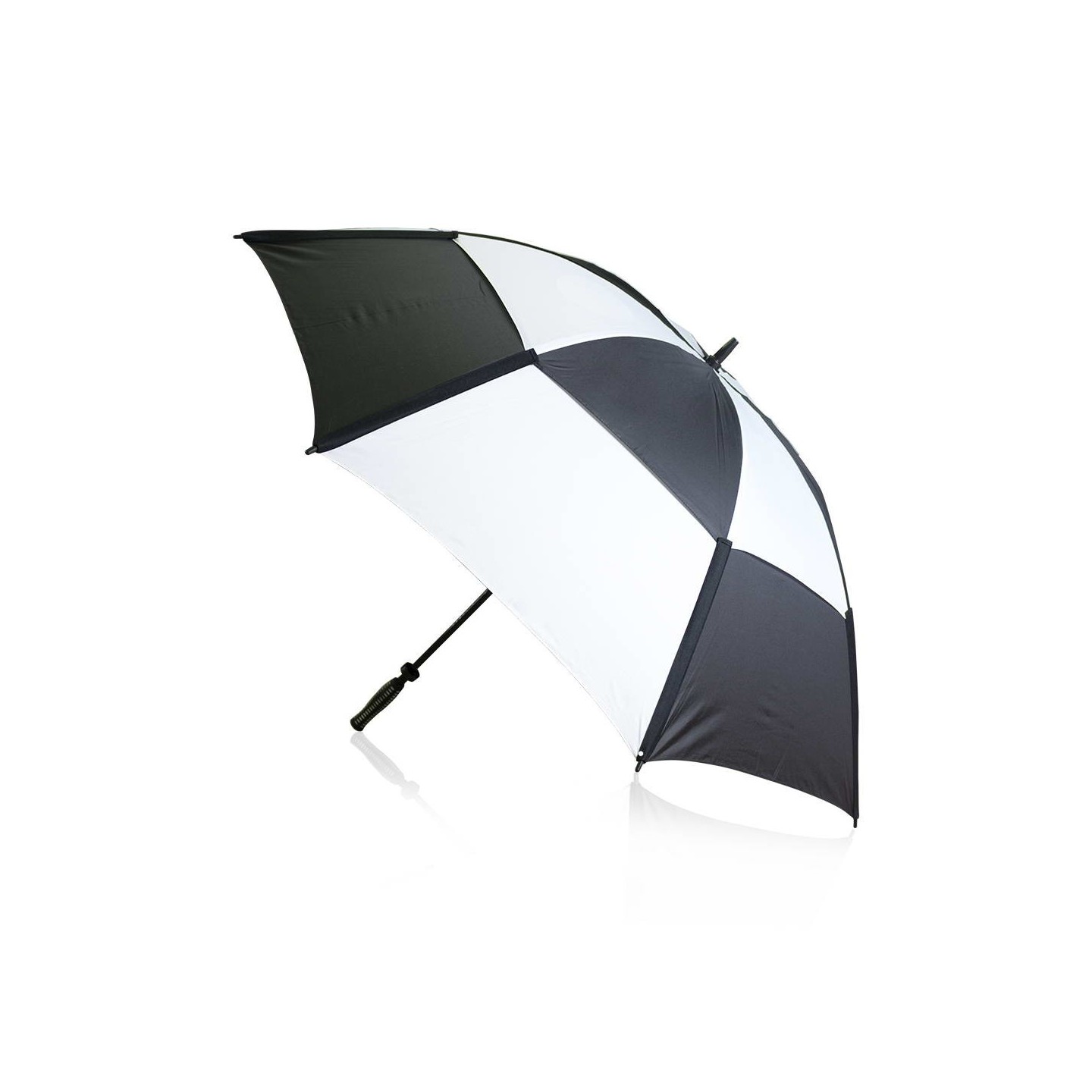 Paraguas de Golf de 8 paneles de sobrio diseño bicolor y 135cm de diámetro y de apertura manual. En resistente material pongee con sistema de seguridad anti viento. Con varillas de fibra en color negro, cierre doble de velcro y suave mango acolchado en espuma. Presentado en funda del mismo material en elegante color negro.