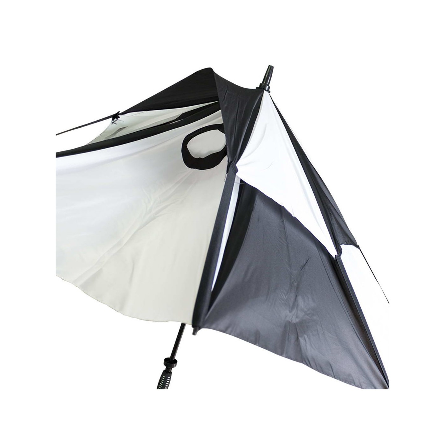 Las varillas de fibra en color negro brindan una estructura sólida y liviana, asegurando la estabilidad del paraguas. El cierre doble de velcro facilita su almacenamiento y transporte cuando no está en uso.