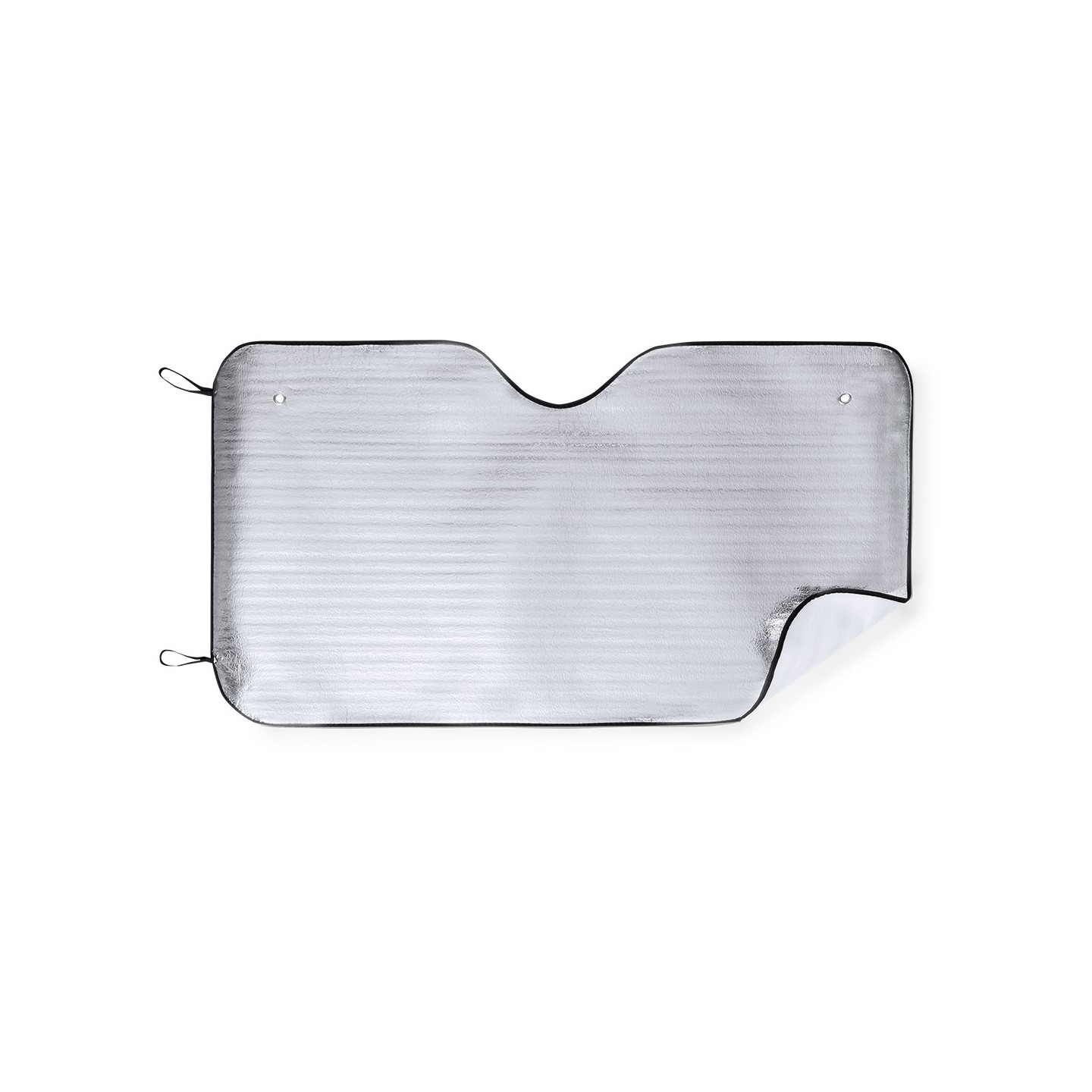 El Parasol Jumbo: estilo y protección en uno. Aluminio plateado con ribetes en poliéster negro. Tamaño 130x70cm con cintas elásticas y ventosas.