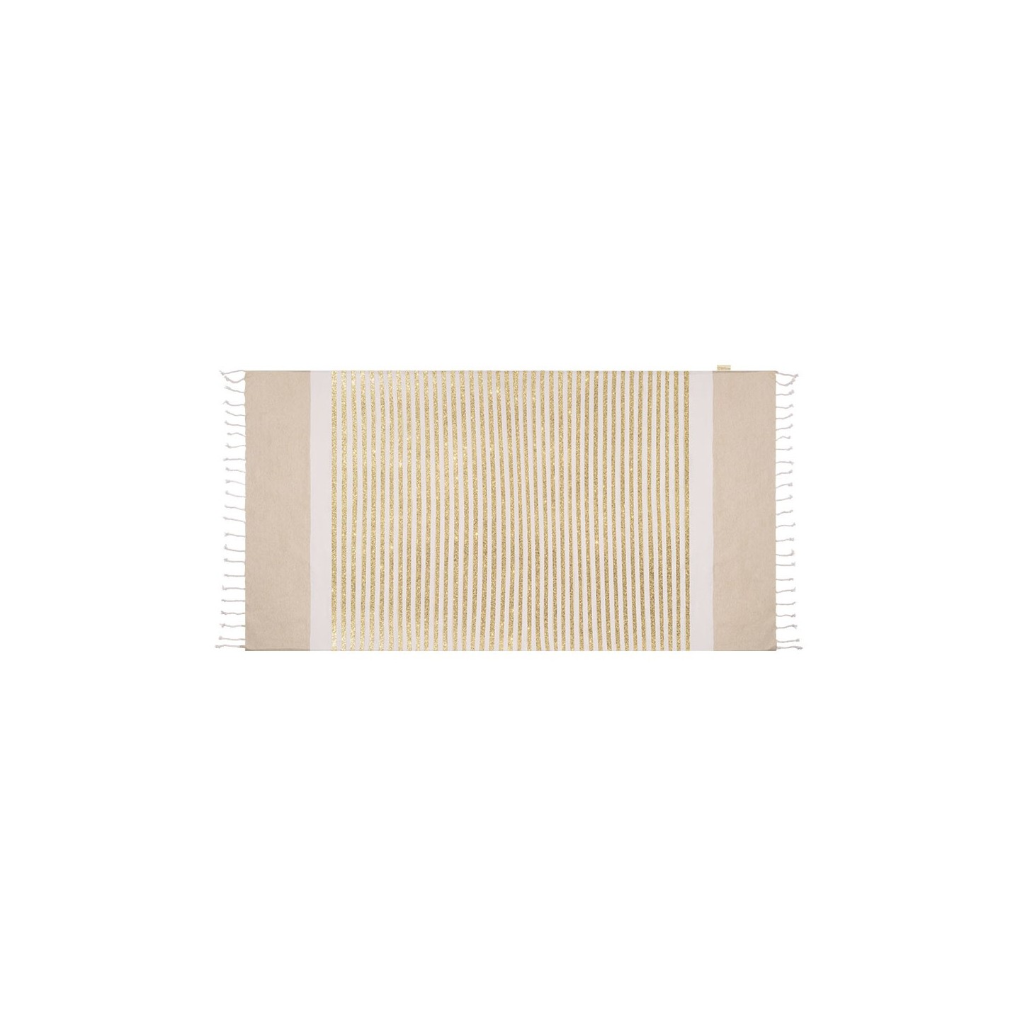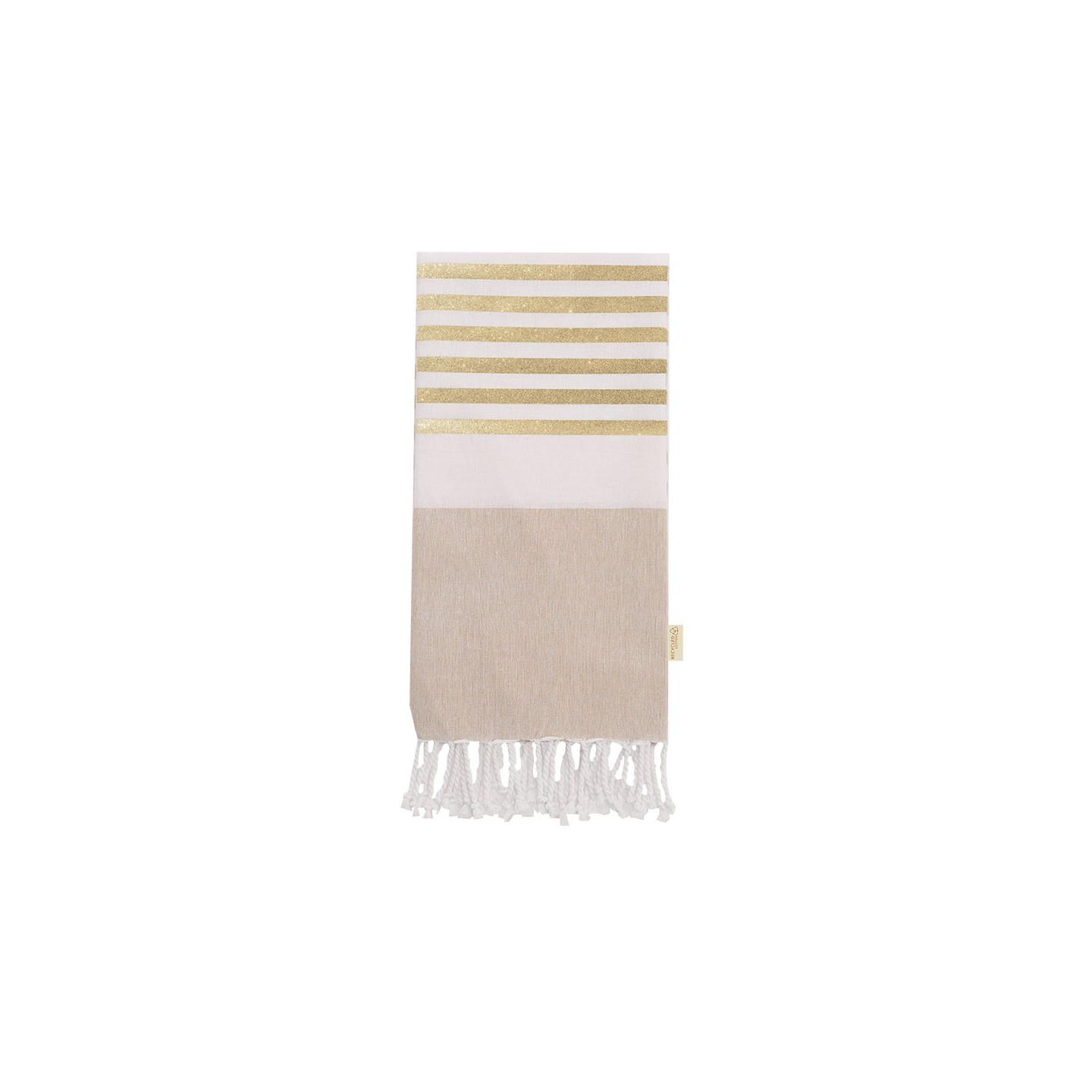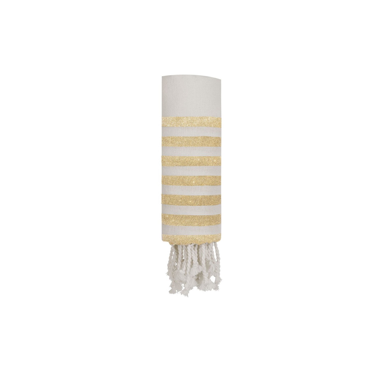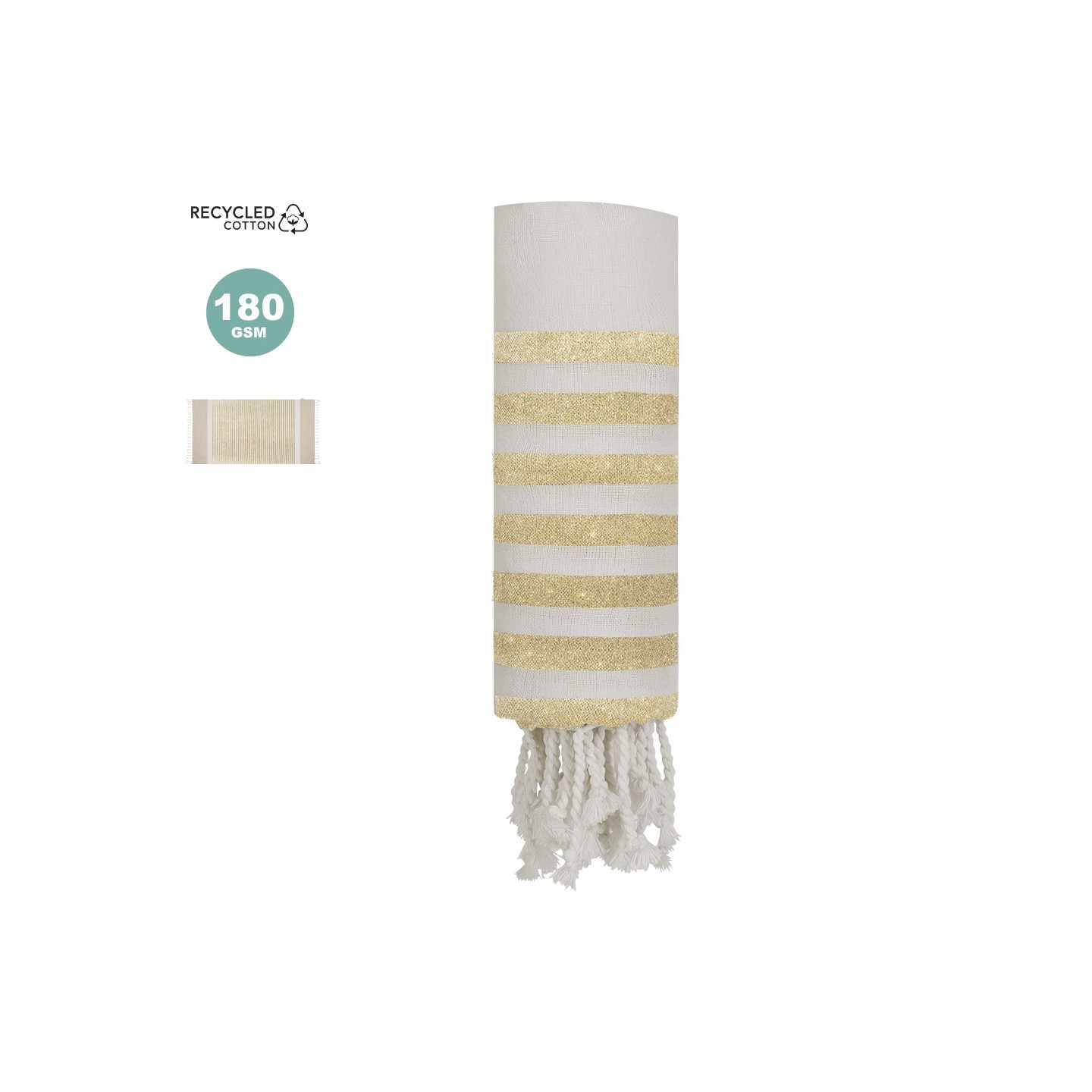 Pareo toalla de algodón reciclado, con diseño a rayas blancas y doradas con glitter. Flecos en los extremos y etiqueta con distintivo reciclado. Personalizable con logotipo. Ideal para promociones y regalos corporativos.