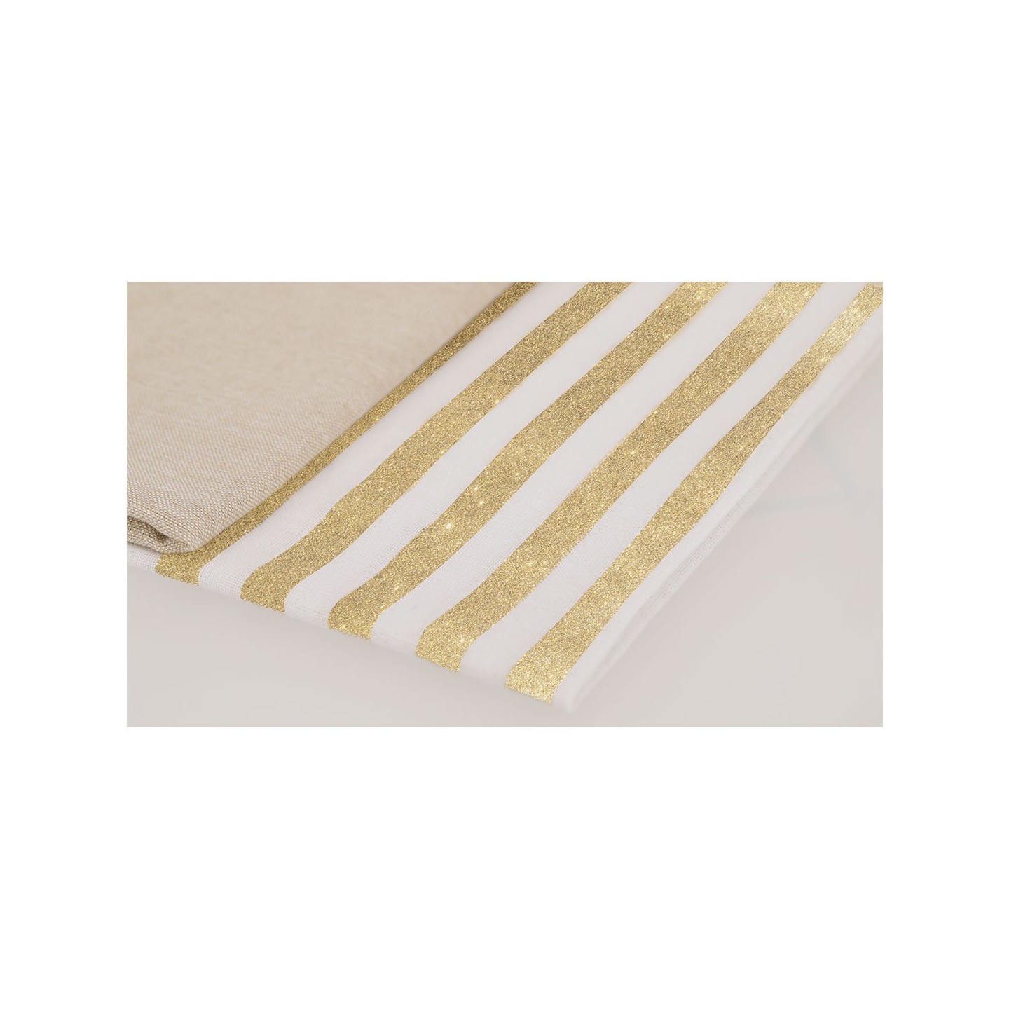 Su diseño combina rayas blancas con elegantes rayas doradas con efecto glitter, dando un toque moderno y sofisticado. Los extremos en beige liso y los flecos en forma de cordón añaden un detalle especial que lo hace aún más atractivo.