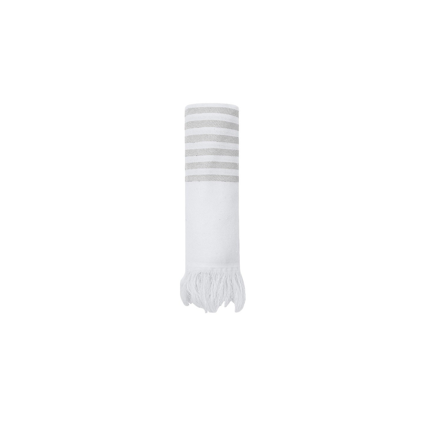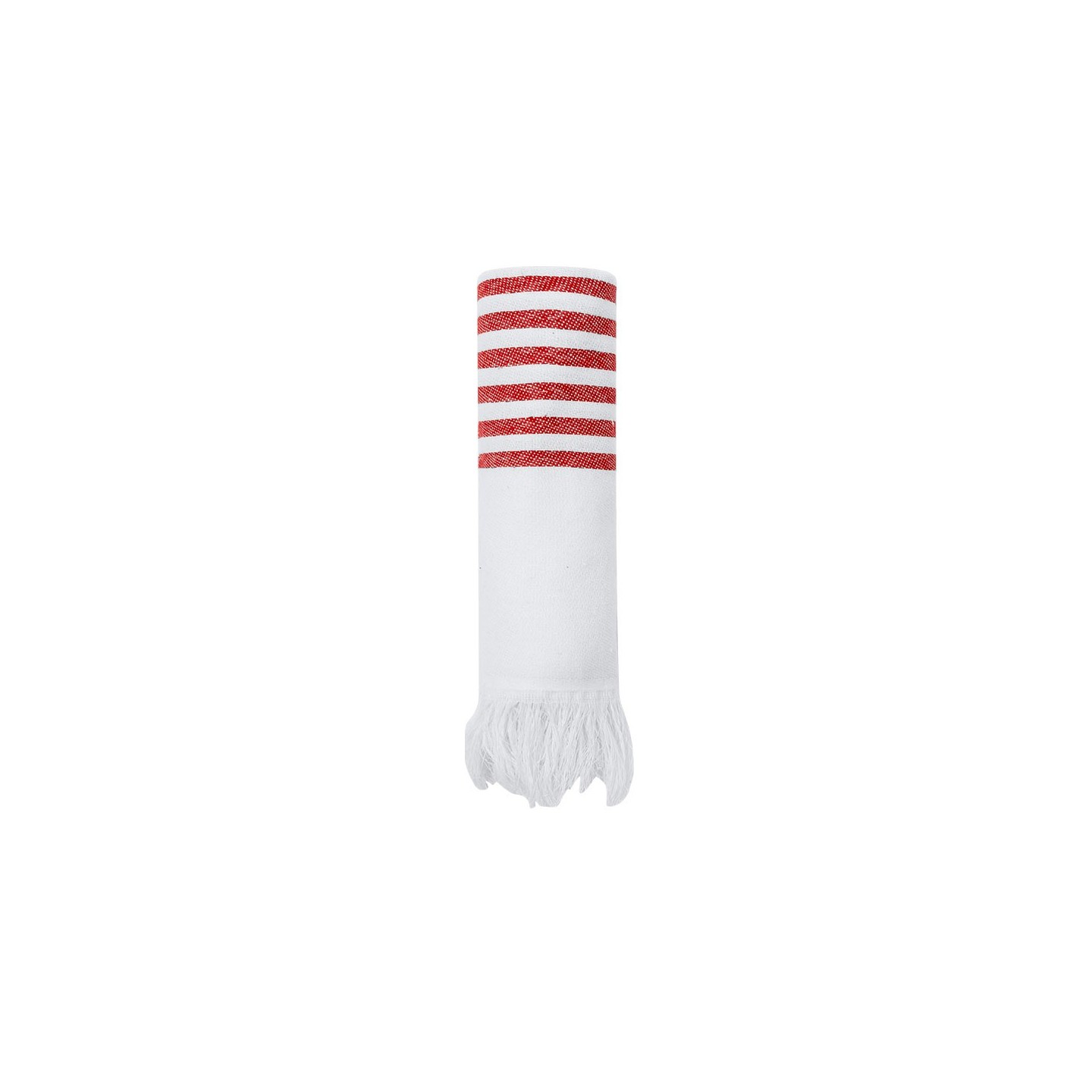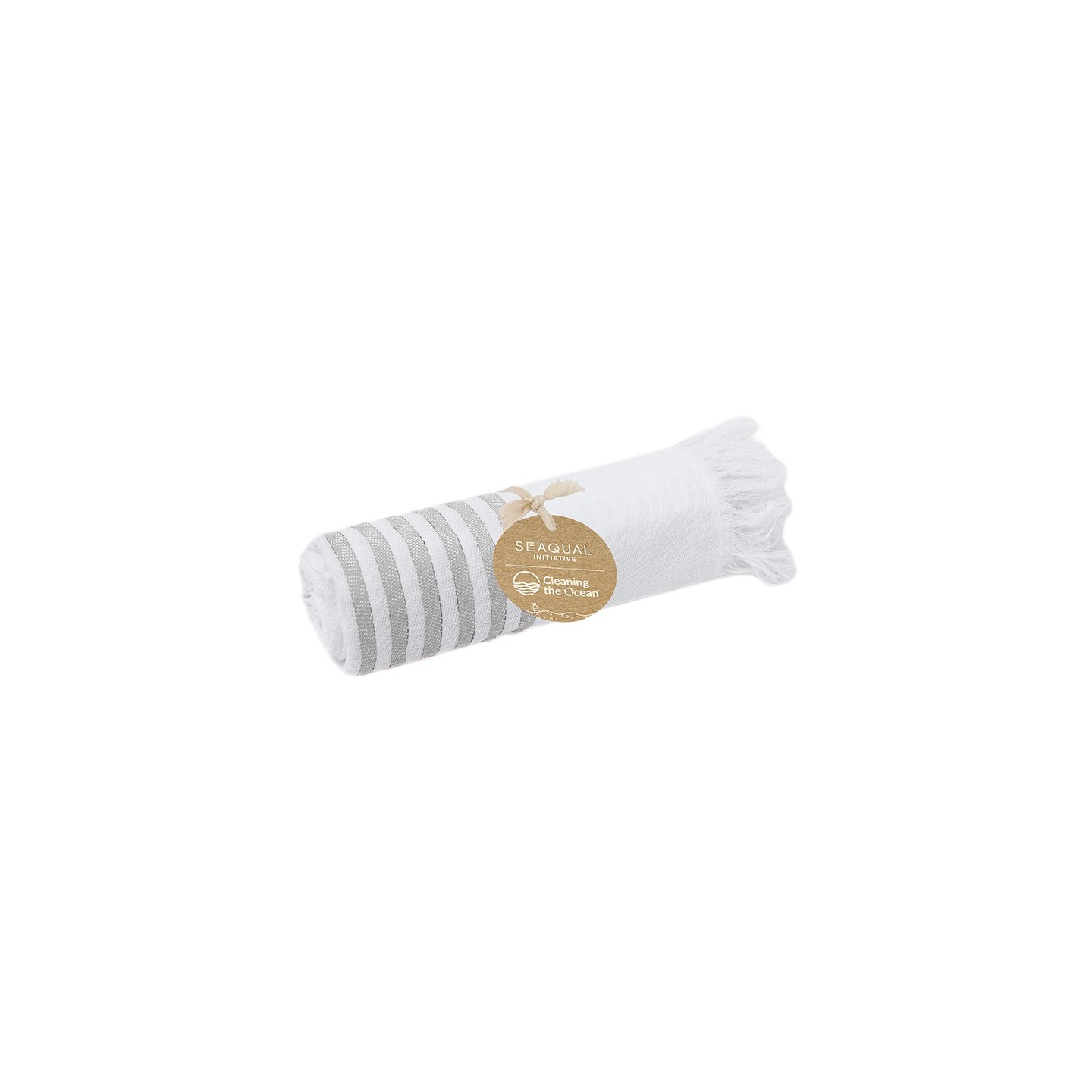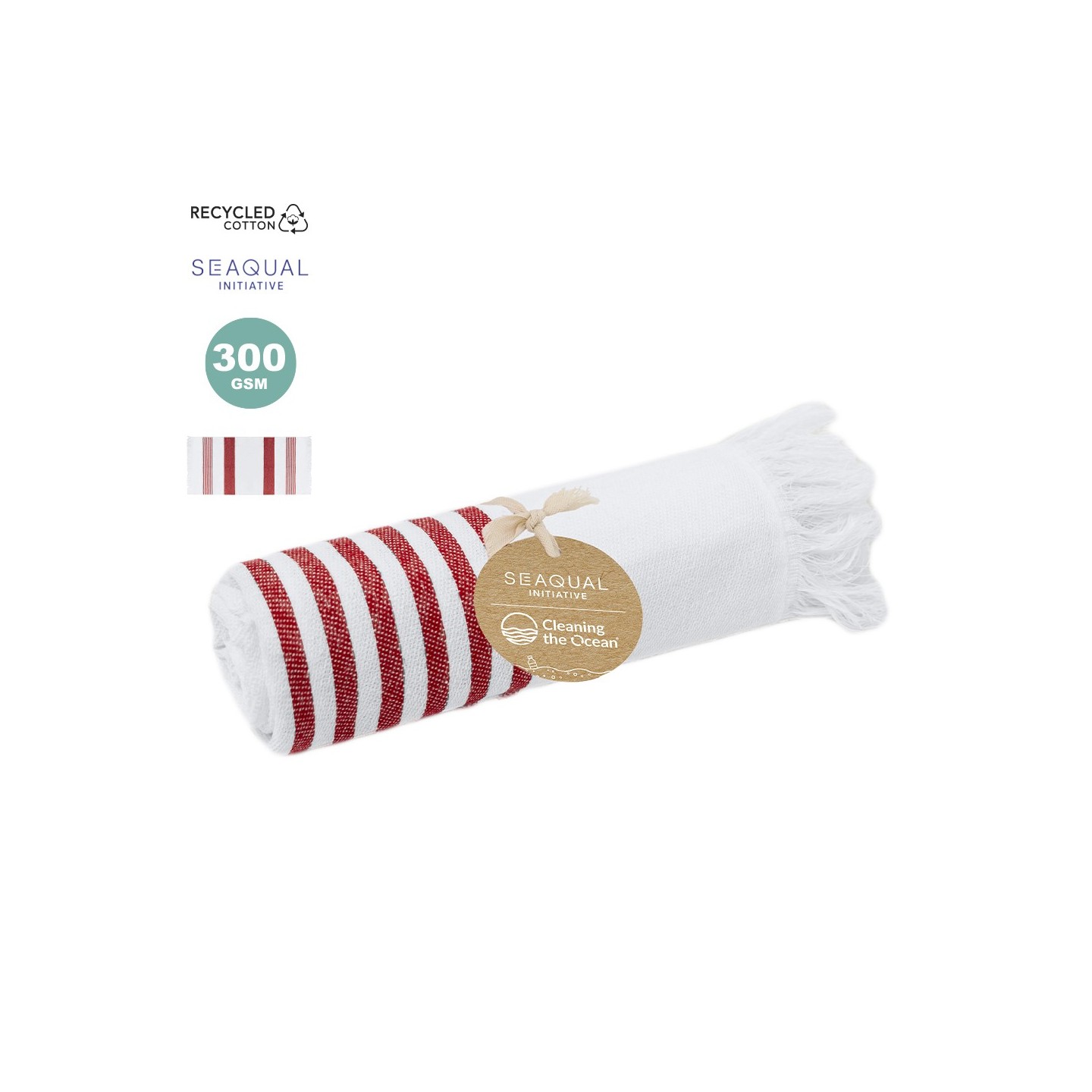 Pareo-toalla sostenible de algodón y poliéster reciclado SEAQUAL®. Diseño moderno con flecos y rayas coloridas. Personalizable con logotipo. Medidas: 70x140 cm.