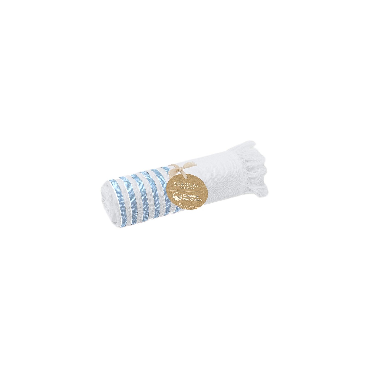 El diseño de MUNDRY es elegante y versátil, con una base en blanco que se combina con rayas de colores vibrantes y termina con flecos distintivos en los extremos, añadiendo un toque único y llamativo. Además, el producto incluye una etiqueta con el distintivo SEAQUAL®, que garantiza su origen sostenible y su contribución a la limpieza de océanos. El tejido SEAQUAL® proviene de un proceso innovador que utiliza plástico marino reciclado, recolectado de los océanos, ríos y estuarios en programas de limpieza colaborativos.
