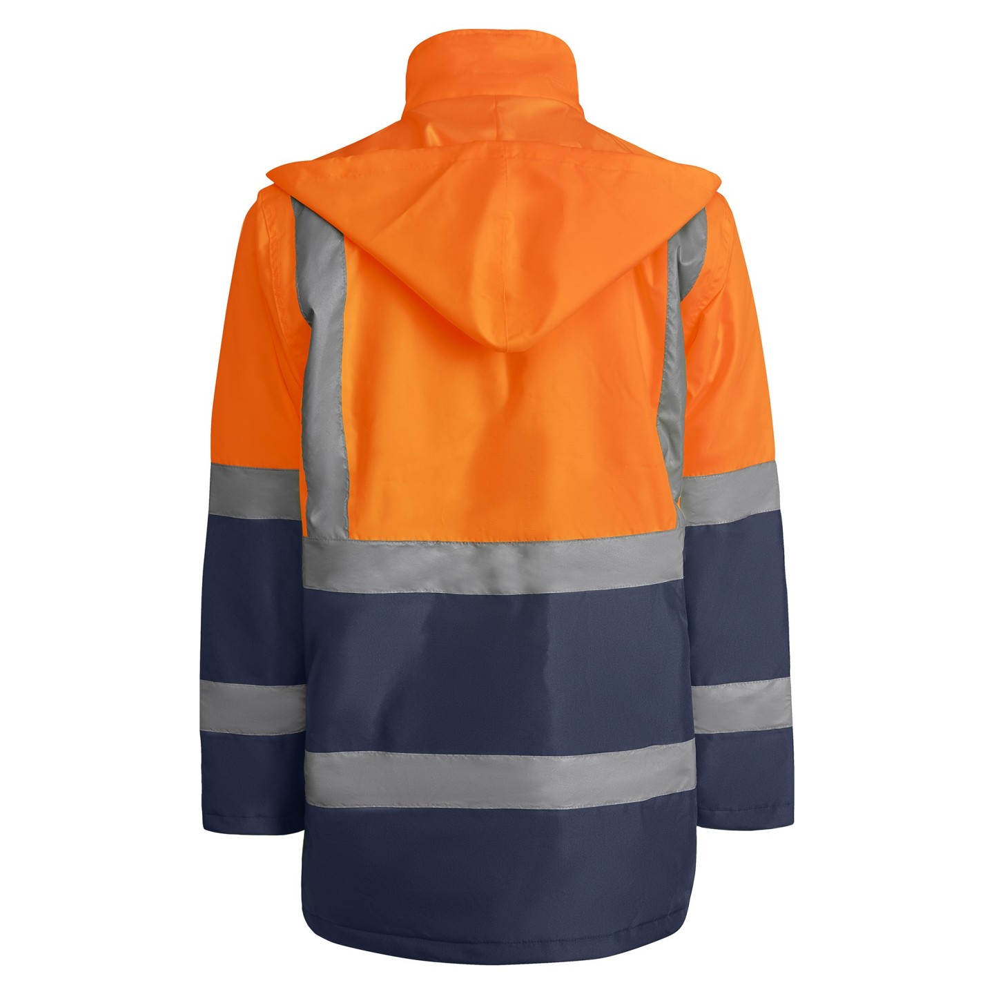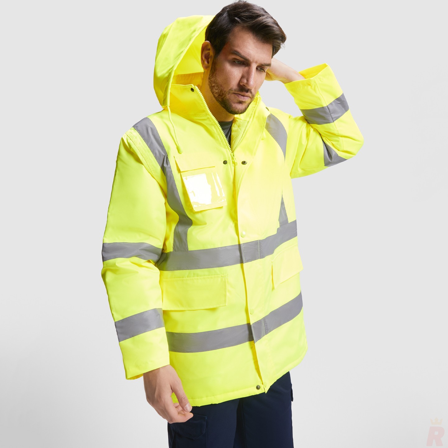 Parka acolchada de alta visibilidad impermeable, con cintas reflectantes, capucha enrollable y múltiples bolsillos. Ideal como ropa laboral personalizada con logotipo