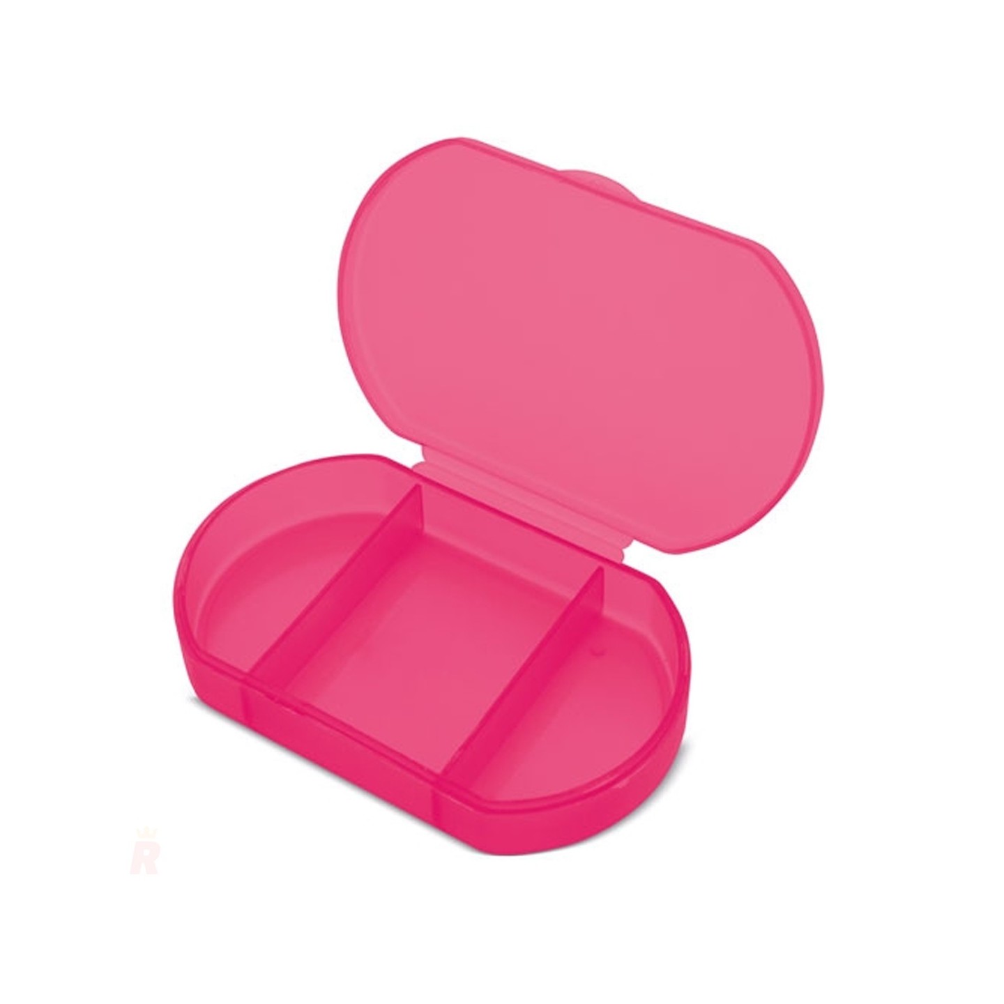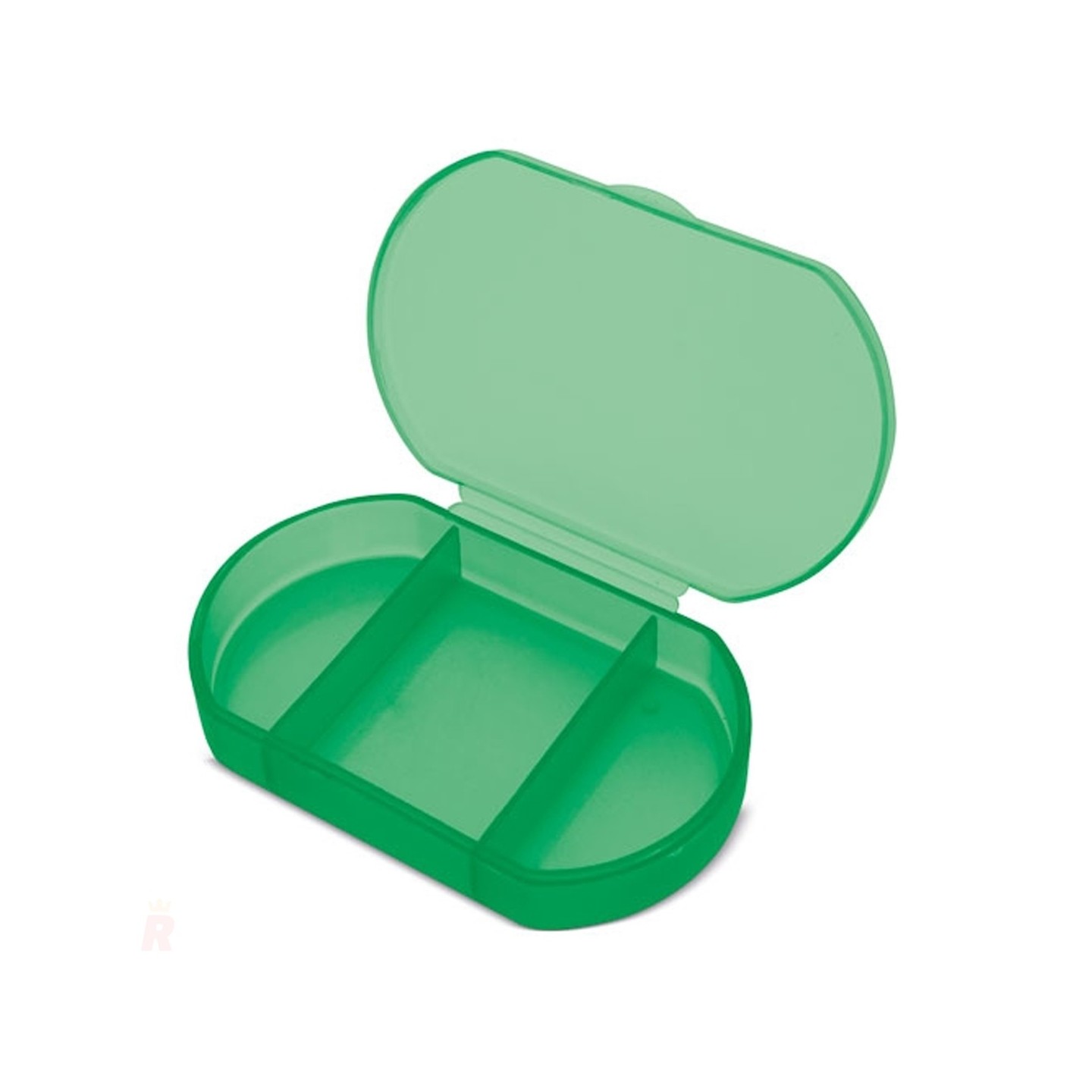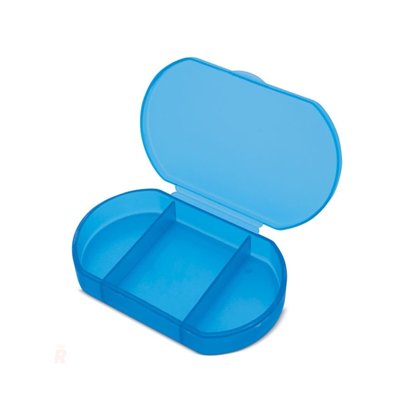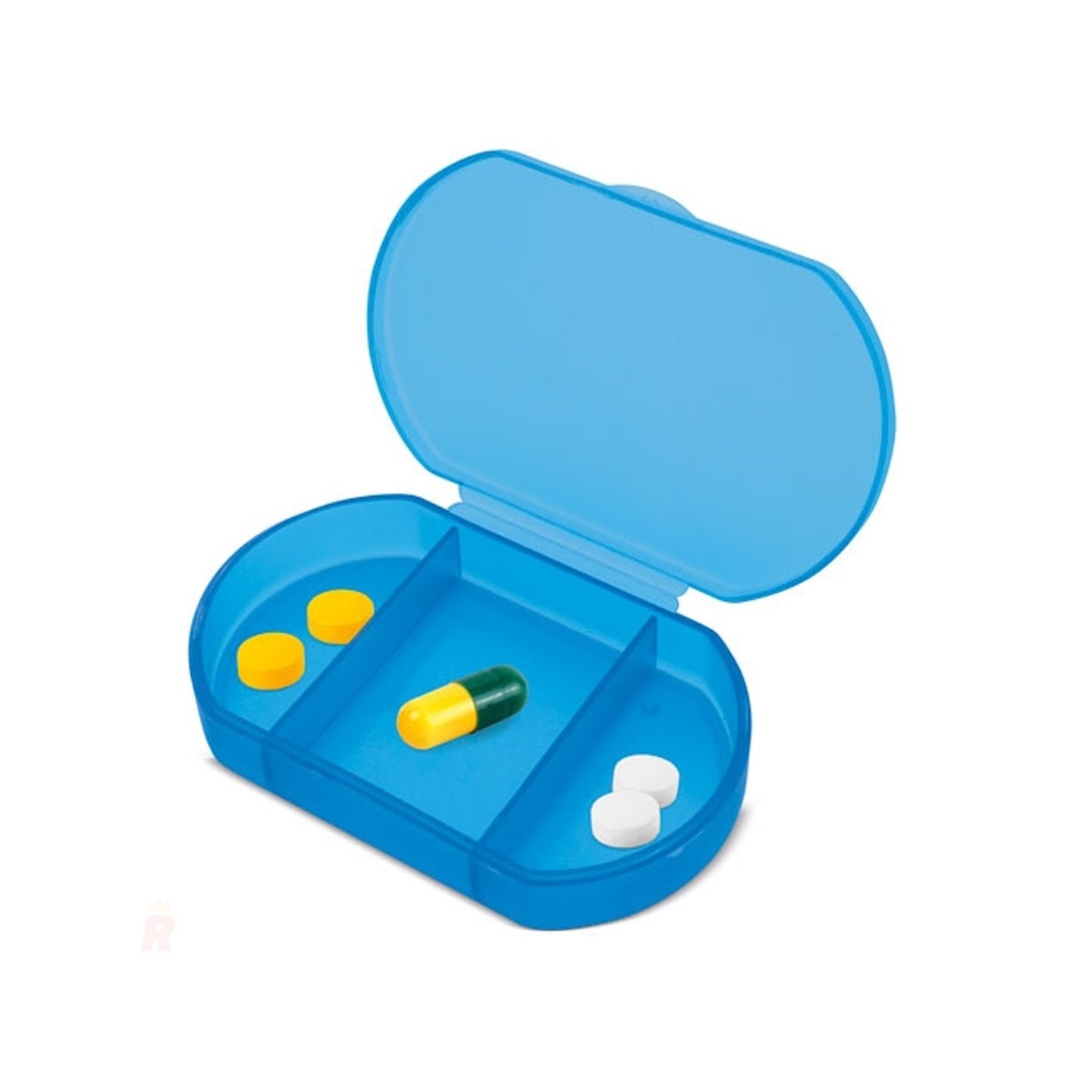 Compacto pastillero de bolsillo con 3 compartimentos, fabricado en plástico libre de BPA. Personalizable con logotipo y disponible en varios colores. Ideal como regalo promocional para empresas
