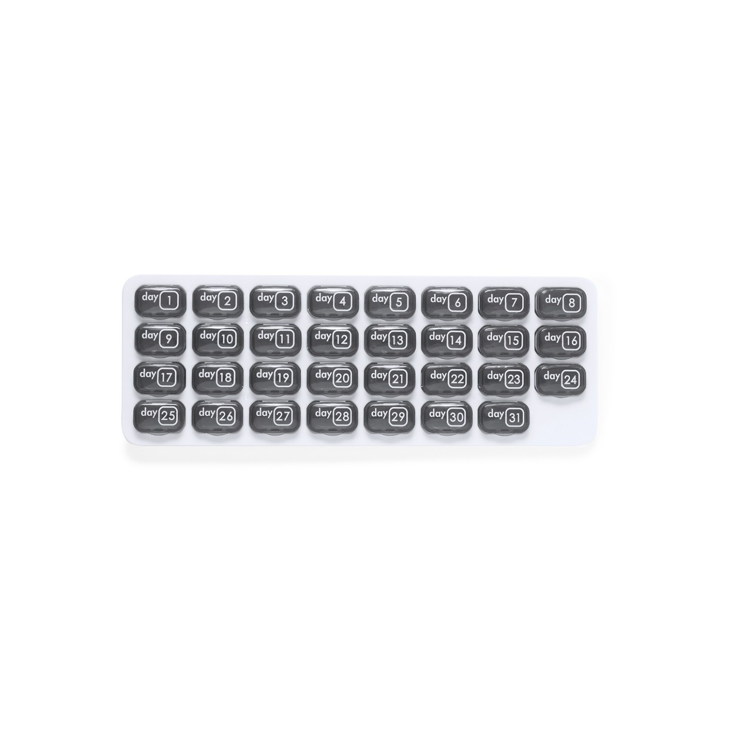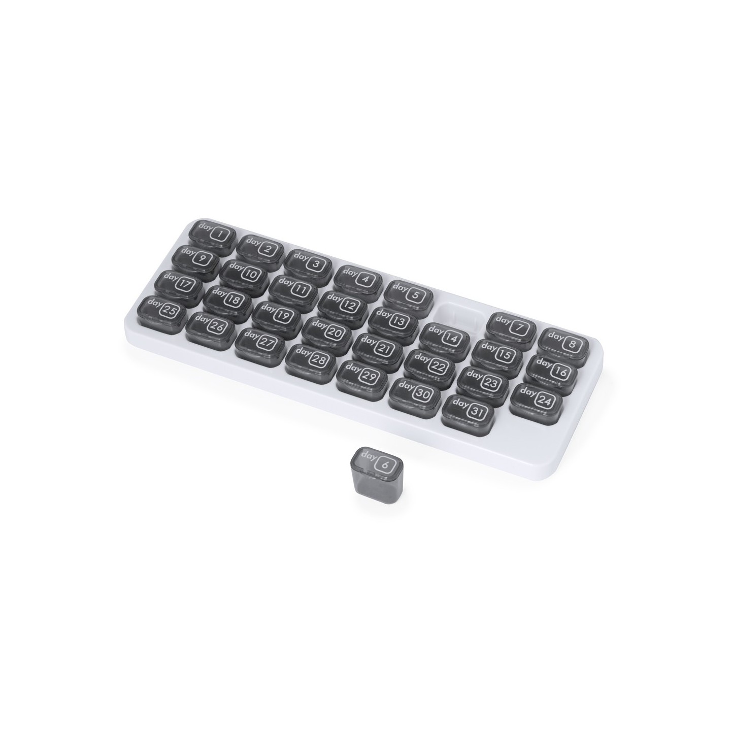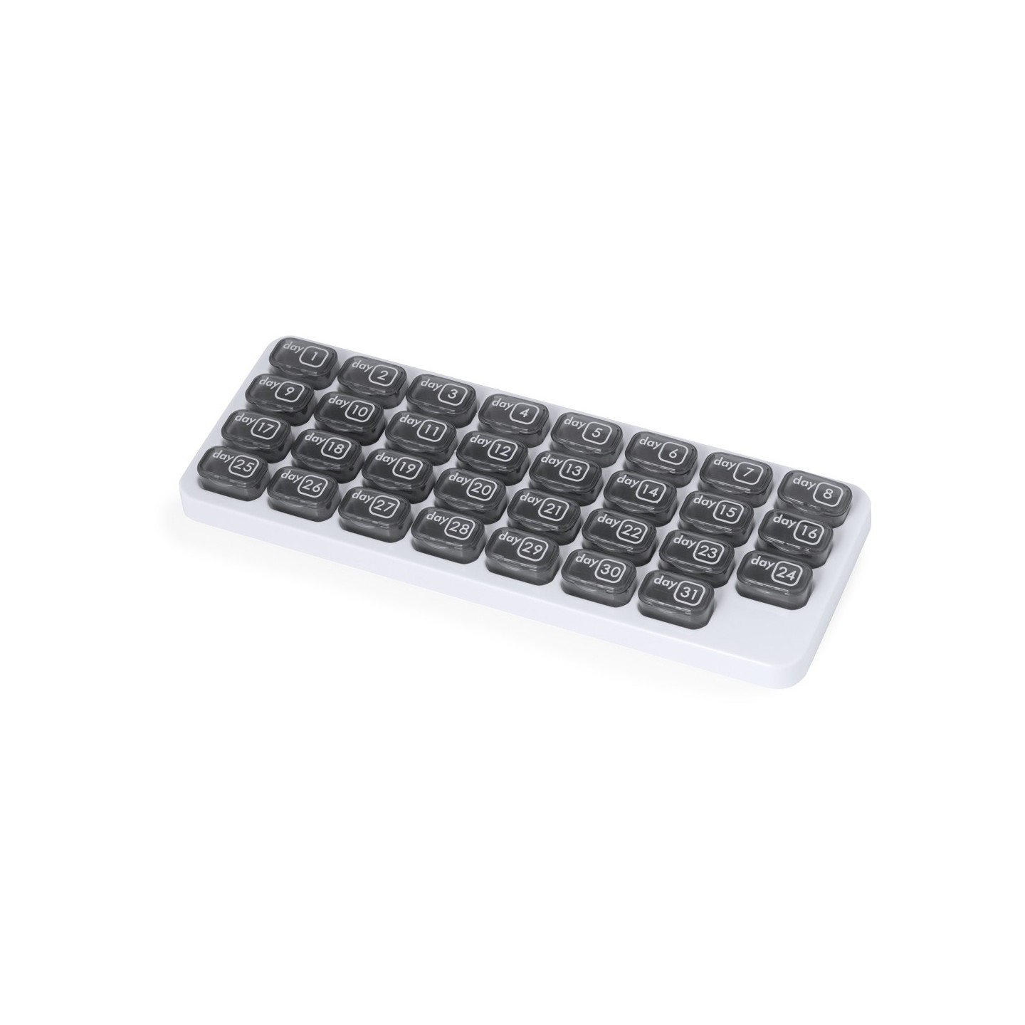 Cada casilla del Pastillero Stexio está diseñada con un estilo elegante y funcional. La base blanca proporciona un fondo neutral y elegante, mientras que las casillas de color gris con el día del mes marcado ofrecen una fácil identificación y un toque de sofisticación.