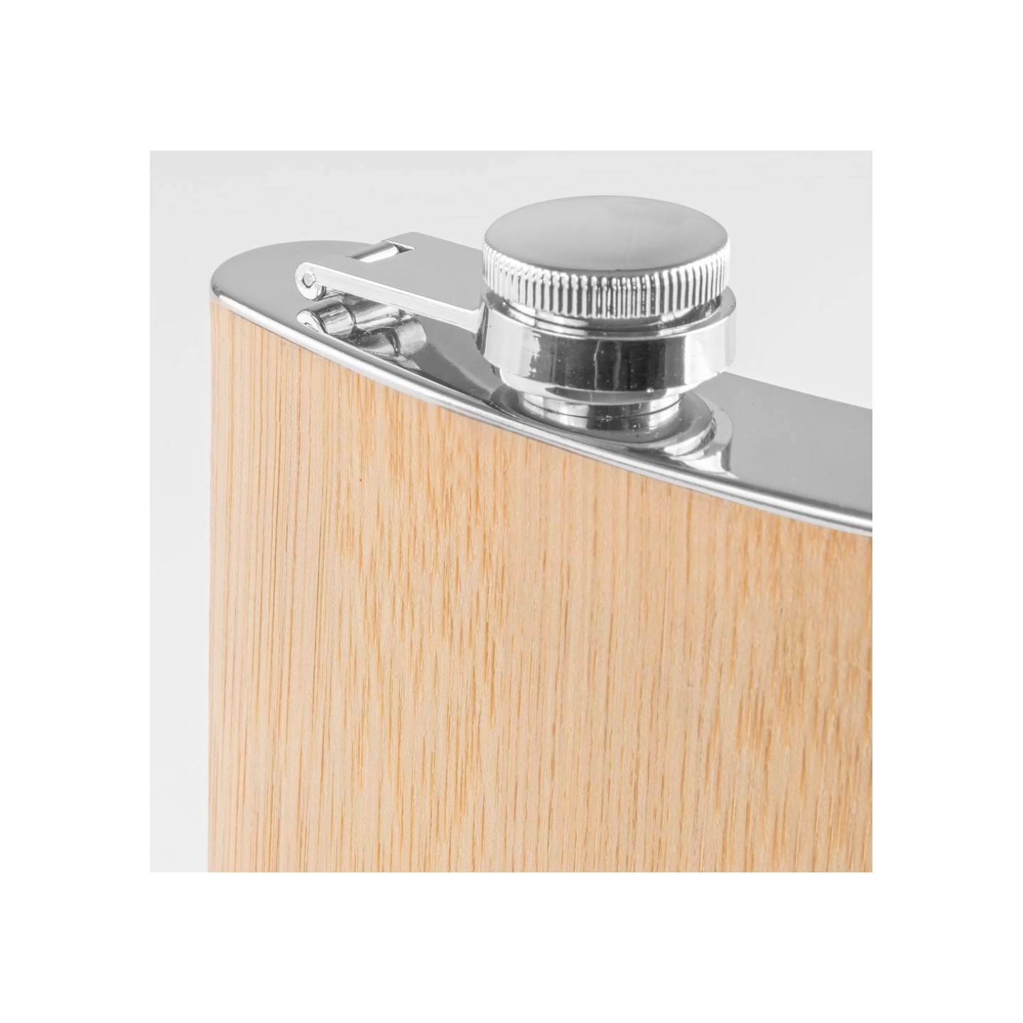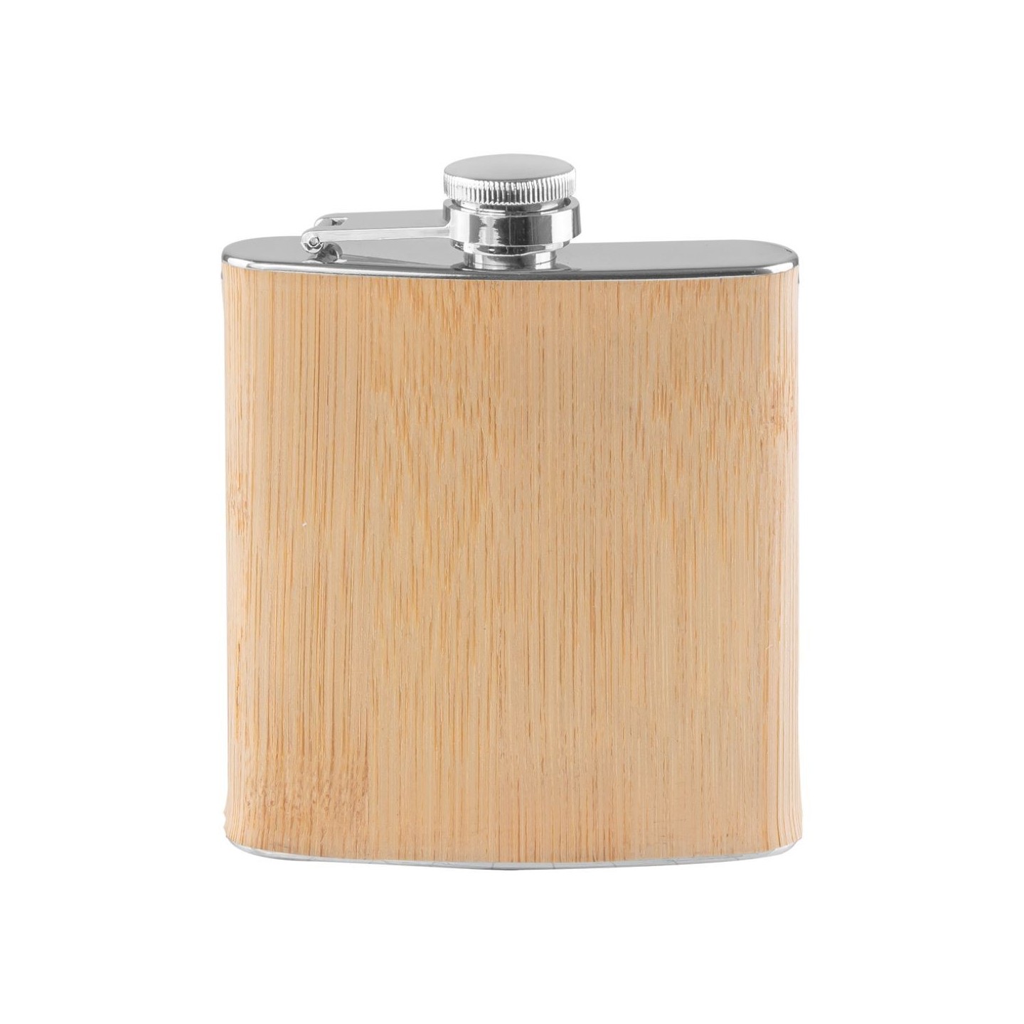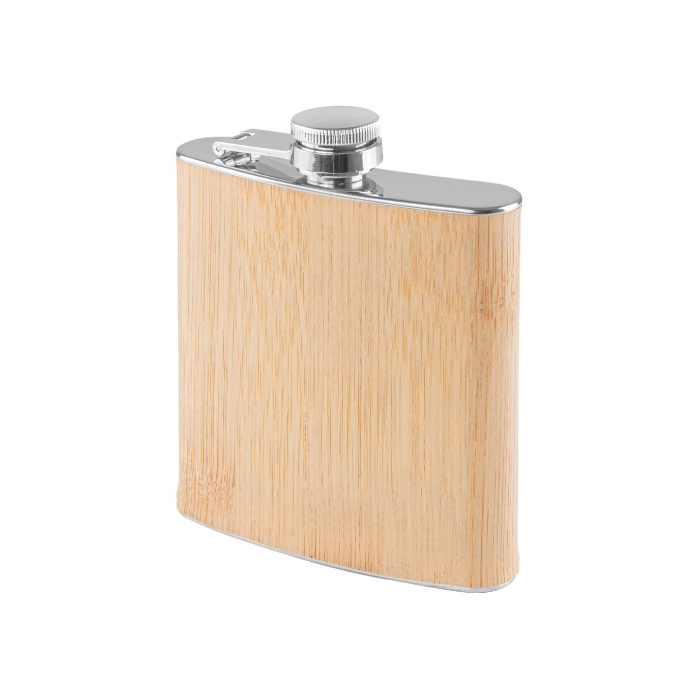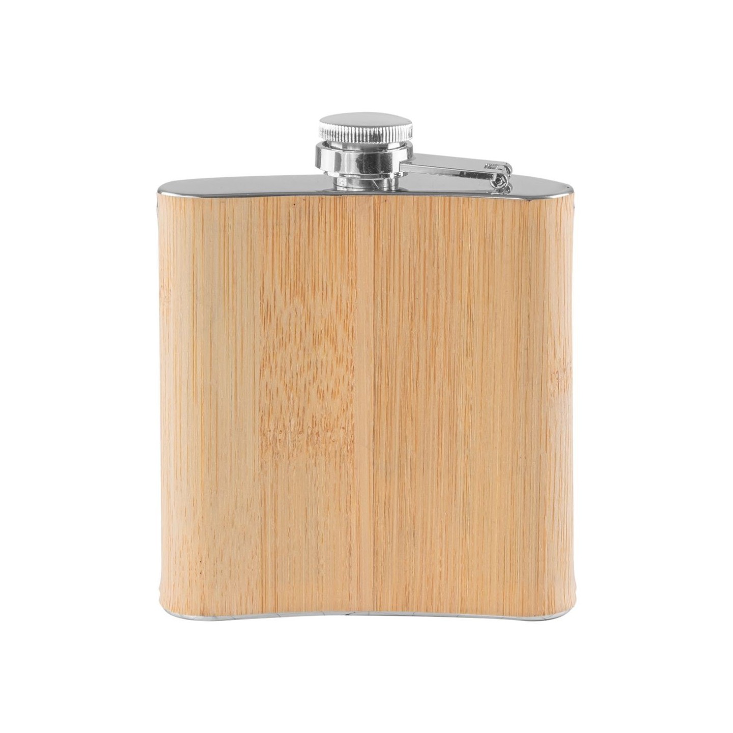 Petaca de acero con acabado de bambú natural, personalizable con tu logo. Capacidad 160 ml. Certificación LFGB. Presentación en caja.