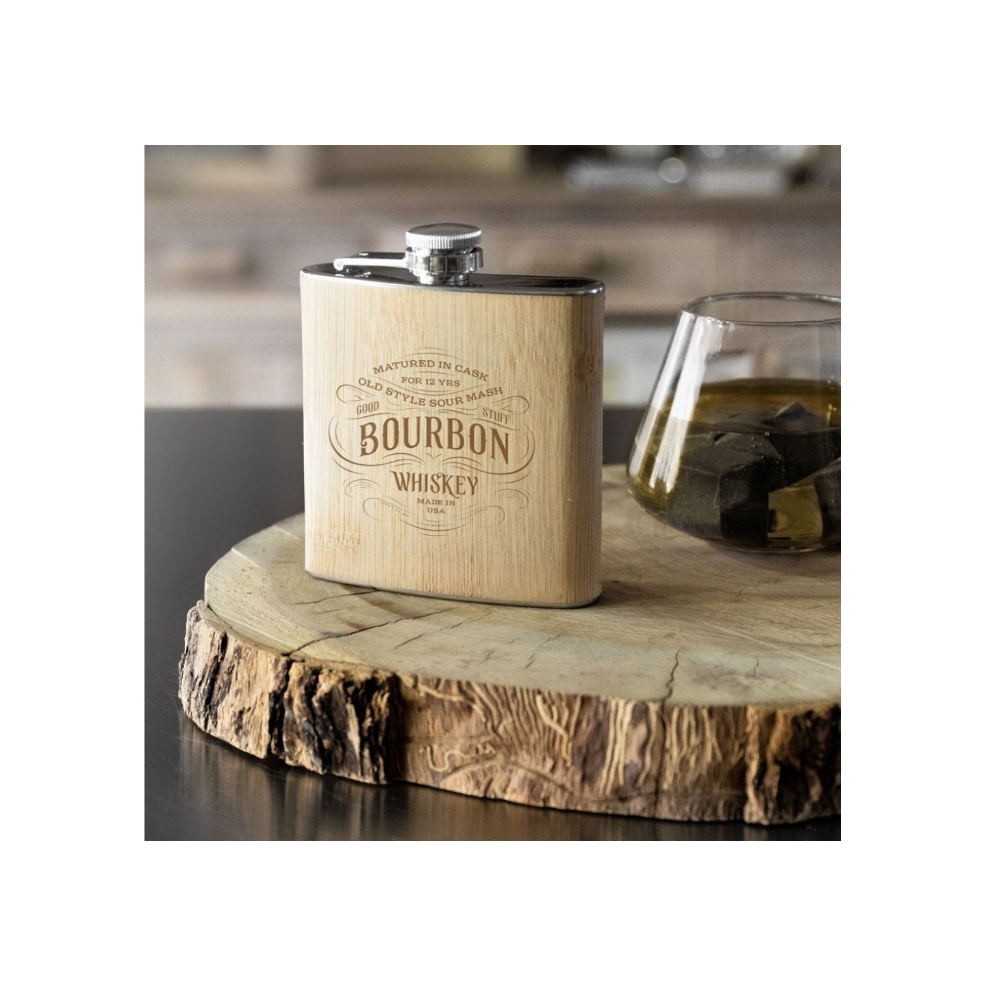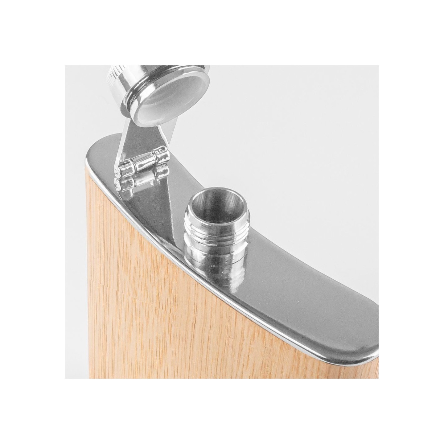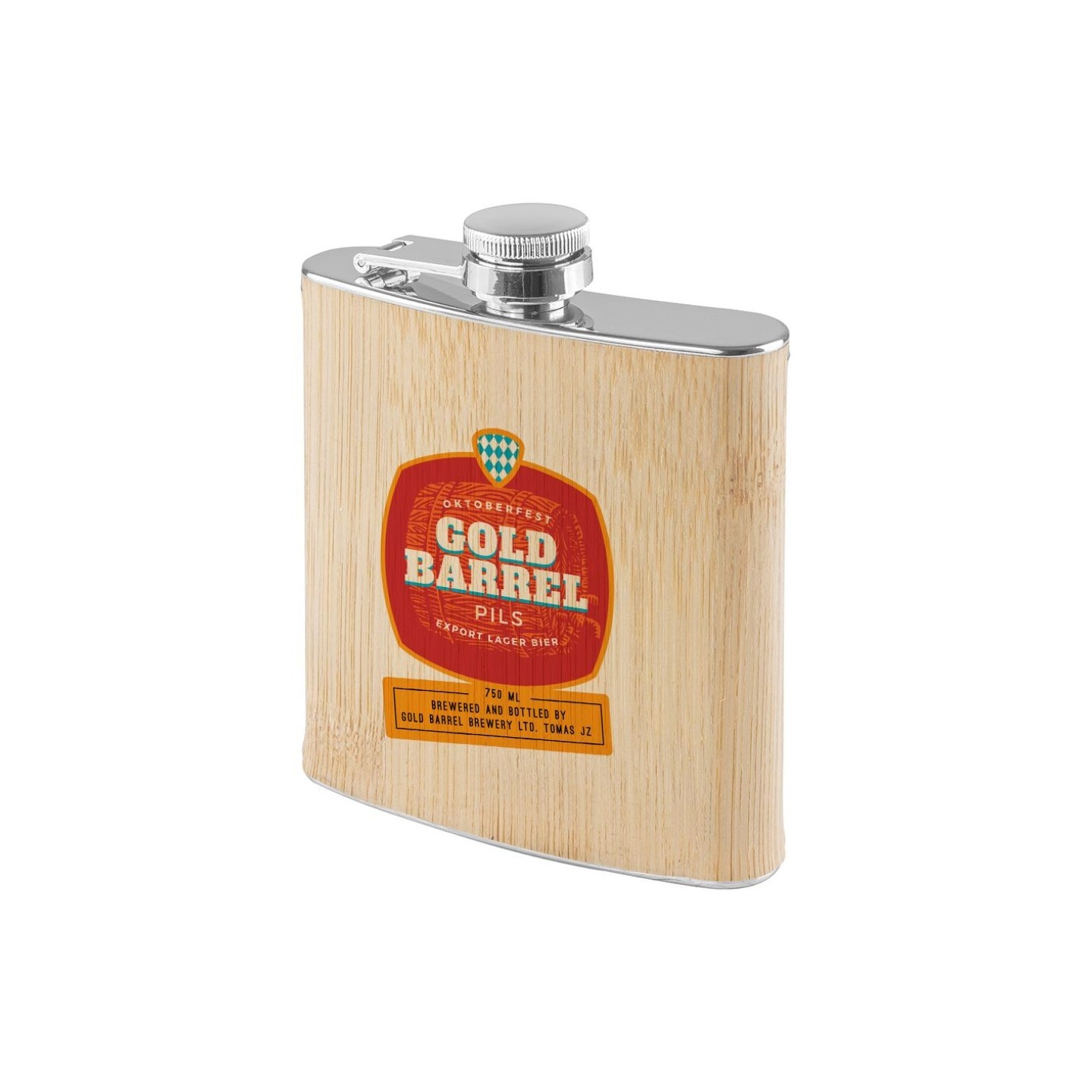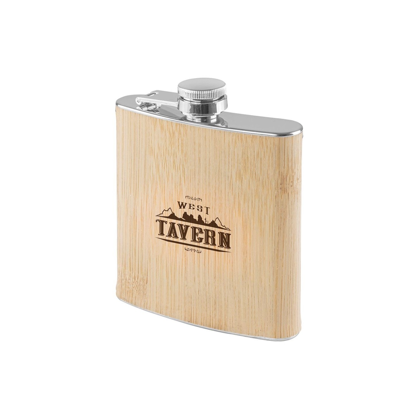Petaca de acero con acabado de bambú natural, personalizable con tu logo. Capacidad 160 ml. Certificación LFGB. Presentación en caja.