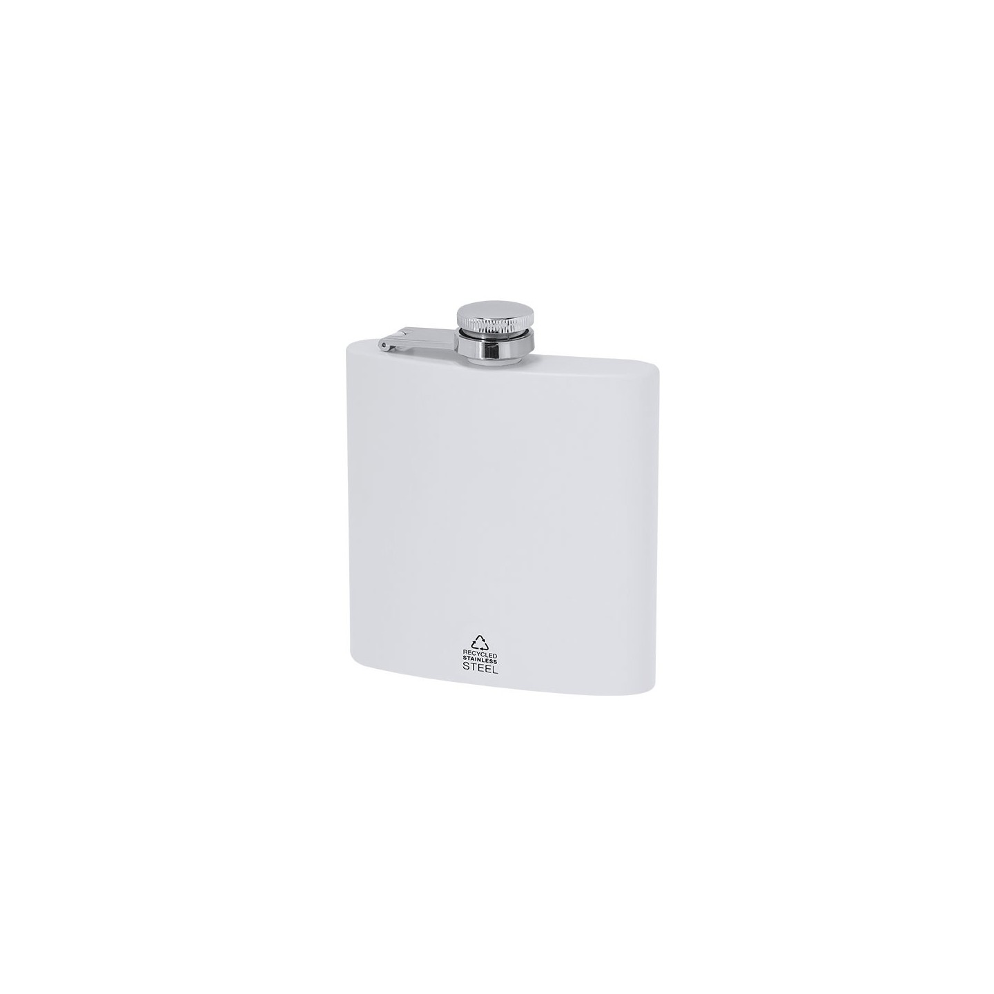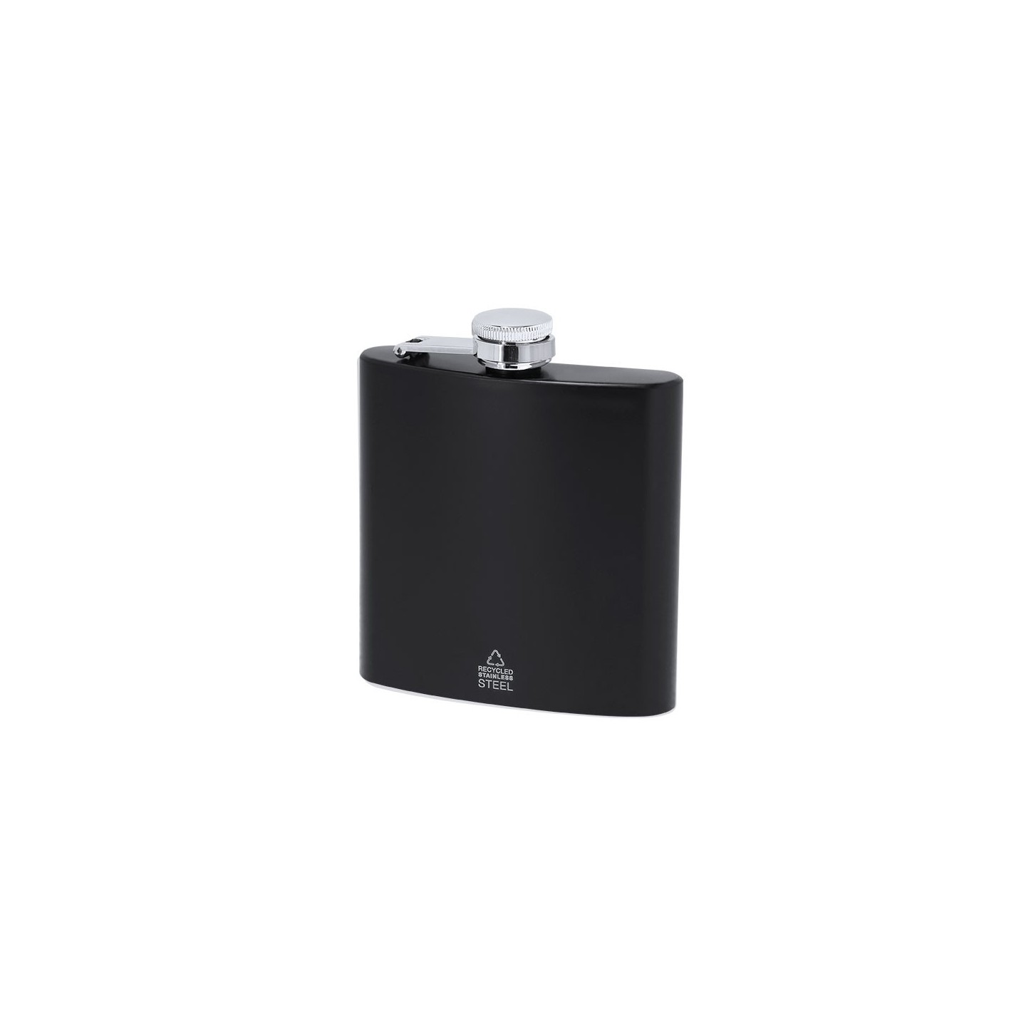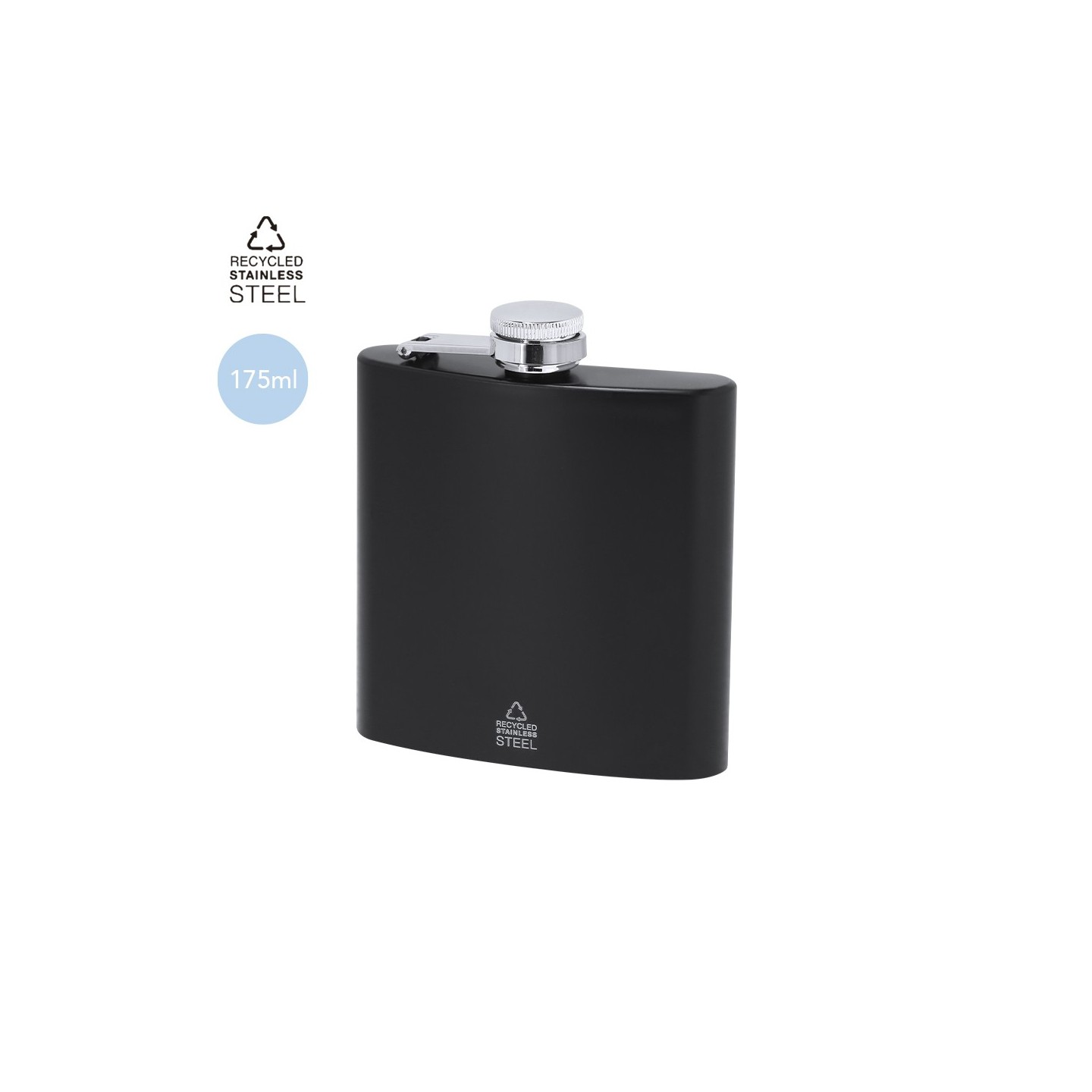 Petaca LINDOG de 175 ml, fabricada en acero inoxidable reciclado con tapón de seguridad. Diseño ergonómico y personalizable con logotipo. Ideal para promociones ecológicas.