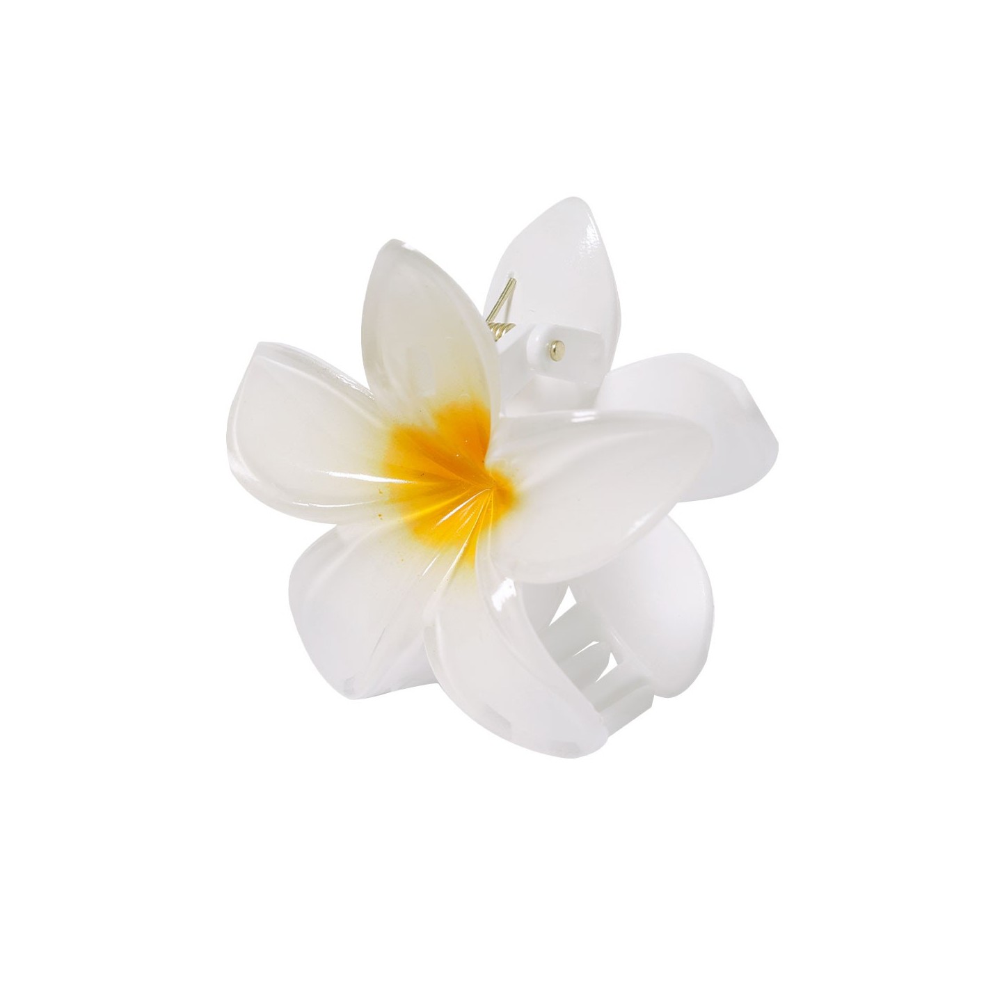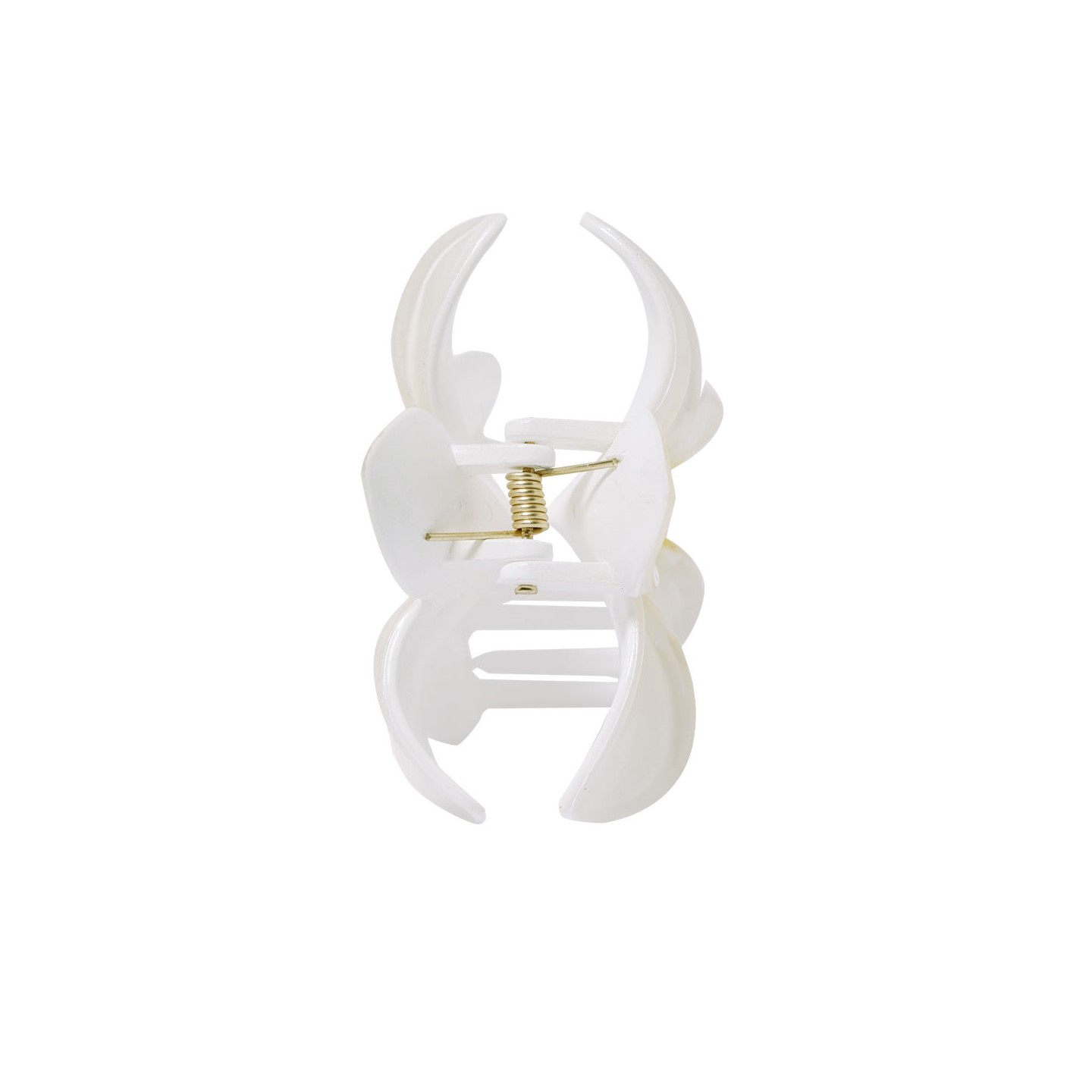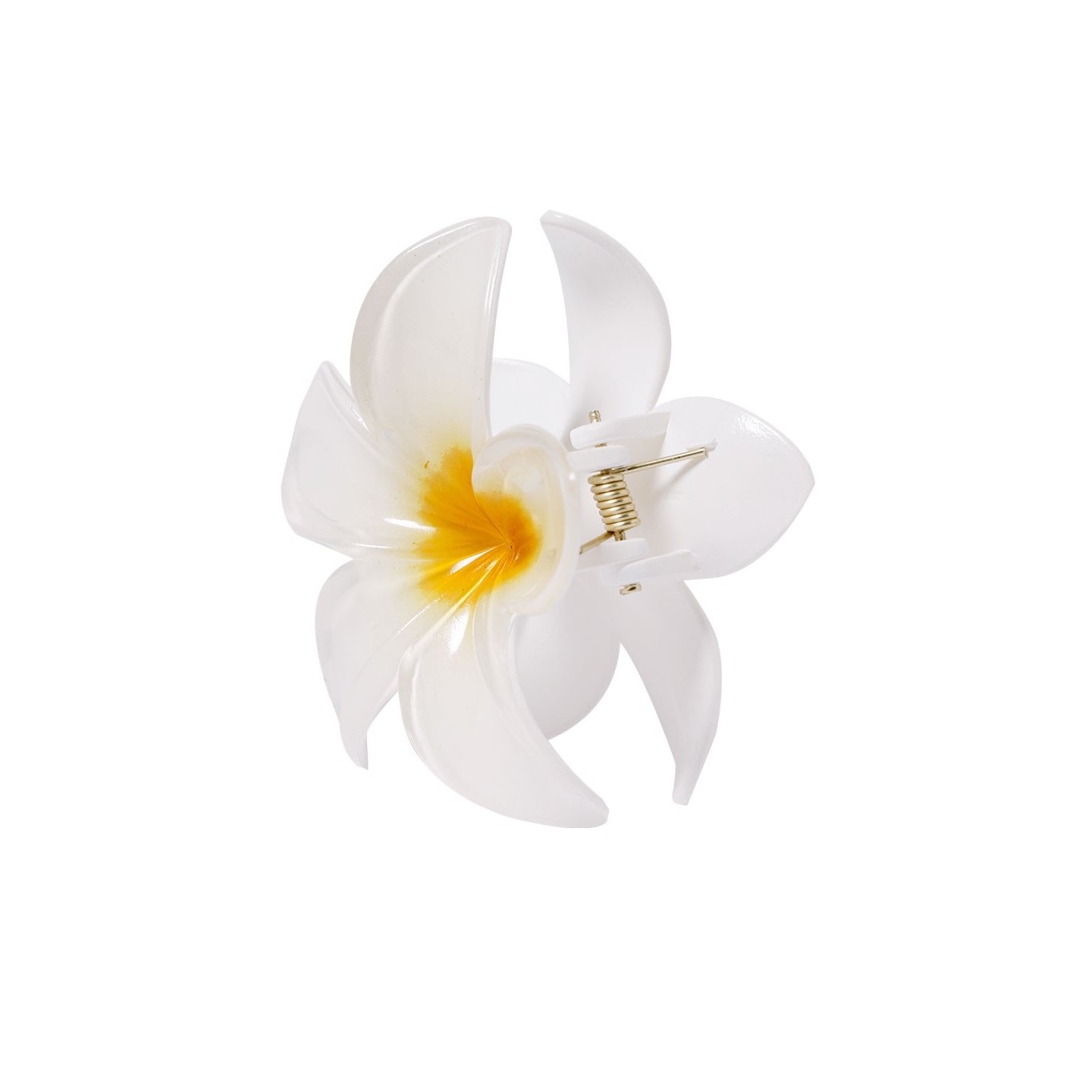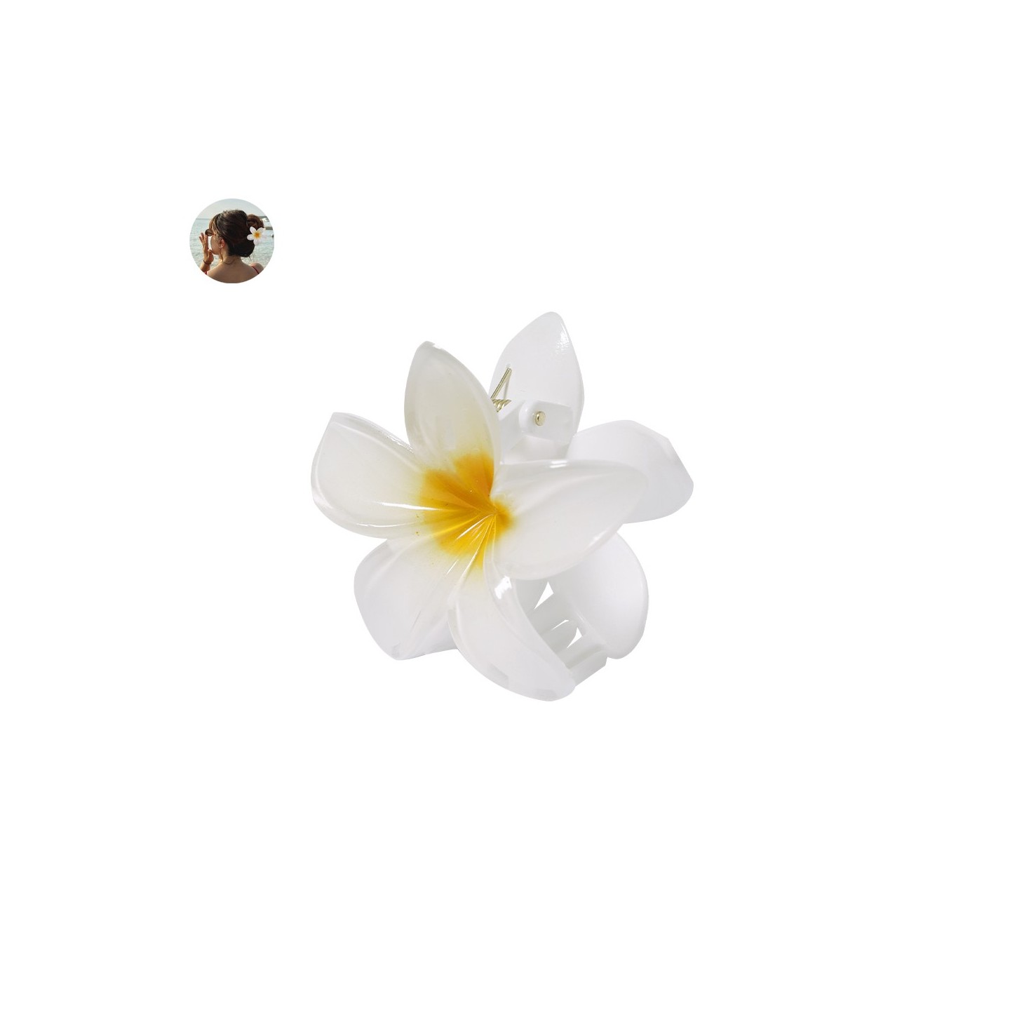 Pinza TIXCON con diseño de flor anémona japonesa, pétalos blancos y centro amarillo. Con 8 dientes para una sujeción segura. Personalizable con logotipo.
