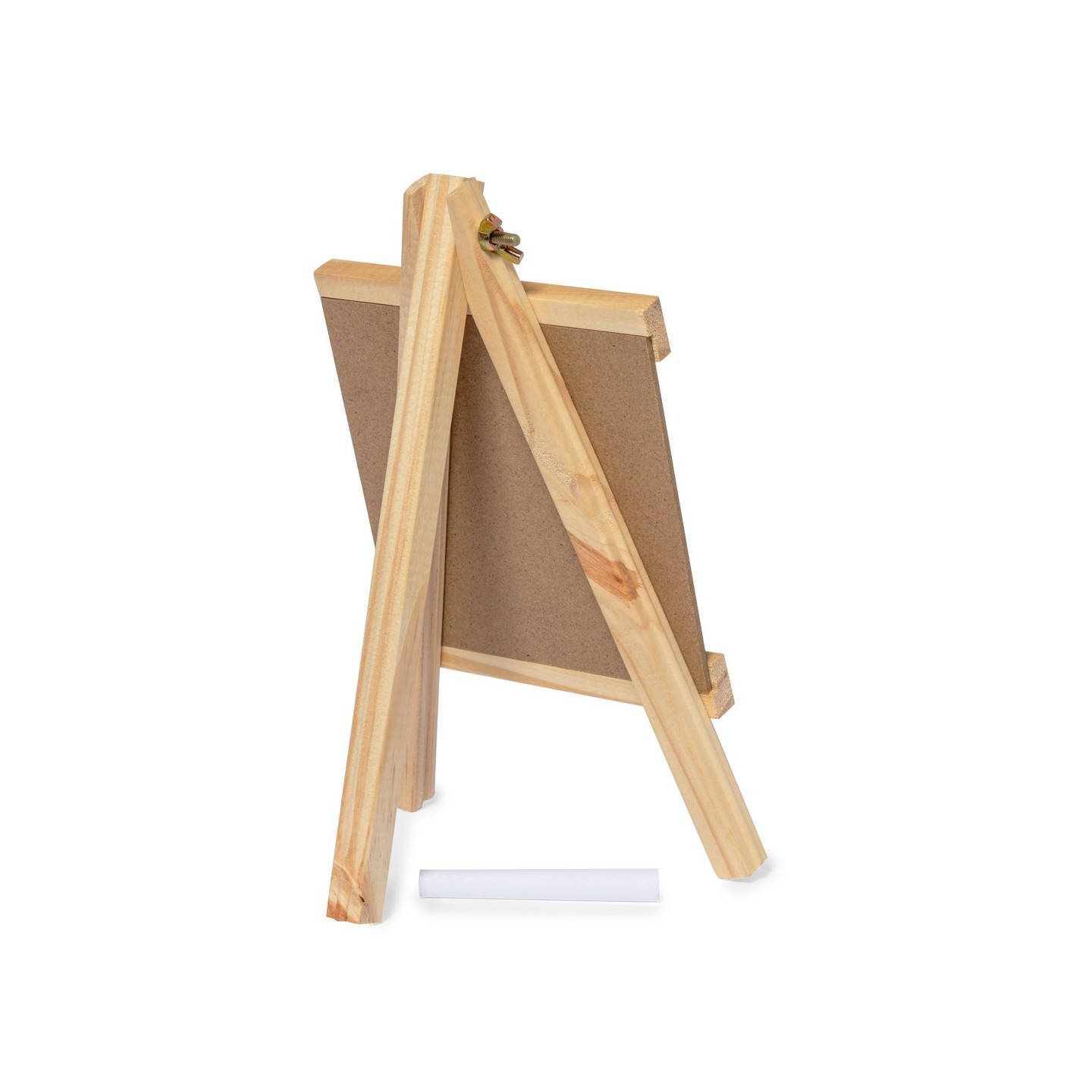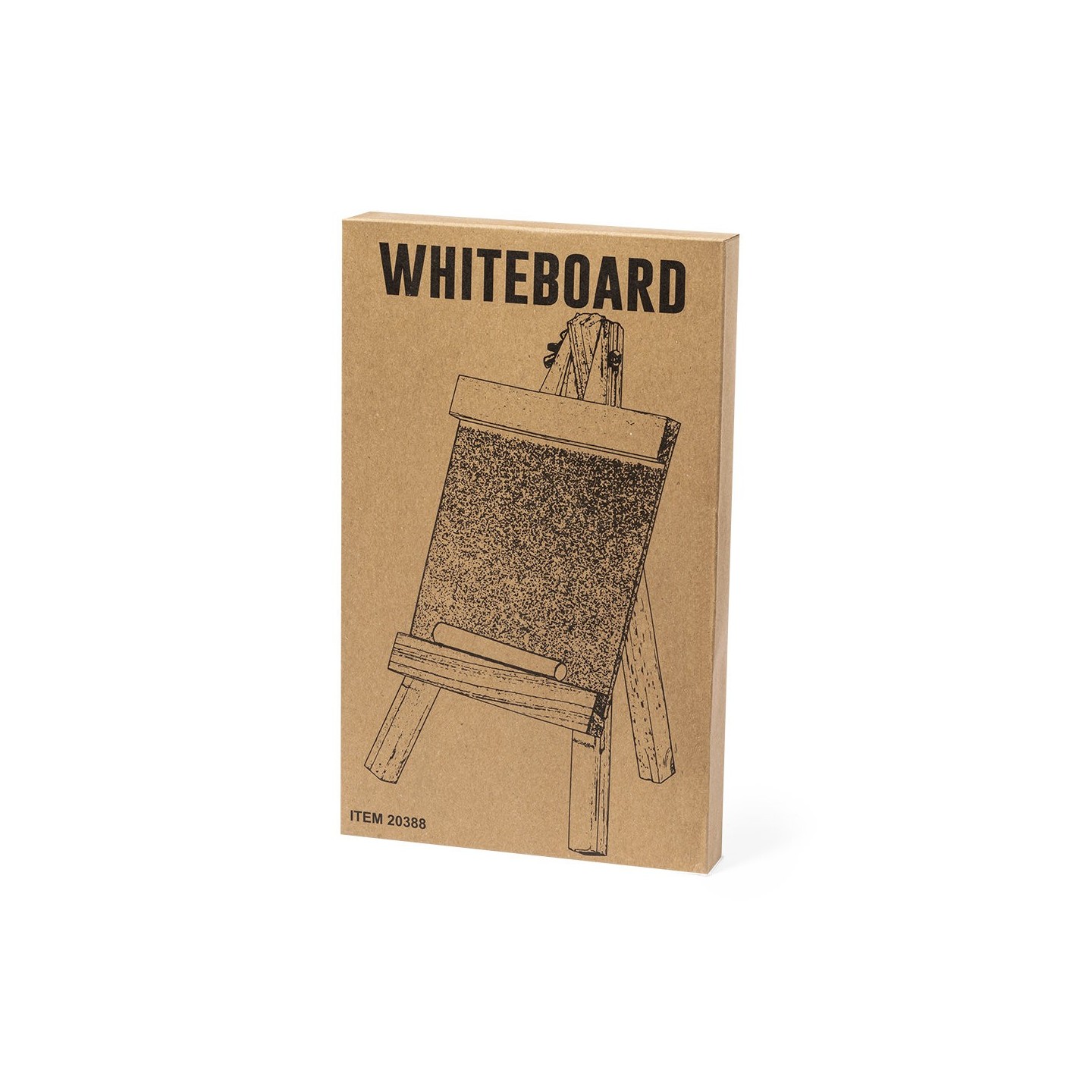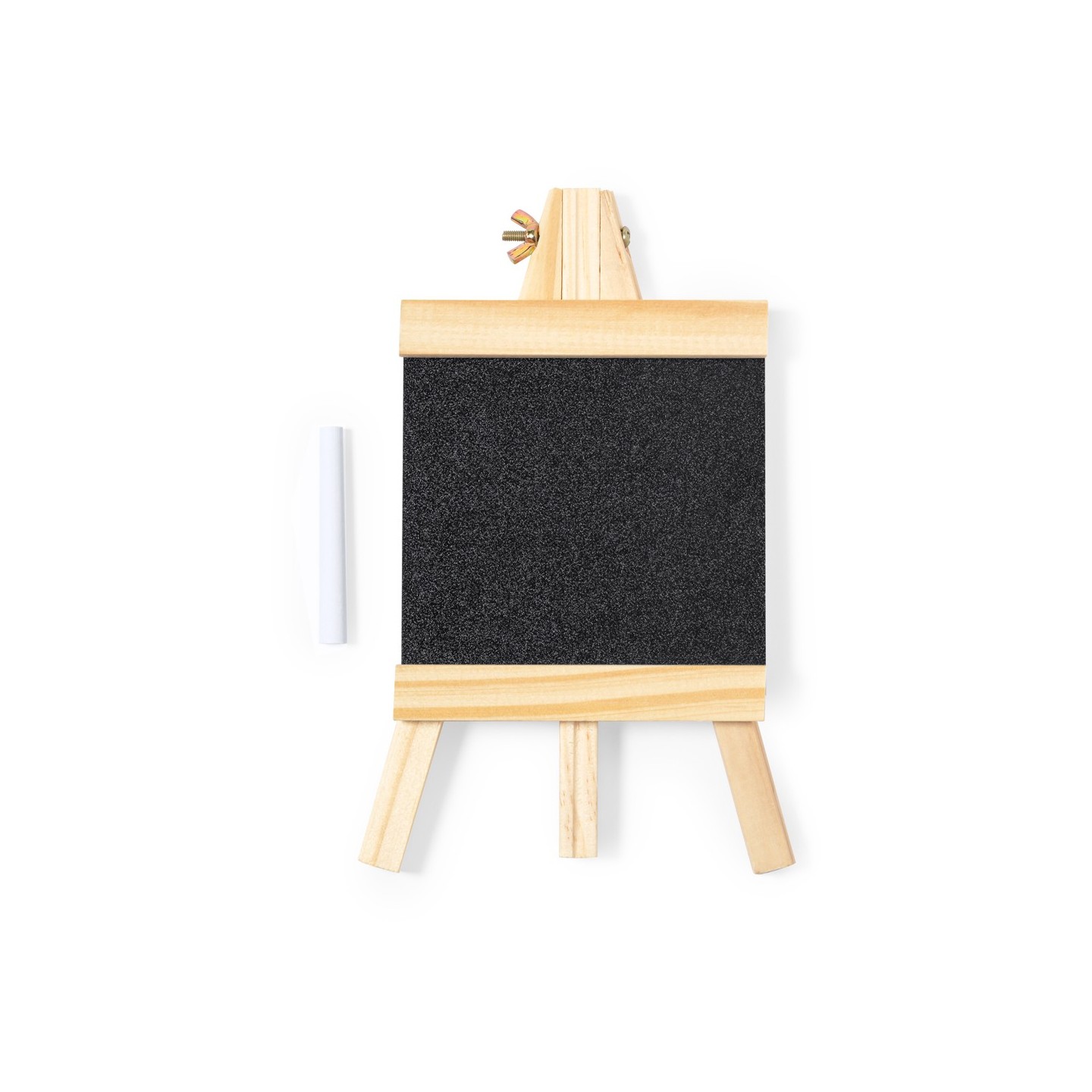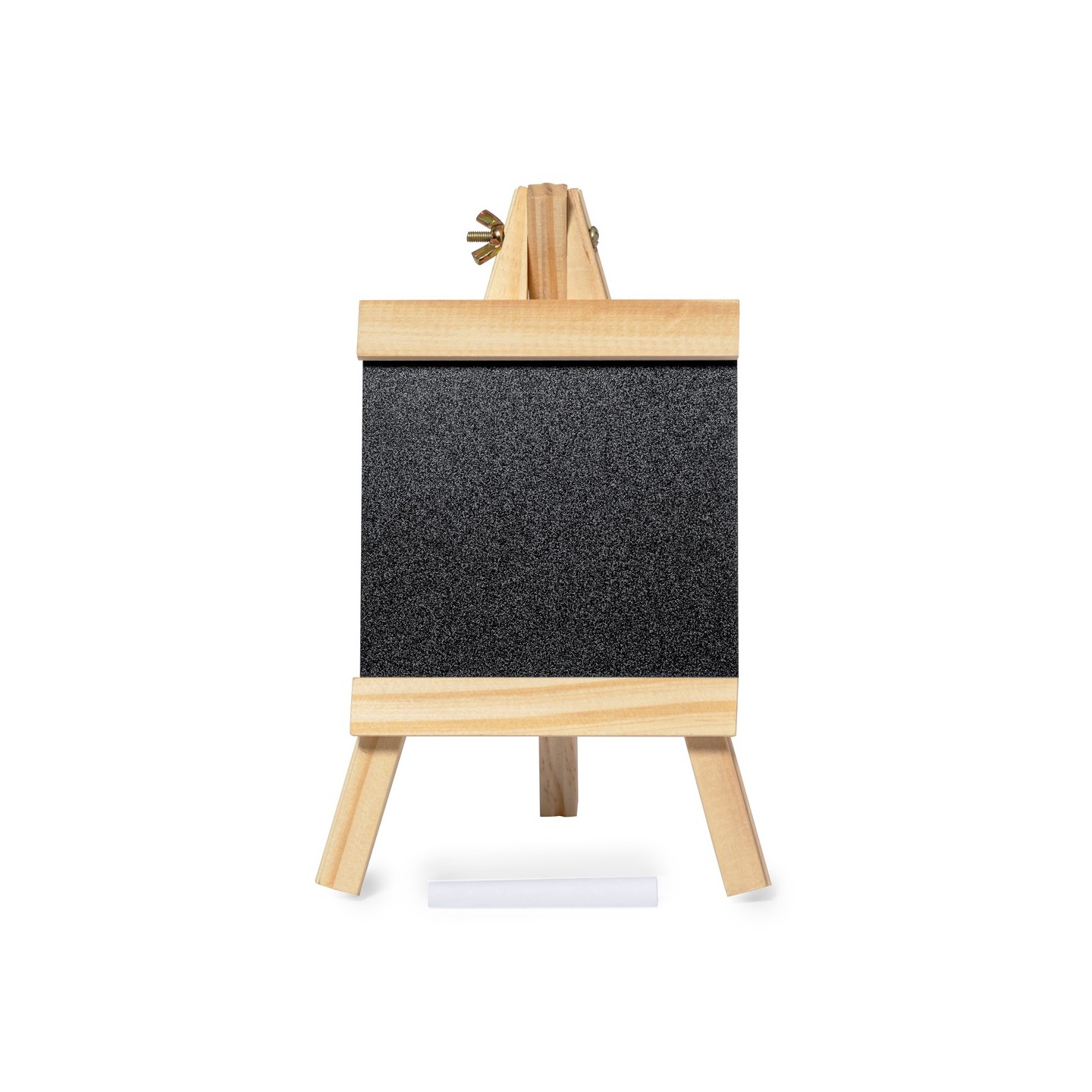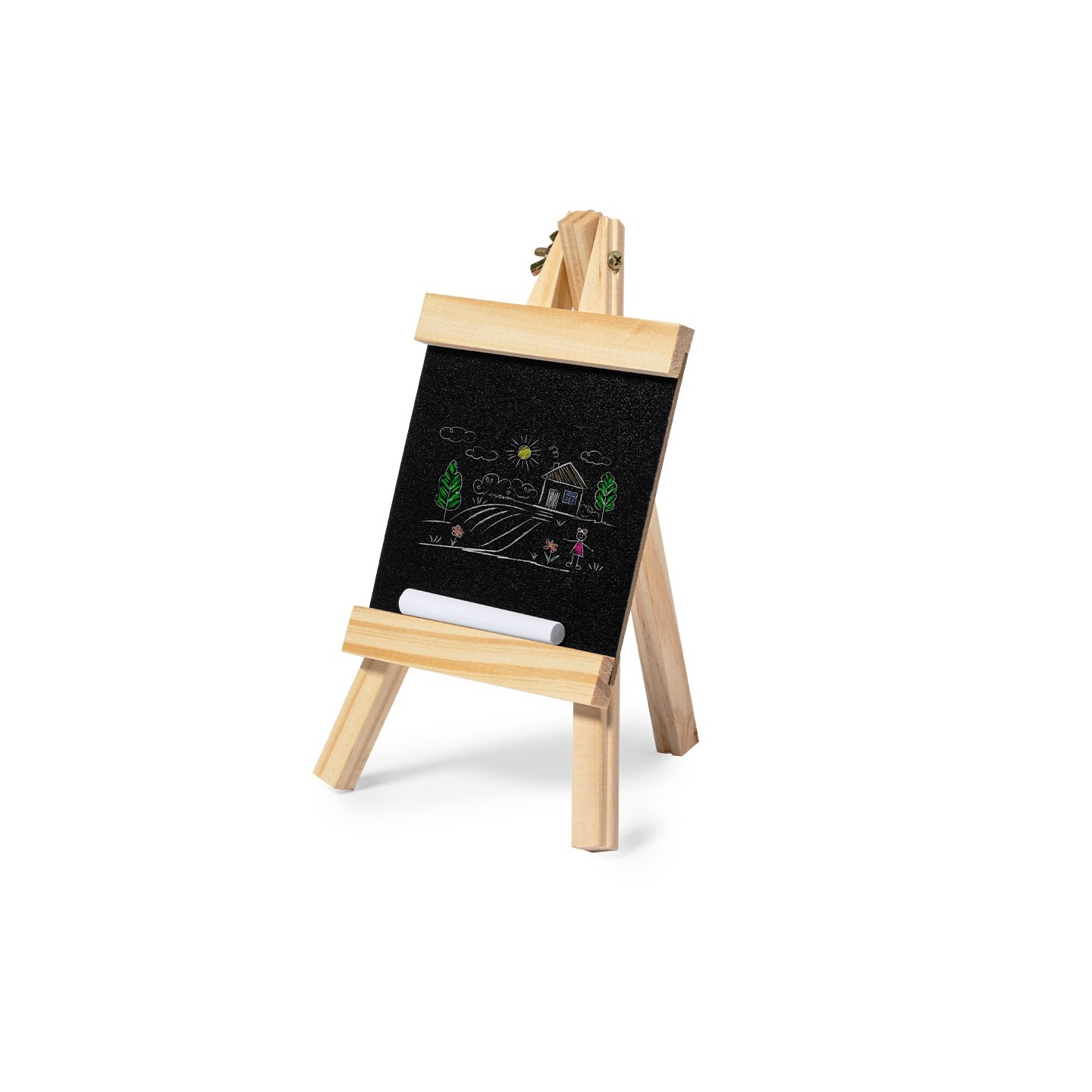 Atril de madera con pizarra y tiza incluida, presentado en caja kraft. Personalizable con su logo. Ideal como regalo o herramienta de comunicación.