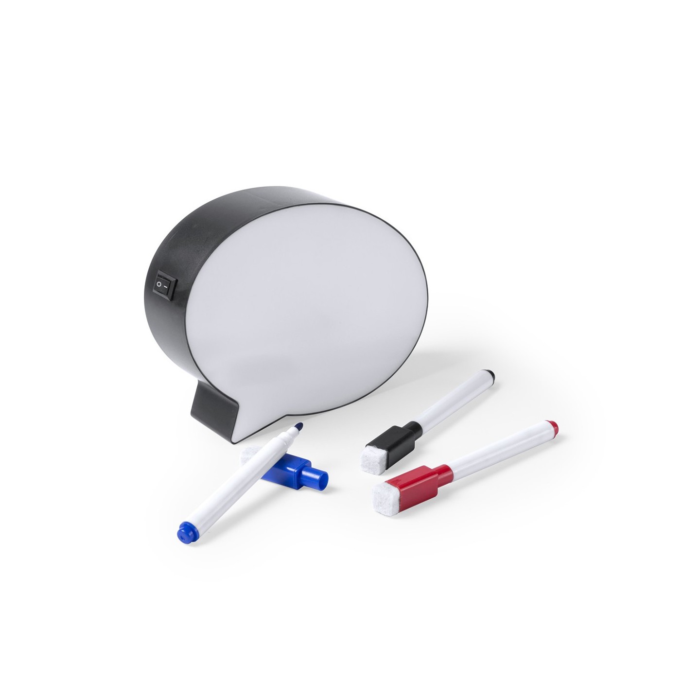 Incluye un botón de encendido/apagado para controlar la iluminación. Además, viene con tres rotuladores (azul, negro y rojo) que cuentan con un borrador incorporado, facilitando la escritura y corrección de tus mensajes.