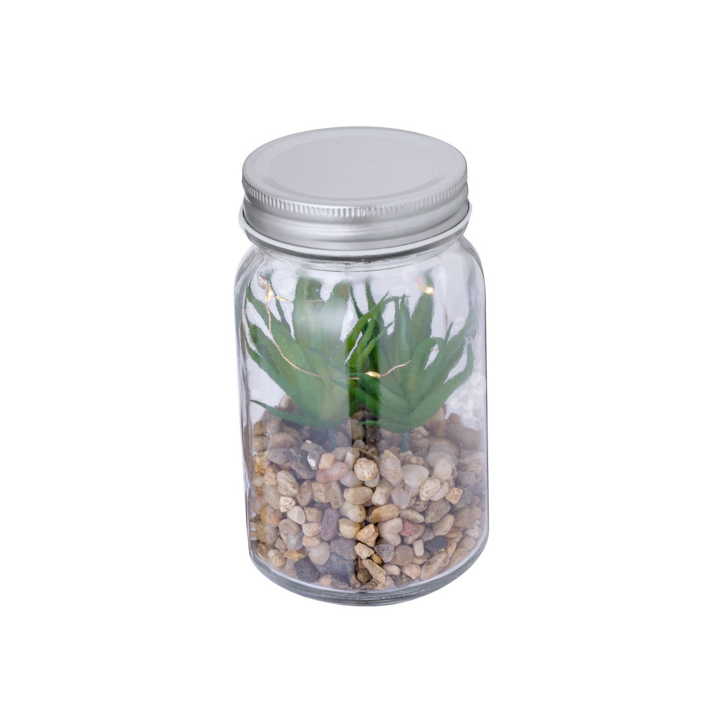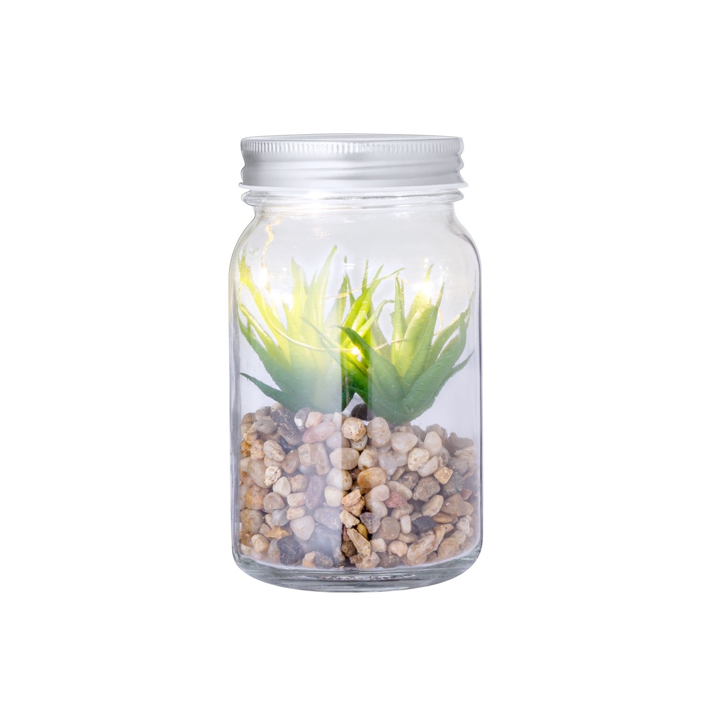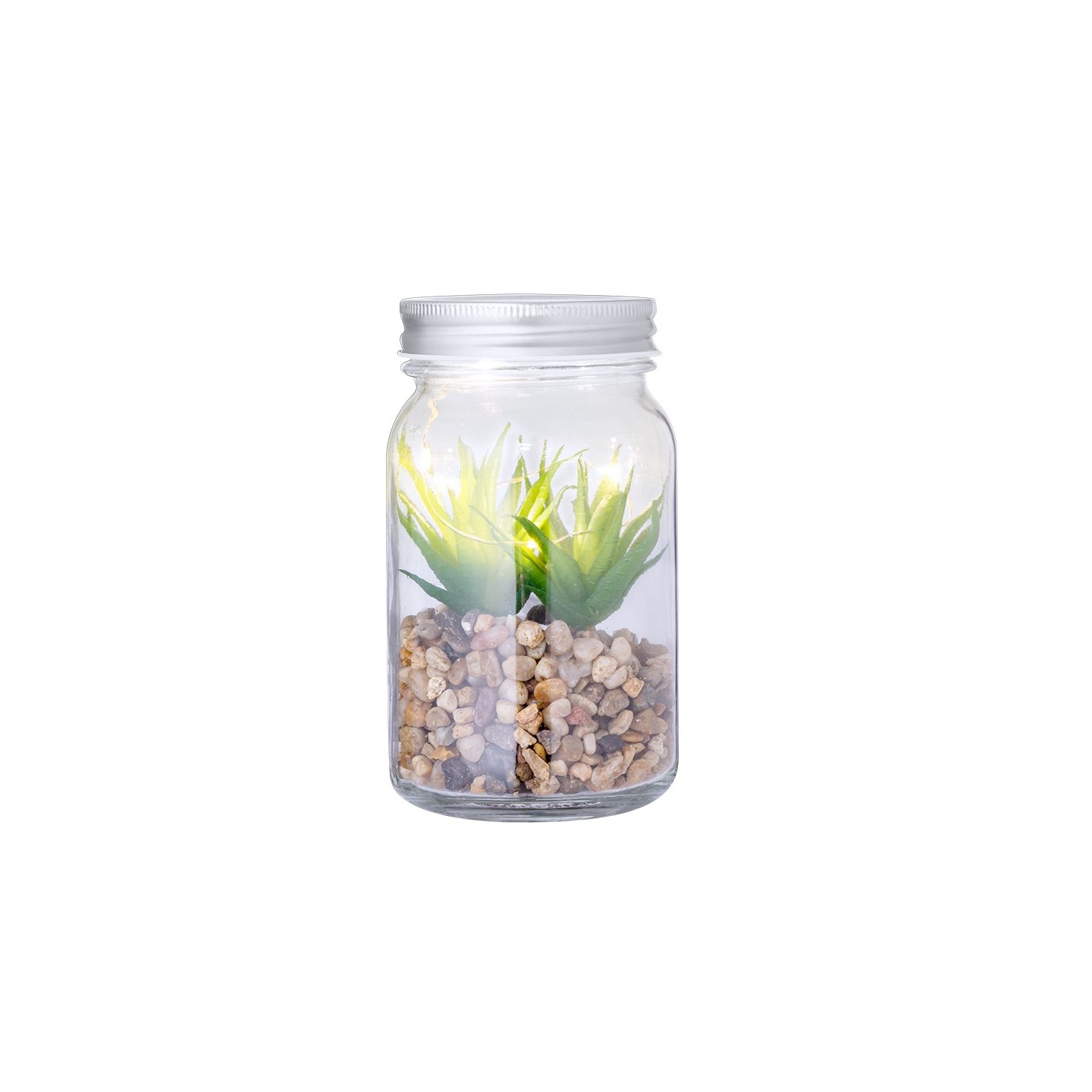 Pon un toque de naturaleza en tu espacio con la Planta Decorativa Kyala en tarro de cristal. Iluminada por LEDs, ideal para regalos personalizados.