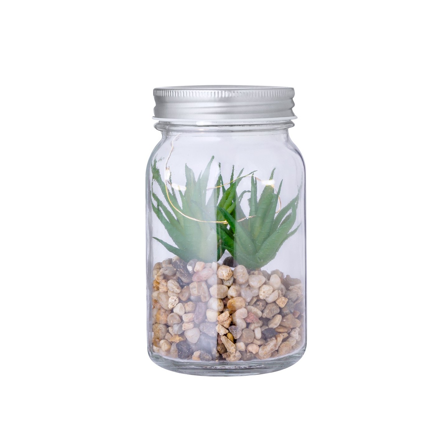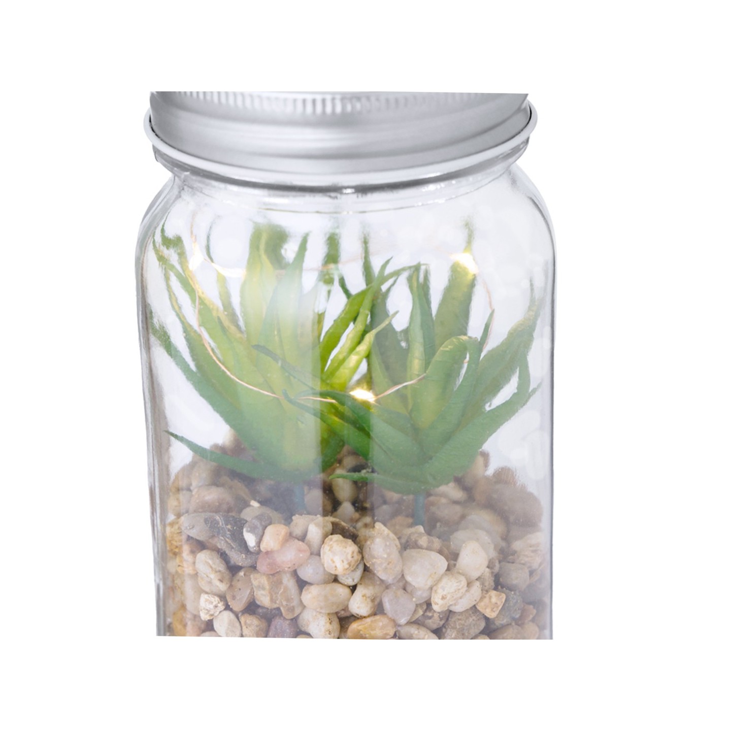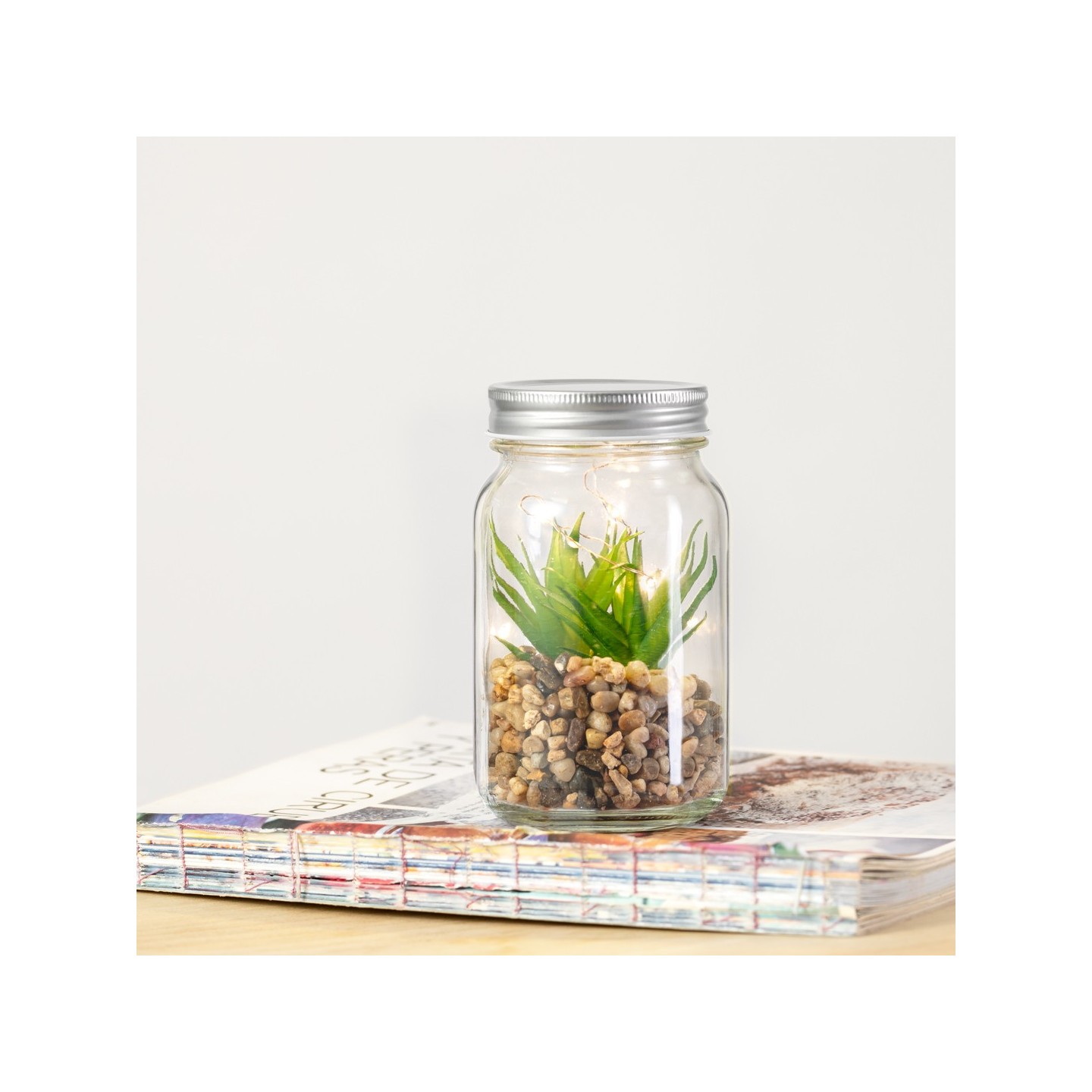 Pon un toque de naturaleza en tu espacio con la Planta Decorativa Kyala en tarro de cristal. Iluminada por LEDs, ideal para regalos personalizados.