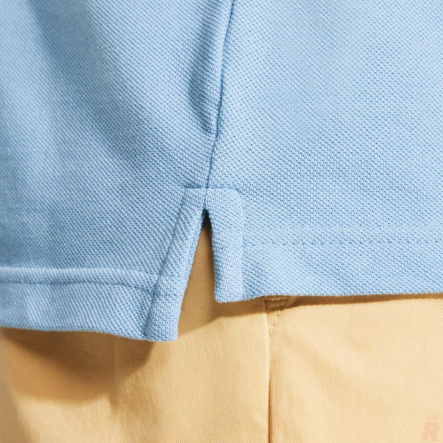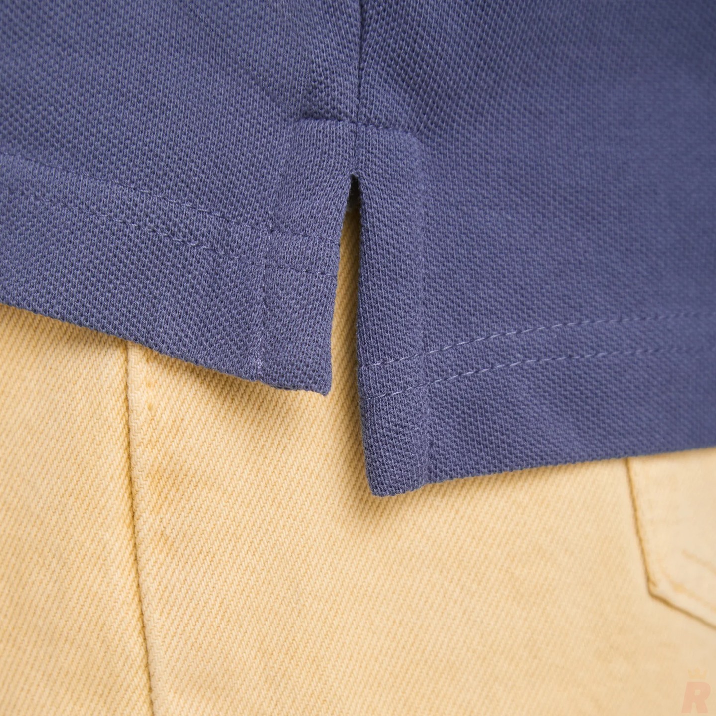 Su cuello clásico de canalé con tapeta reforzada de tres botones a tono añade un toque profesional, mientras que las mangas cortas con ribete acanalado aseguran un ajuste cómodo sin perder estilo. Las aperturas laterales con cubrecosturas a tono mejoran la movilidad y ventilación, ideales para entornos laborales activos.