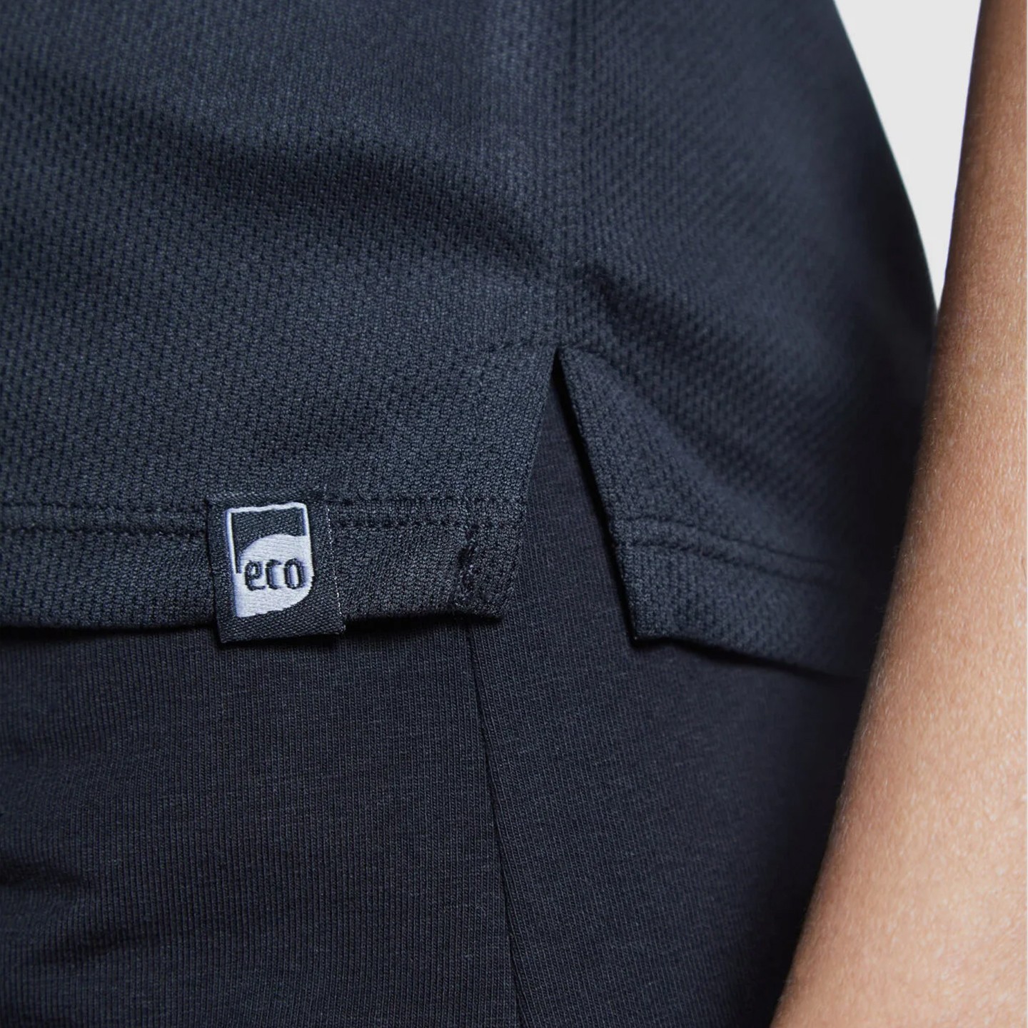 Dispone de cuello canalé 1x1 con tapeta de dos botones automáticos, mangas ribeteadas y aperturas laterales en el bajo para mayor libertad de movimiento. Además, incluye cubrecosturas reforzado en cuello y distintivo ECO en el exterior, destacando su compromiso con la sostenibilidad.