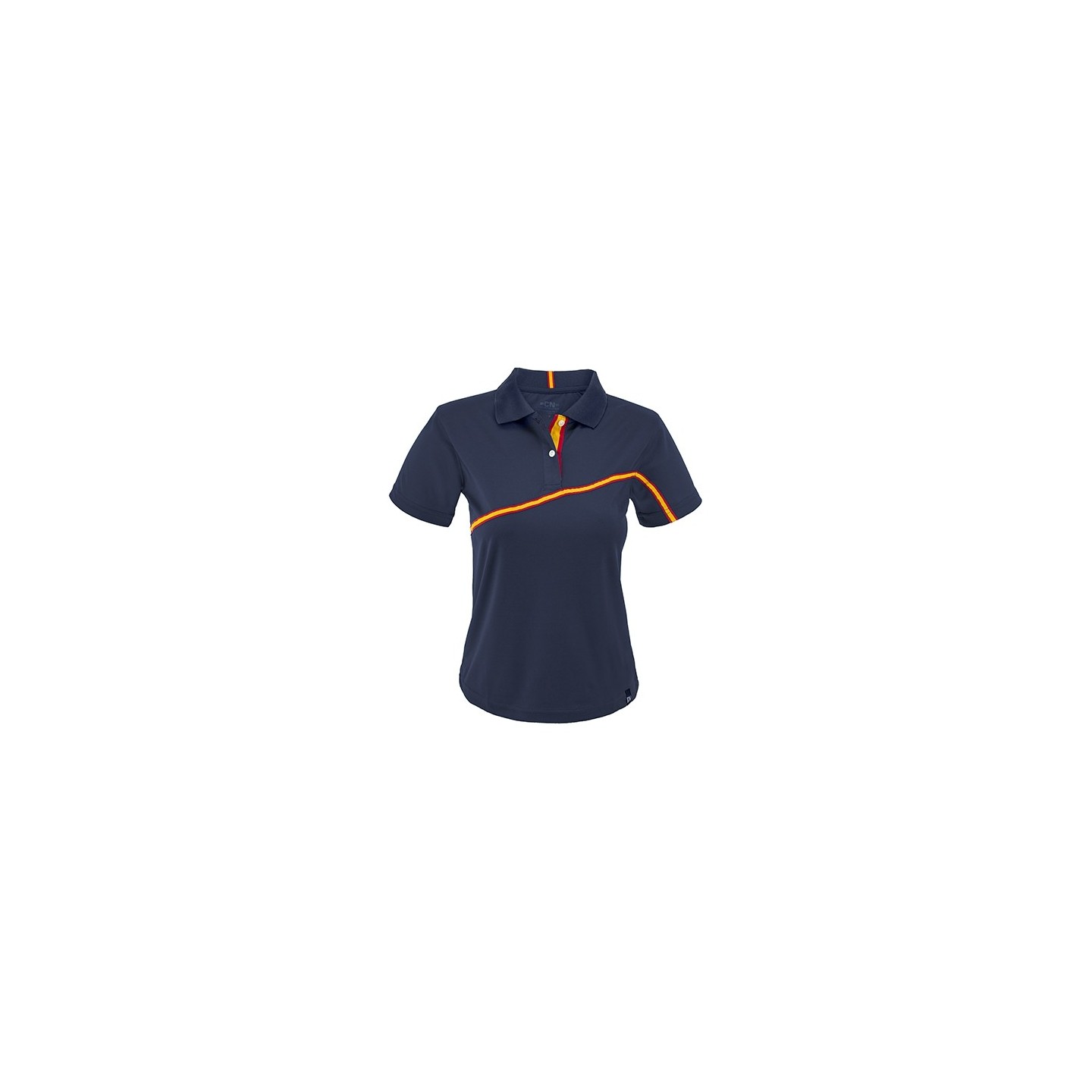 Polo técnico para mujer en poliéster transpirable con detalles de la bandera de España. Diseño cómodo y ligero, ideal para eventos y merchandising
