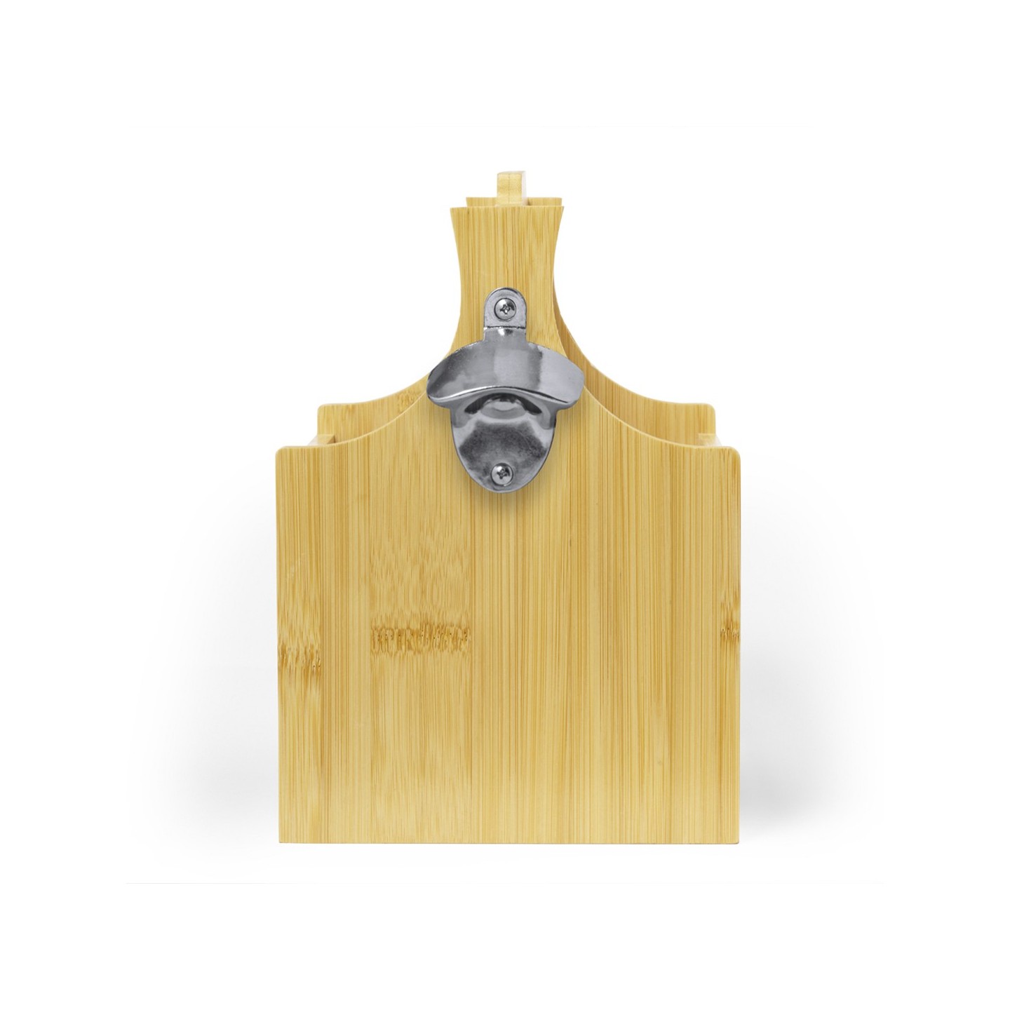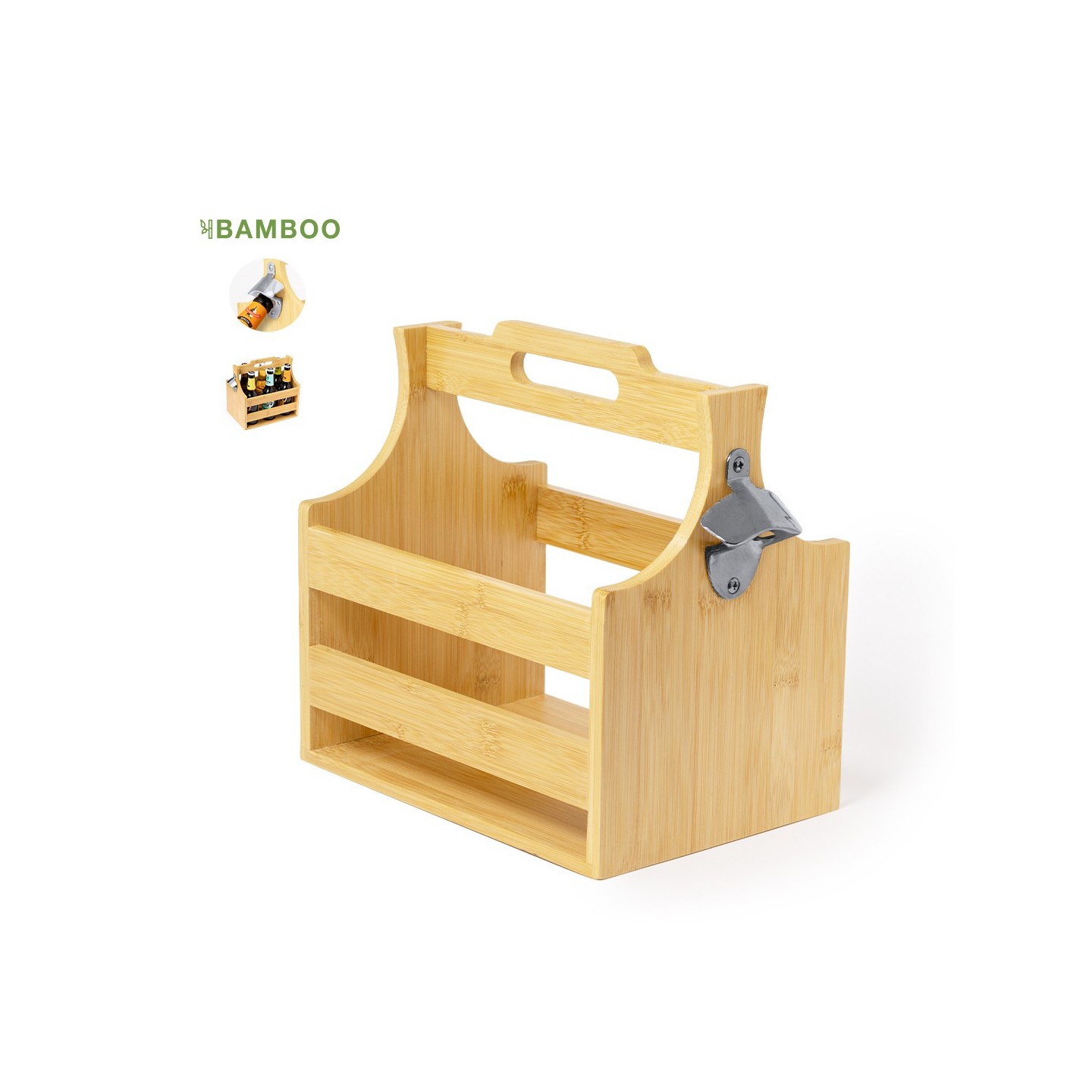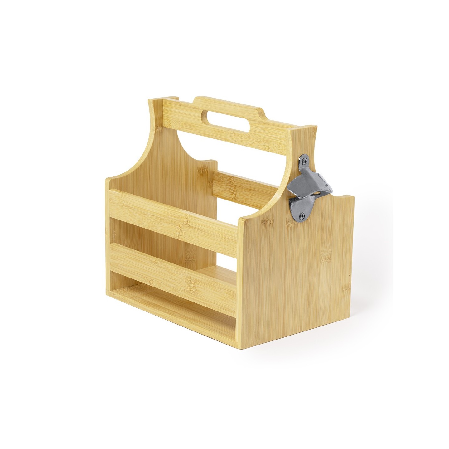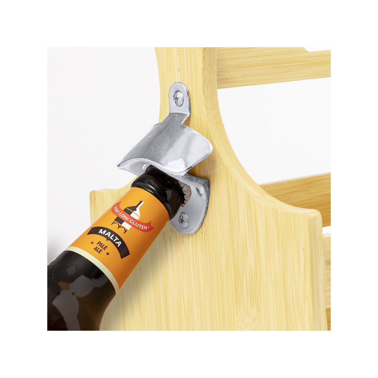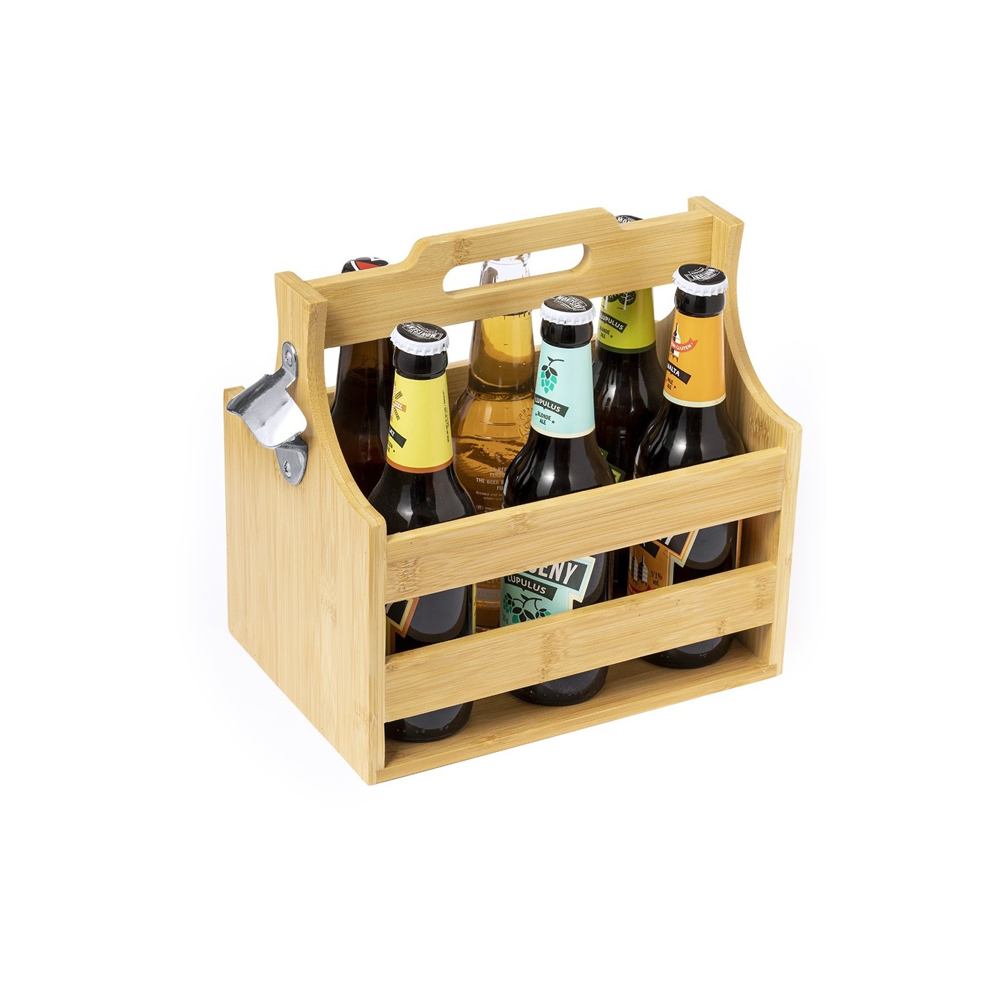 El Portabotellas Voxen es un práctico soporte de bambú para 6 botellines, con abridor integrado. Ideal para llevar tus bebidas con estilo.