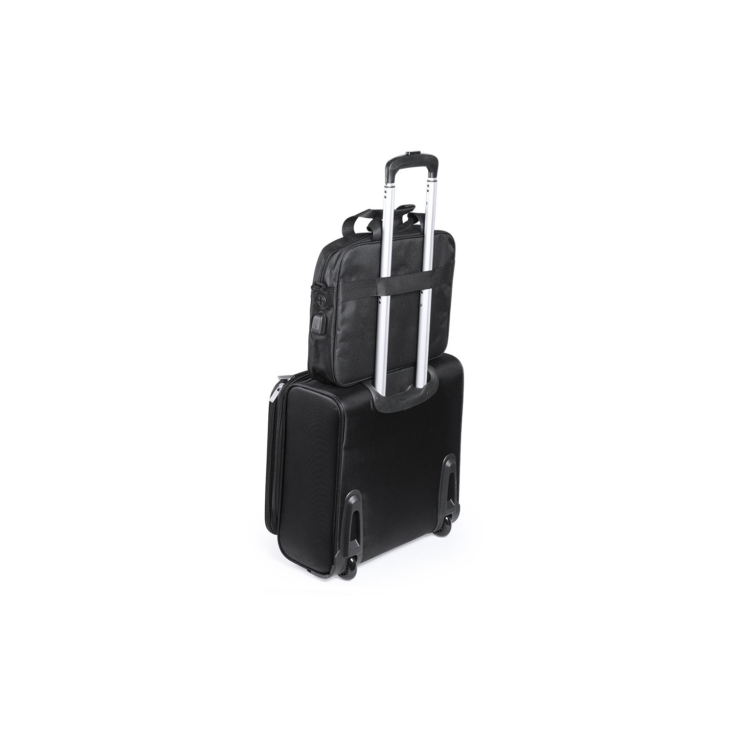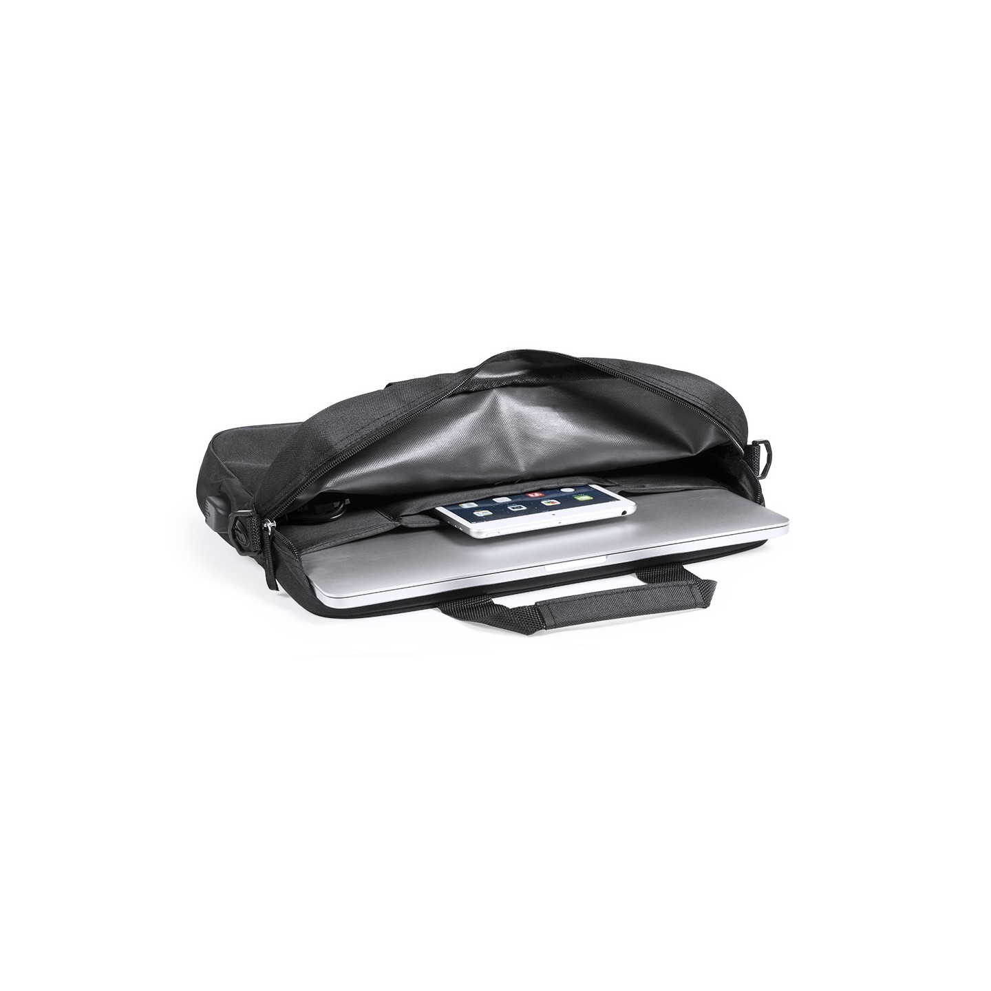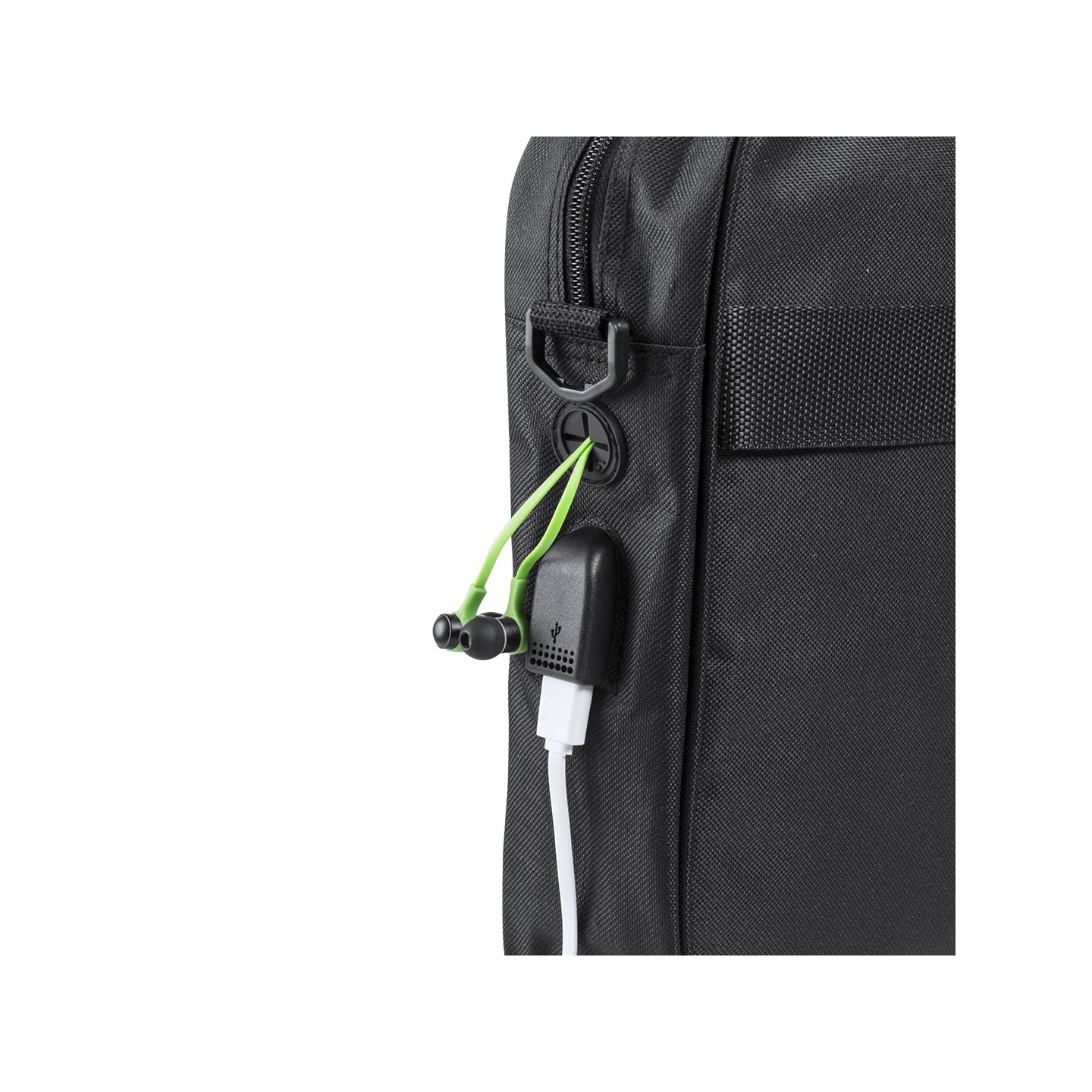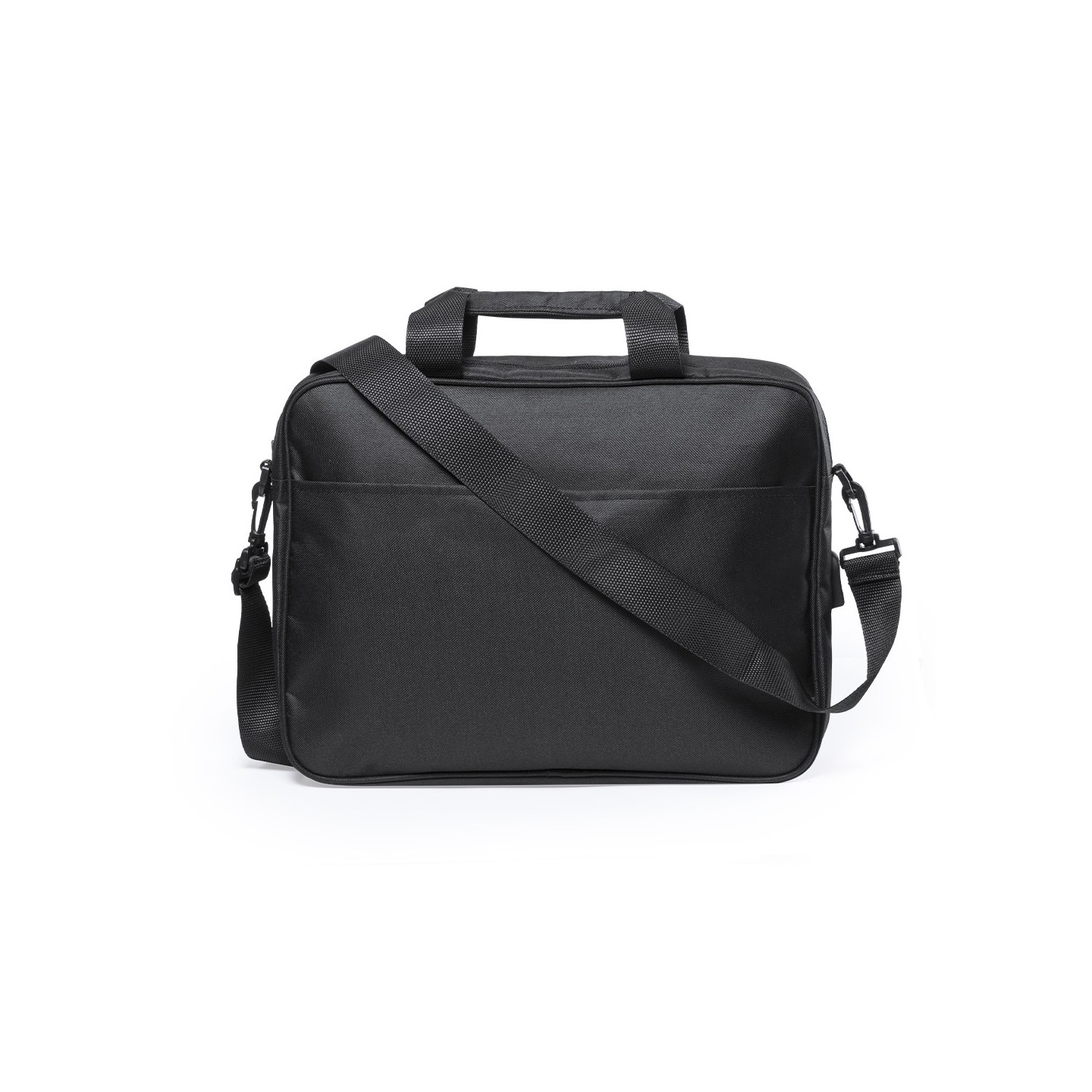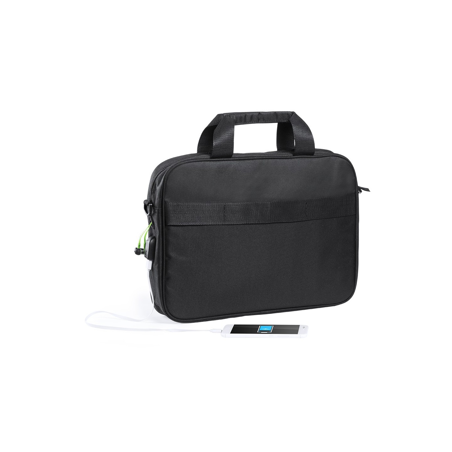Organiza tus documentos y gadgets con el portadocumentos Baldony en poliéster 600D. Incluye compartimento acolchado para laptop, conexión USB y salida para auriculares. Asas reforzadas y cinta bandolera ajustable.