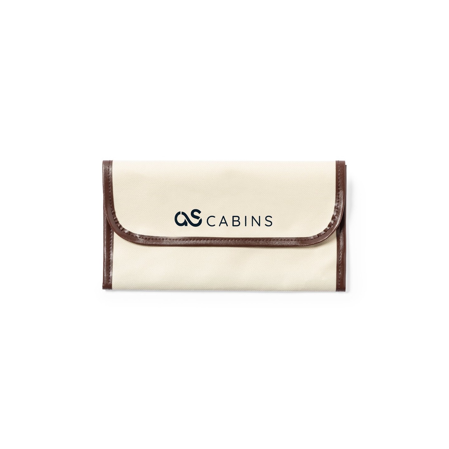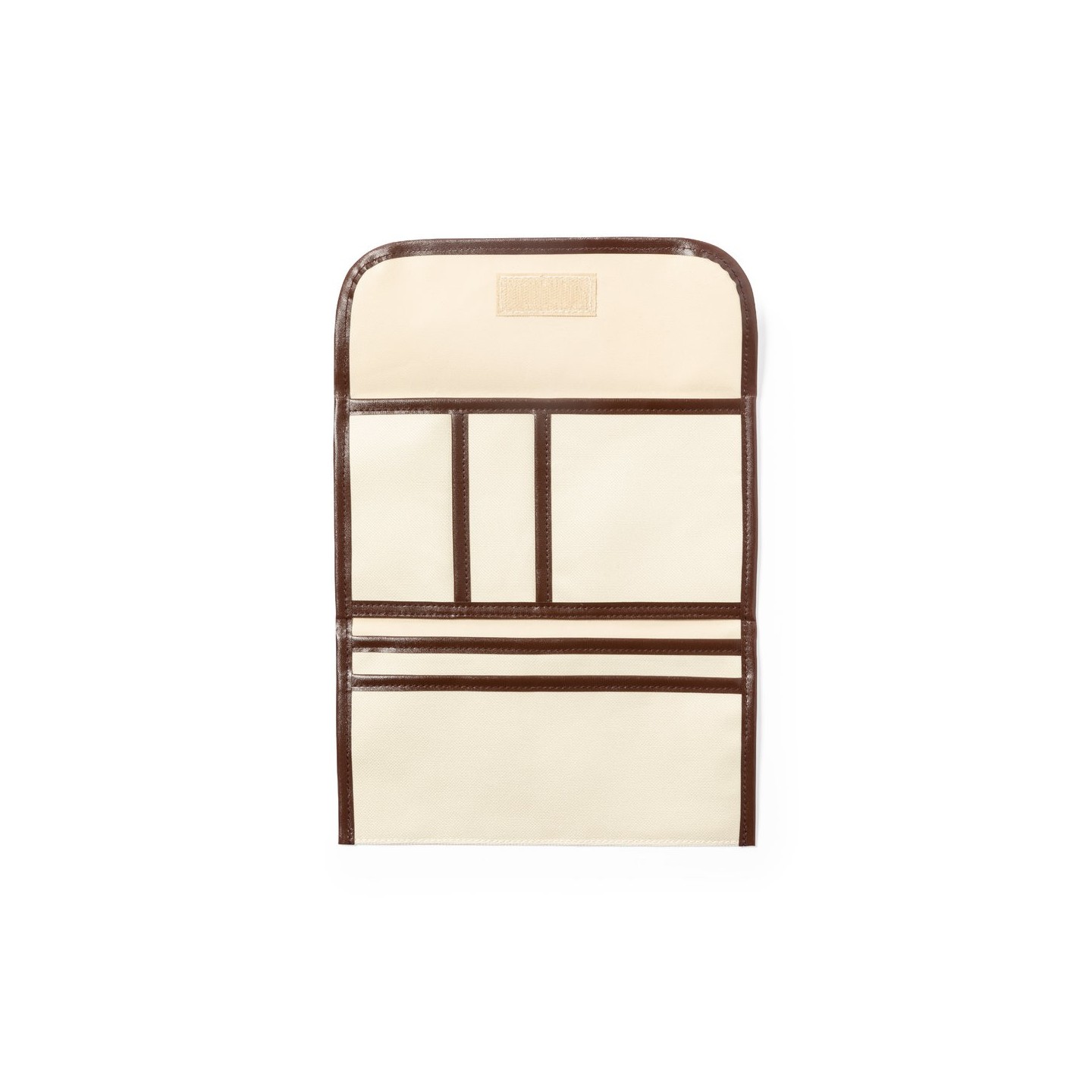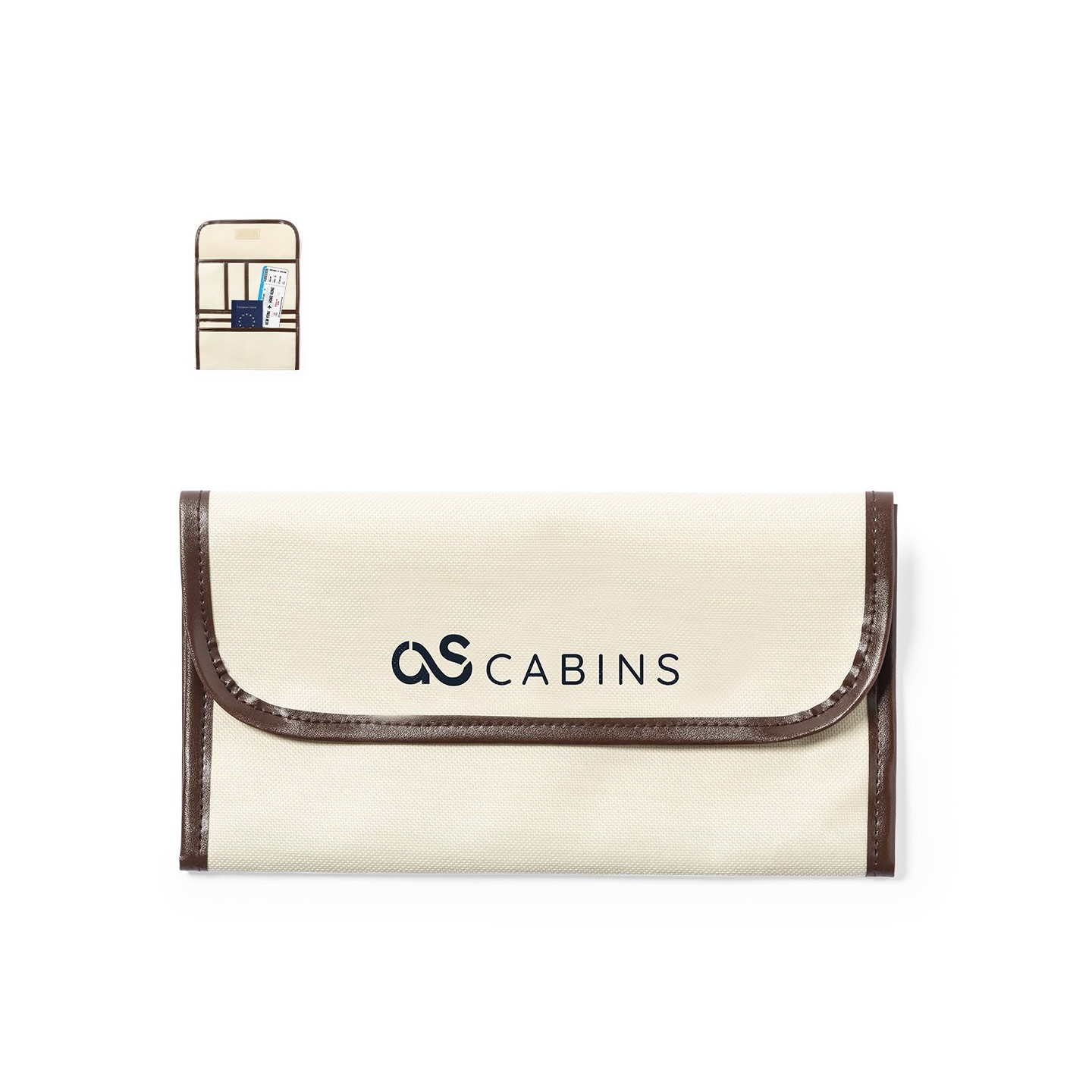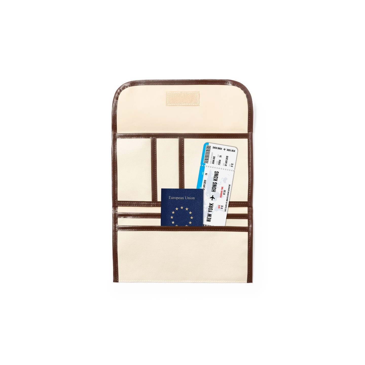 Organiza tus documentos de viaje con estilo gracias al portadocumentos Farrel. Fabricado en poliéster 600D con ribetes en polipiel marrón, cuenta con solapa de velcro y múltiples compartimentos interiores.