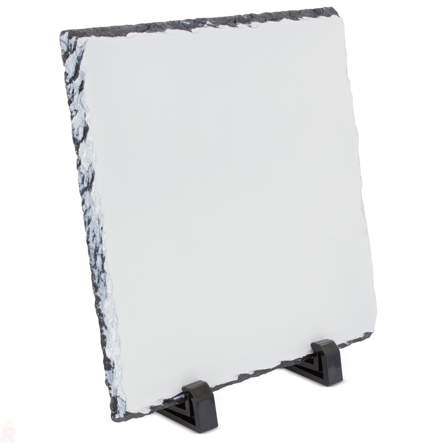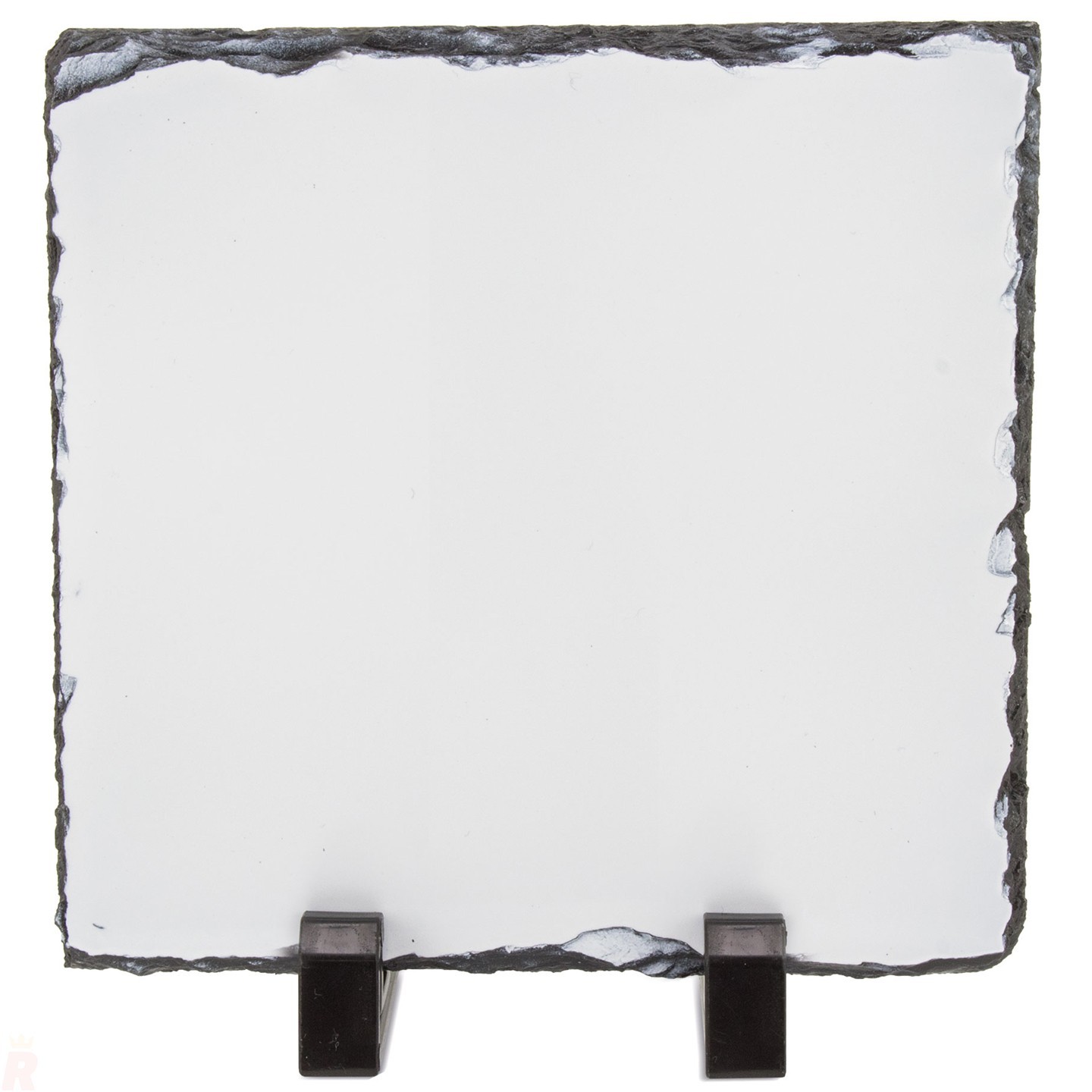 Portafotos de pizarra en formato cuadrado, ideal para sublimación. Personalizable a todo color, incluye soporte y caja individual. Diseño elegante y versátil