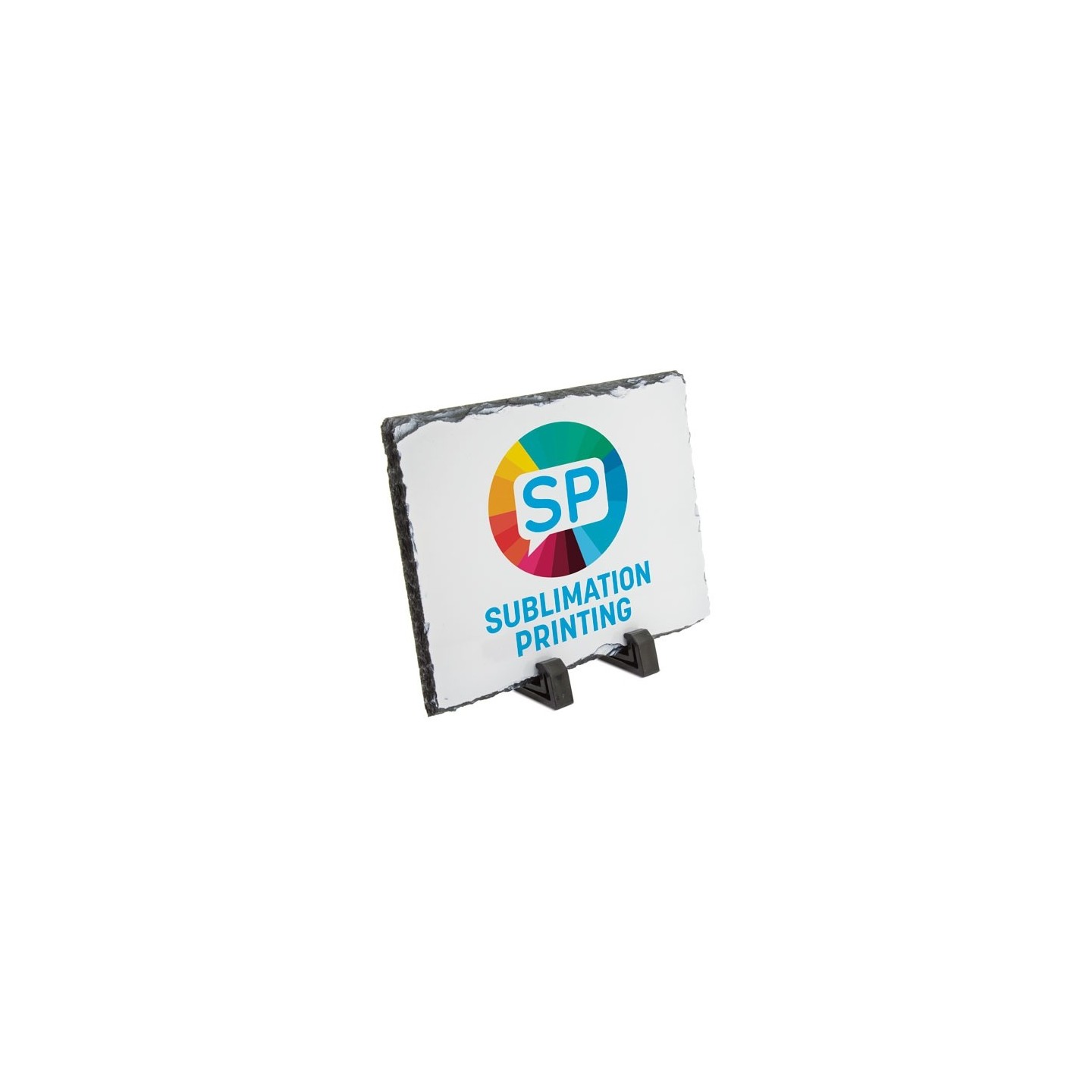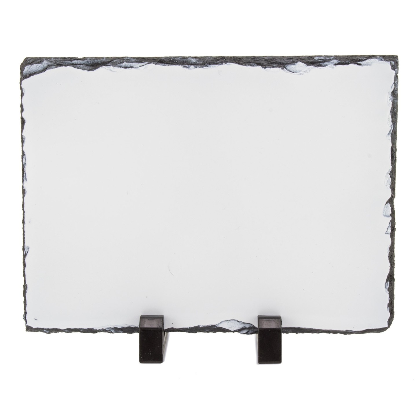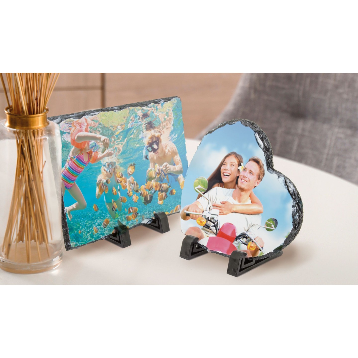 Portafotos de pizarra personalizable por sublimación, con un diseño elegante y rústico. Incluye soporte y caja individual. Disponible en varios modelos