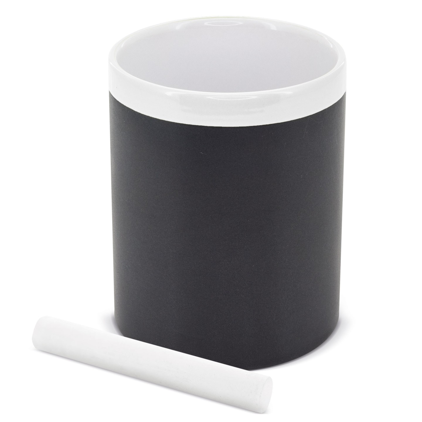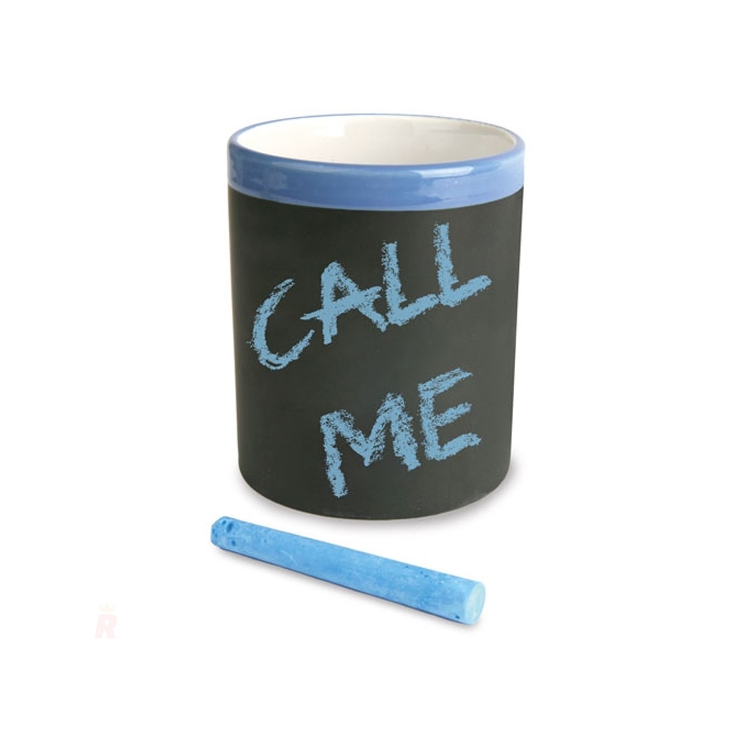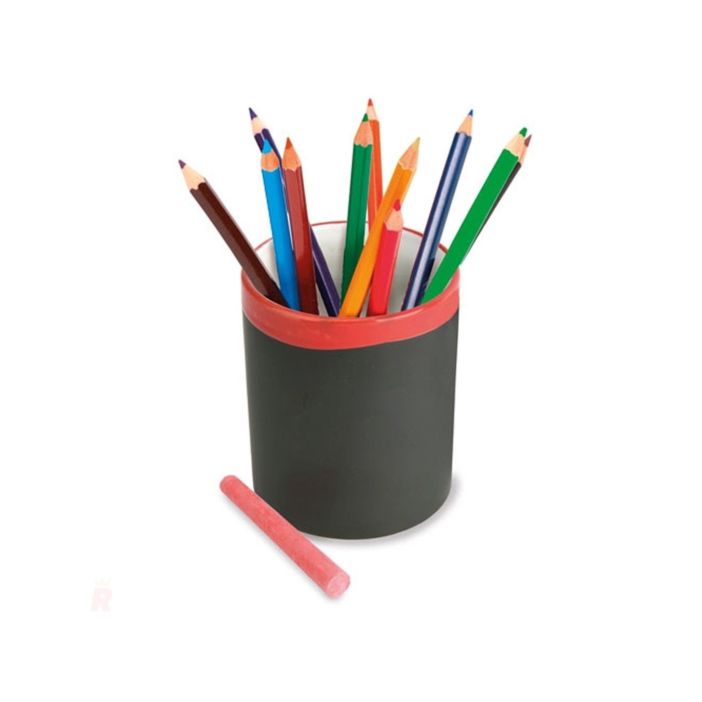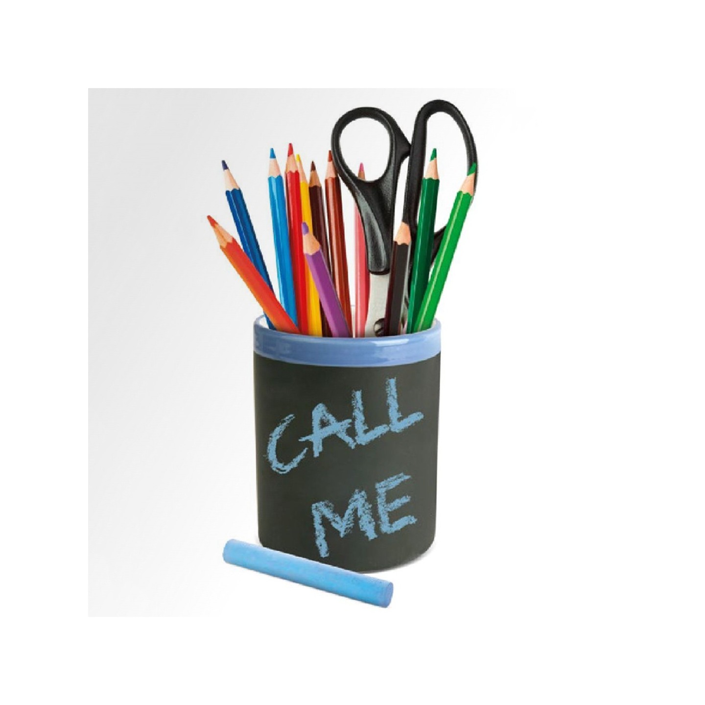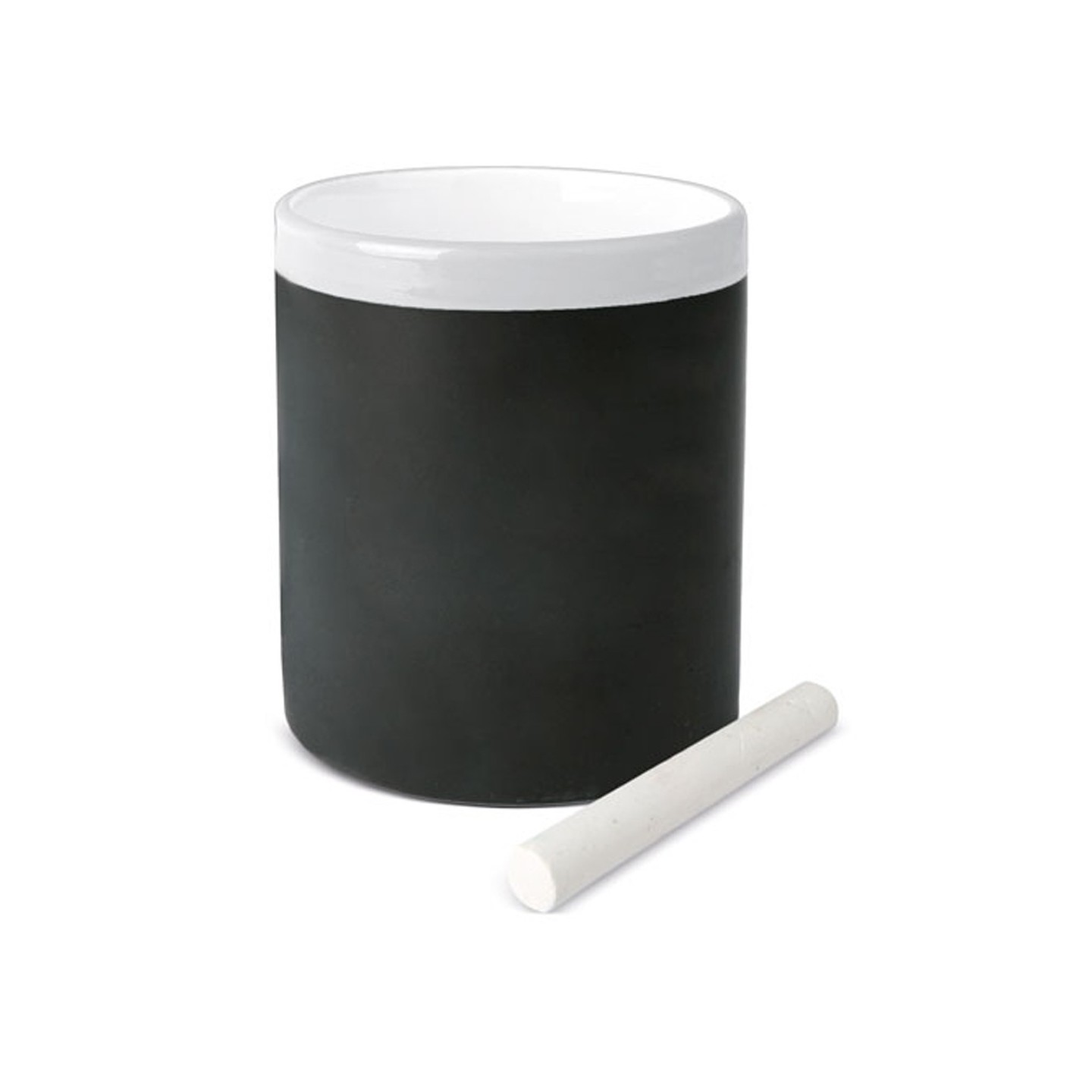 Portalapicero de cerámica con pizarra para dibujar o escribir. Incluye tiza a juego y está disponible en blanco, rojo, azul y verde. Funcional y creativo