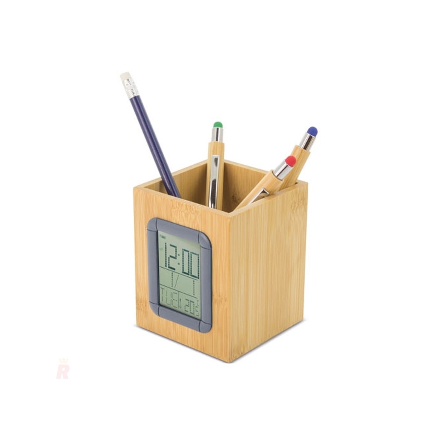 Portalápices ecológico de bambú con estación meteorológica integrada. Funciones: temperatura, alarma, hora y calendario. Incluye pilas (2 LR1130). Medidas: 7.5 x 7.5 x 9.5 cm. Personalizable con el logotipo de tu empresa.